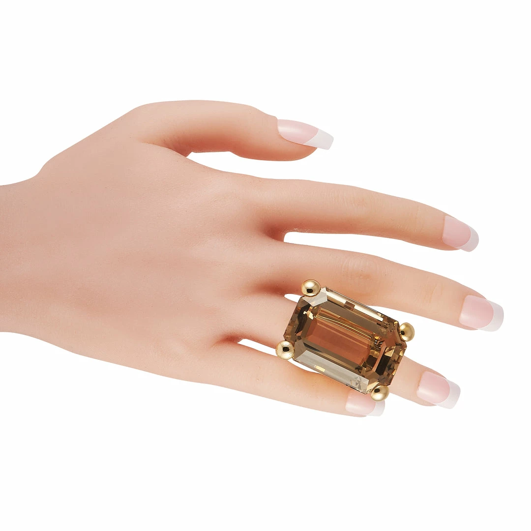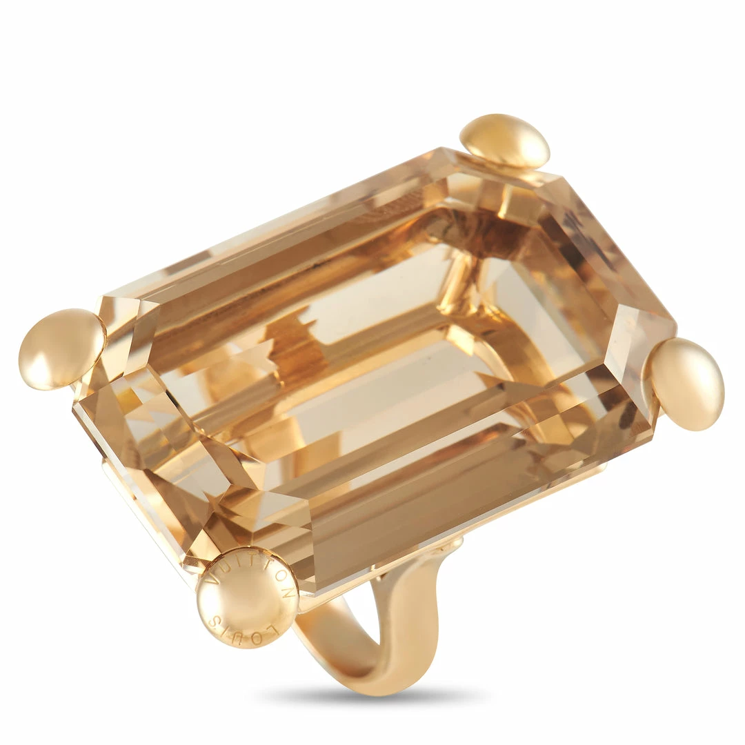 This eye-catching ring from Louis Vuitton is impossible to ignore. Perched atop the 18K Rose Gold setting โ which features a delicate 4mm wide band โ youโll find a breathtaking emerald-cut smoky quartz center stone. A top height measuring 18mm makes this a dramatic addition to any ensemble.