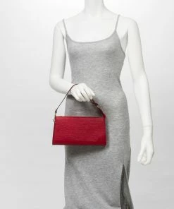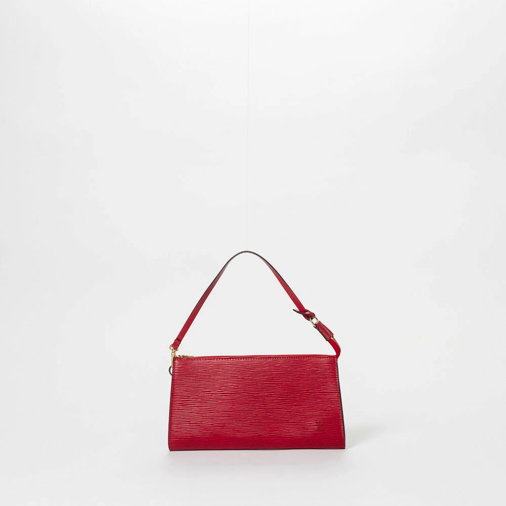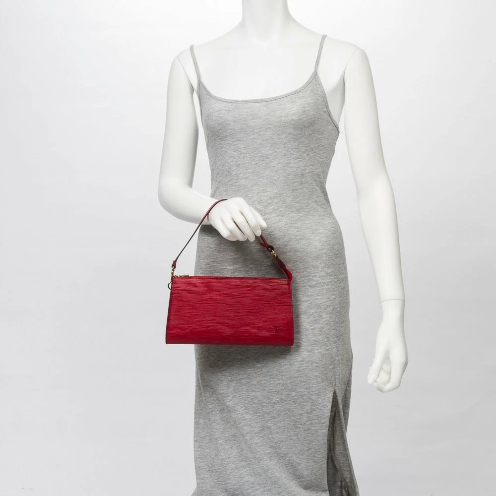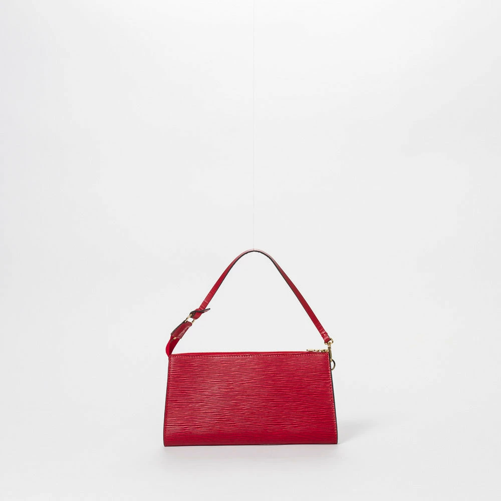 Louis Vuitton Pouch in Red Epi and Golden Brass hardware. Dimensions – 24*13*2cm. Serial number – AR0053 (May 2003). Inclusions – Box, Dustbag.