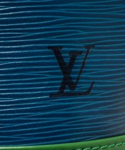 Louis Vuitton bi-colored epi leather Noe shoulder bag with blue epi leather exterior with green epi leather adjustable shoulder strap and trims, blue suede lining, gold-tone hardware, drawstring closure, and one main compartment.