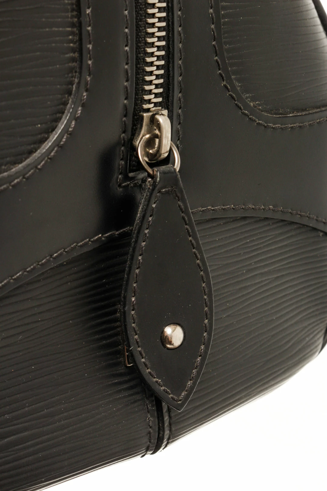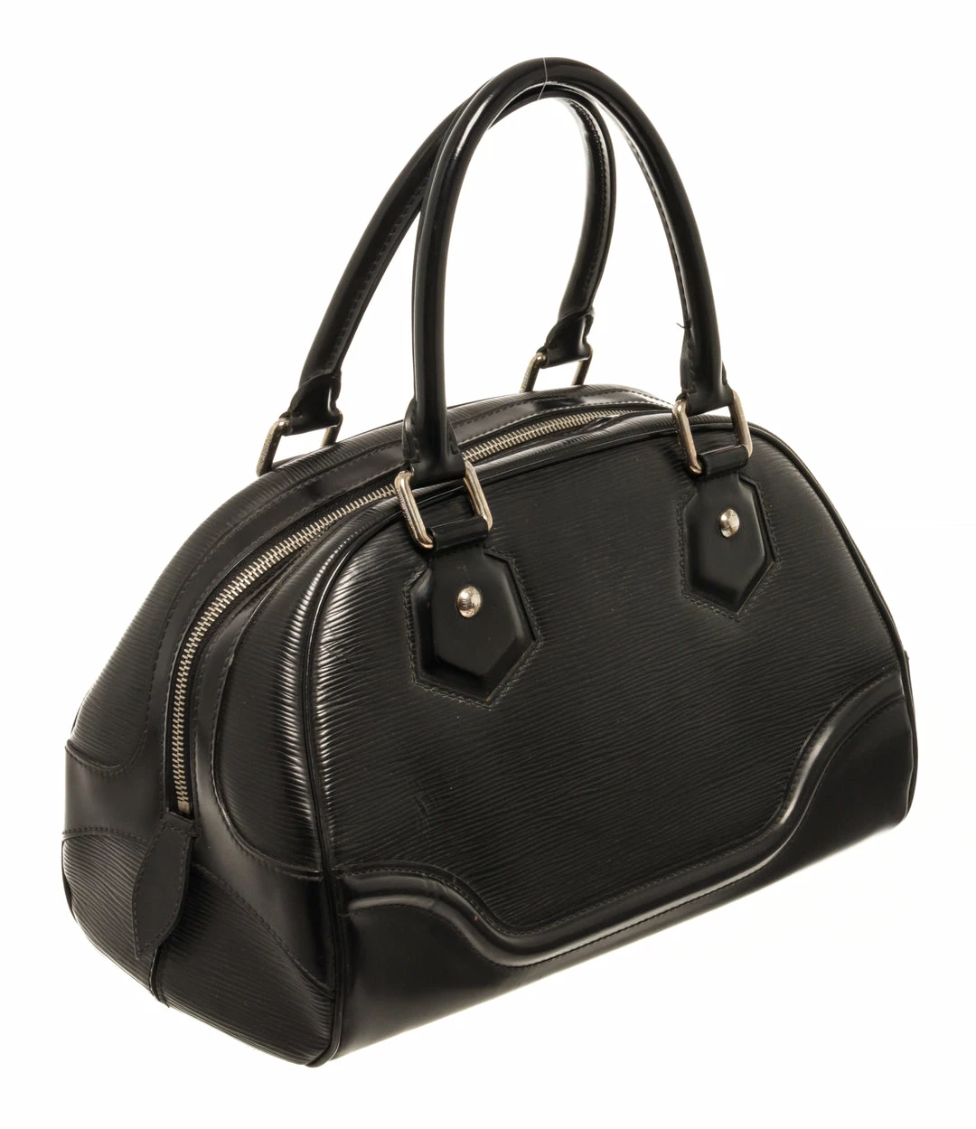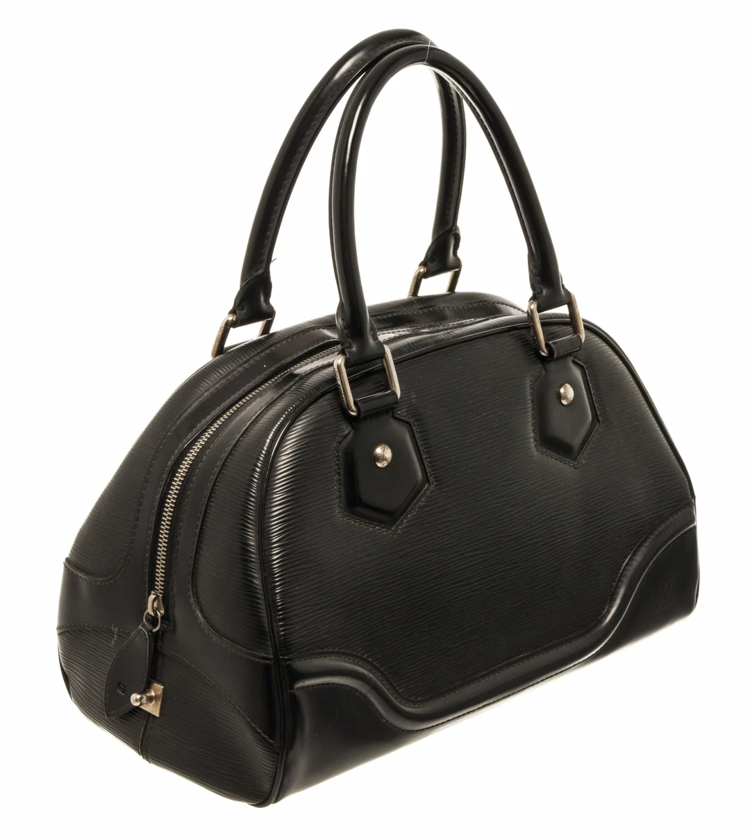 Louis Vuitton Black Epi Leather Bowling Montaigne PM Handbag with silver-tone hardware, epi leather material, slip Interior pocket, dual top handle bag and zipper closure.
