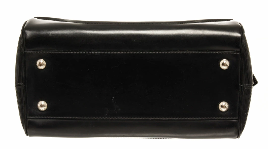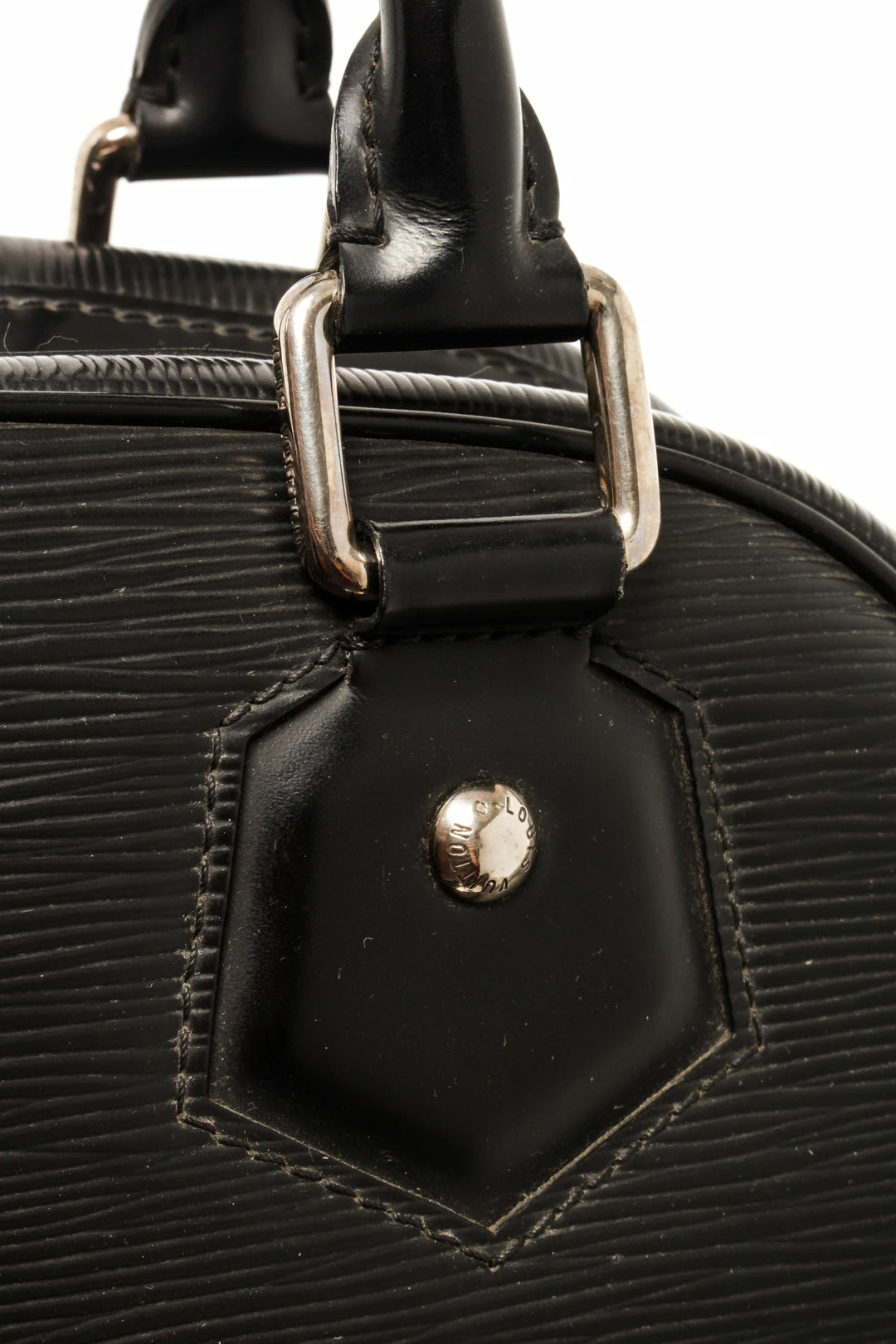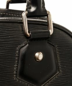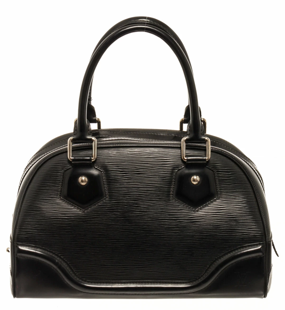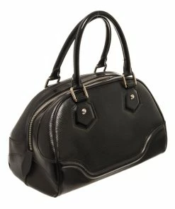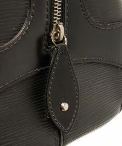 Louis Vuitton Black Epi Leather Bowling Montaigne PM Handbag with silver-tone hardware, epi leather material, slip Interior pocket, dual top handle bag and zipper closure.
