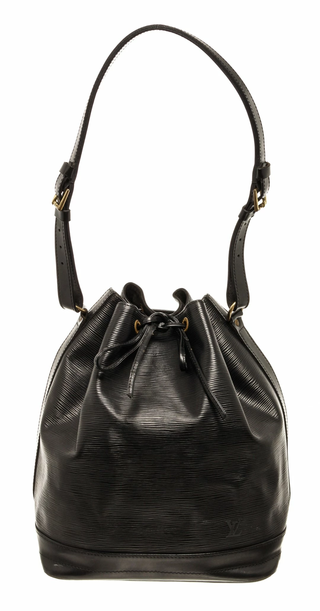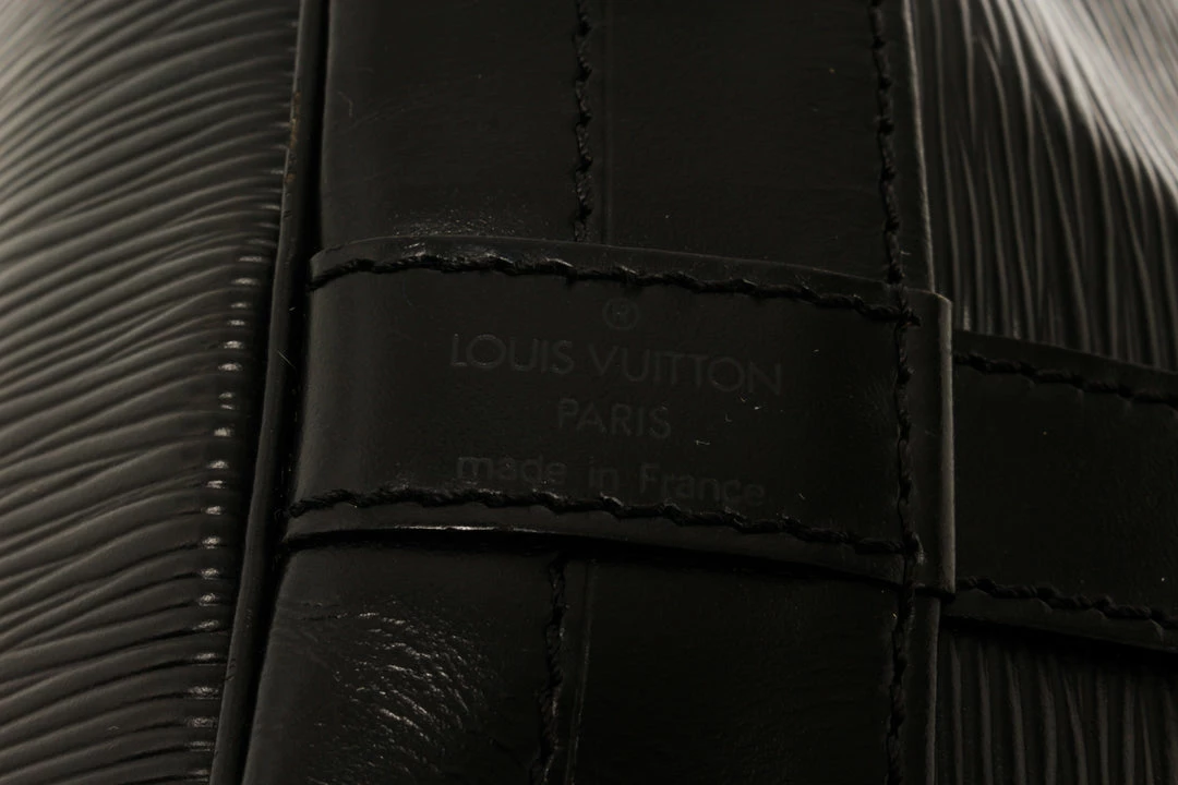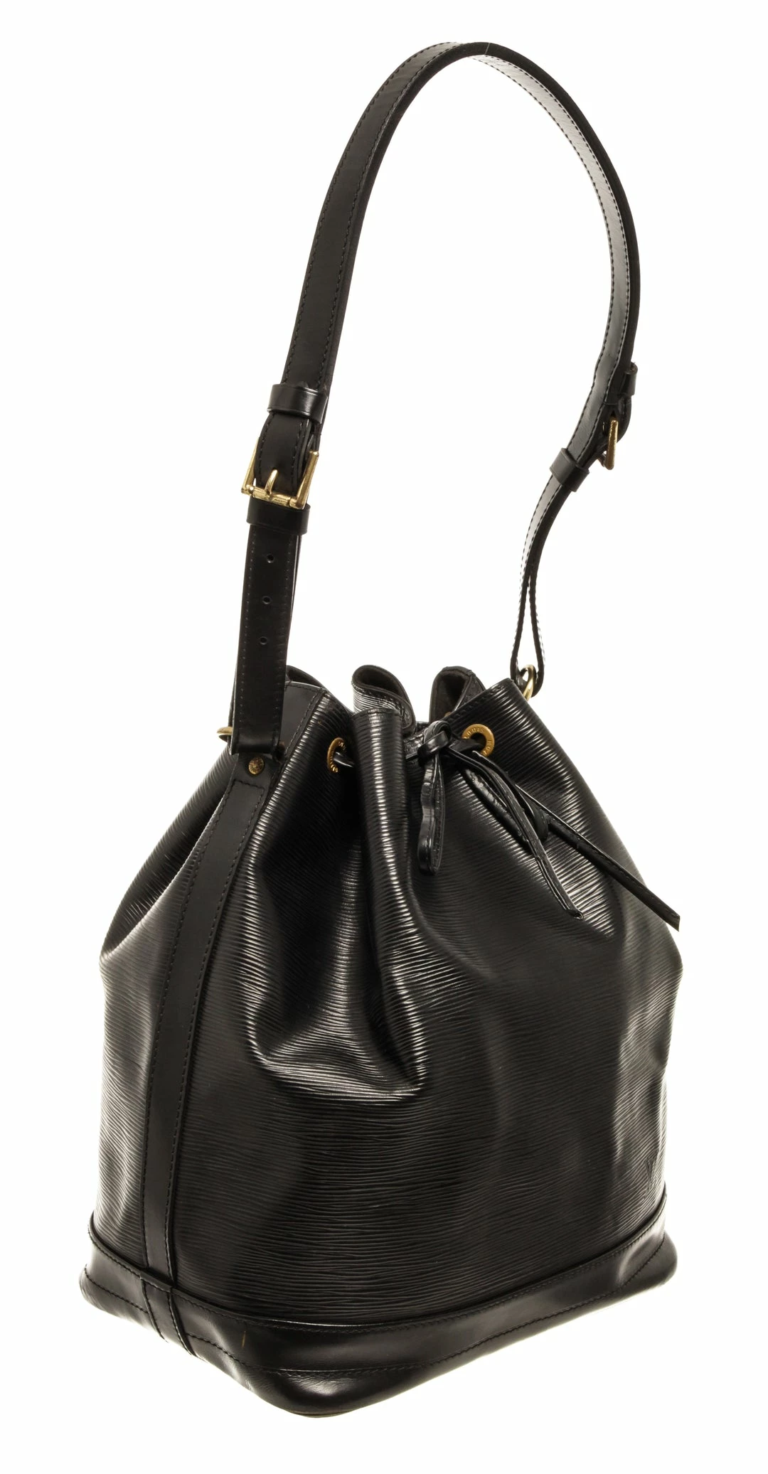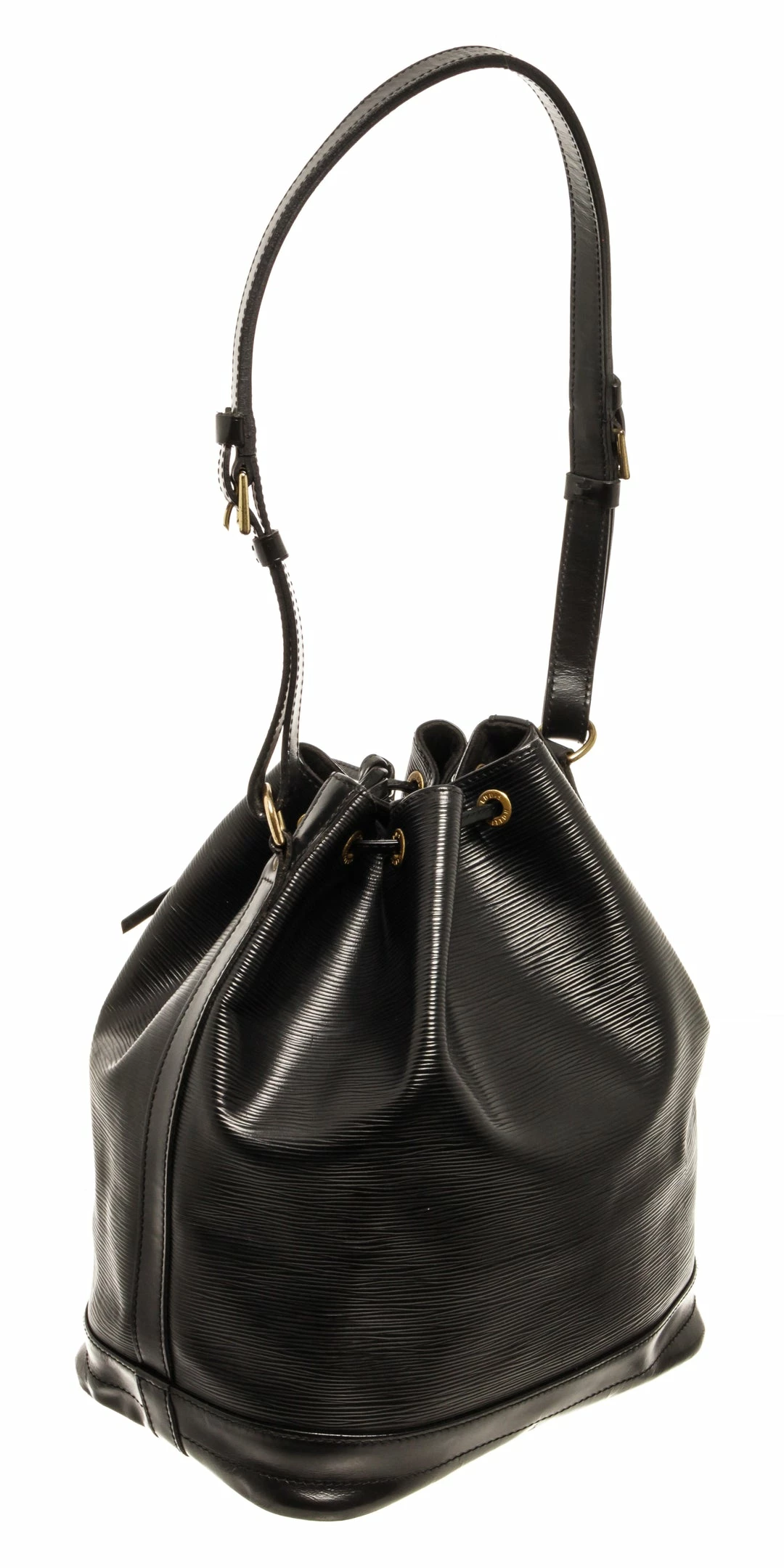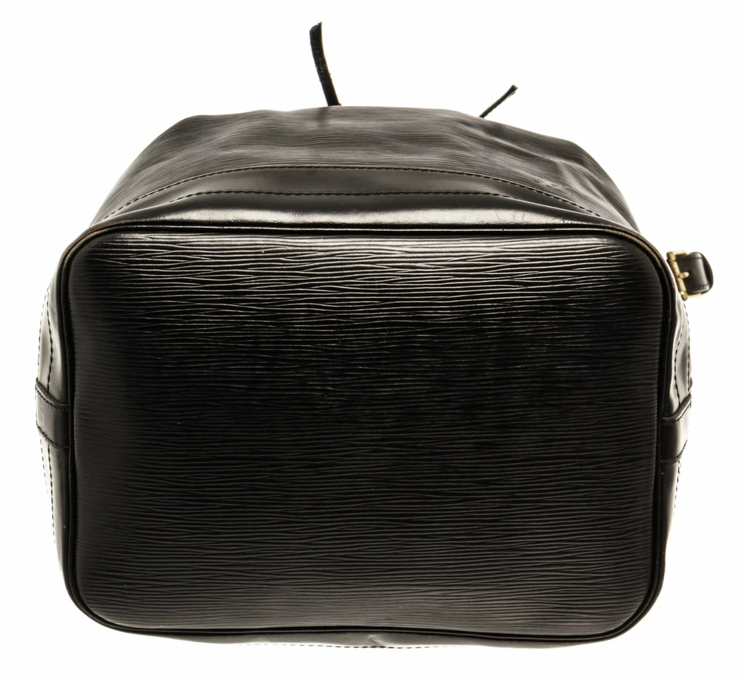 Louis Vuitton Black Epi Leather Noe with adjustable strap, suede lining, drawstring closure, gold tone hardware.