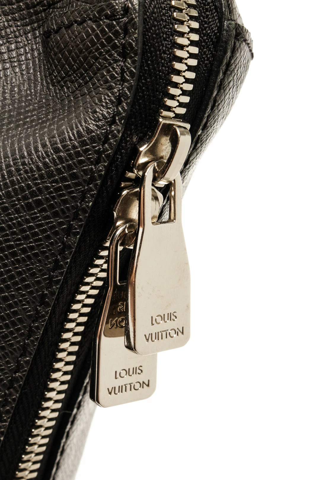 Louis Vuitton Black Taiga Leather Watcher Messenger Bag with silver tone hardware, black leather trim, black fabric lining, interior open pockets, adjustable strap, and zipper closure.