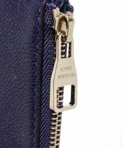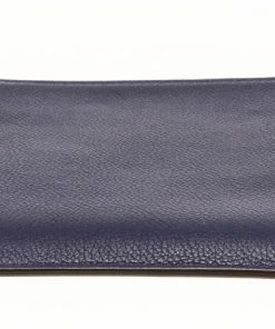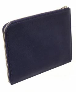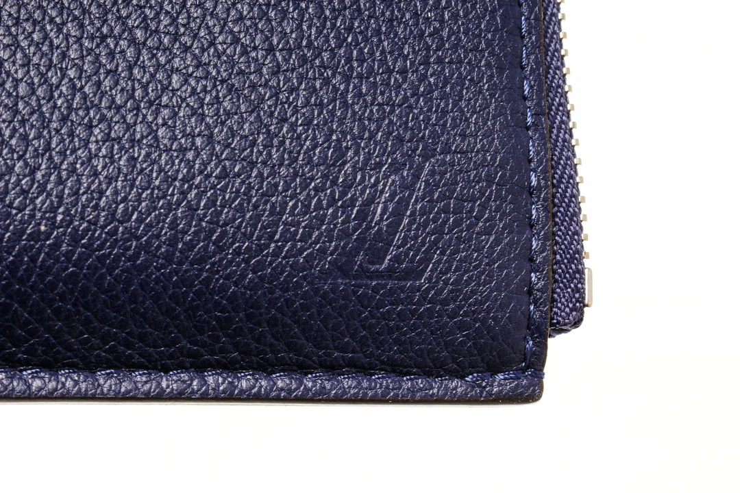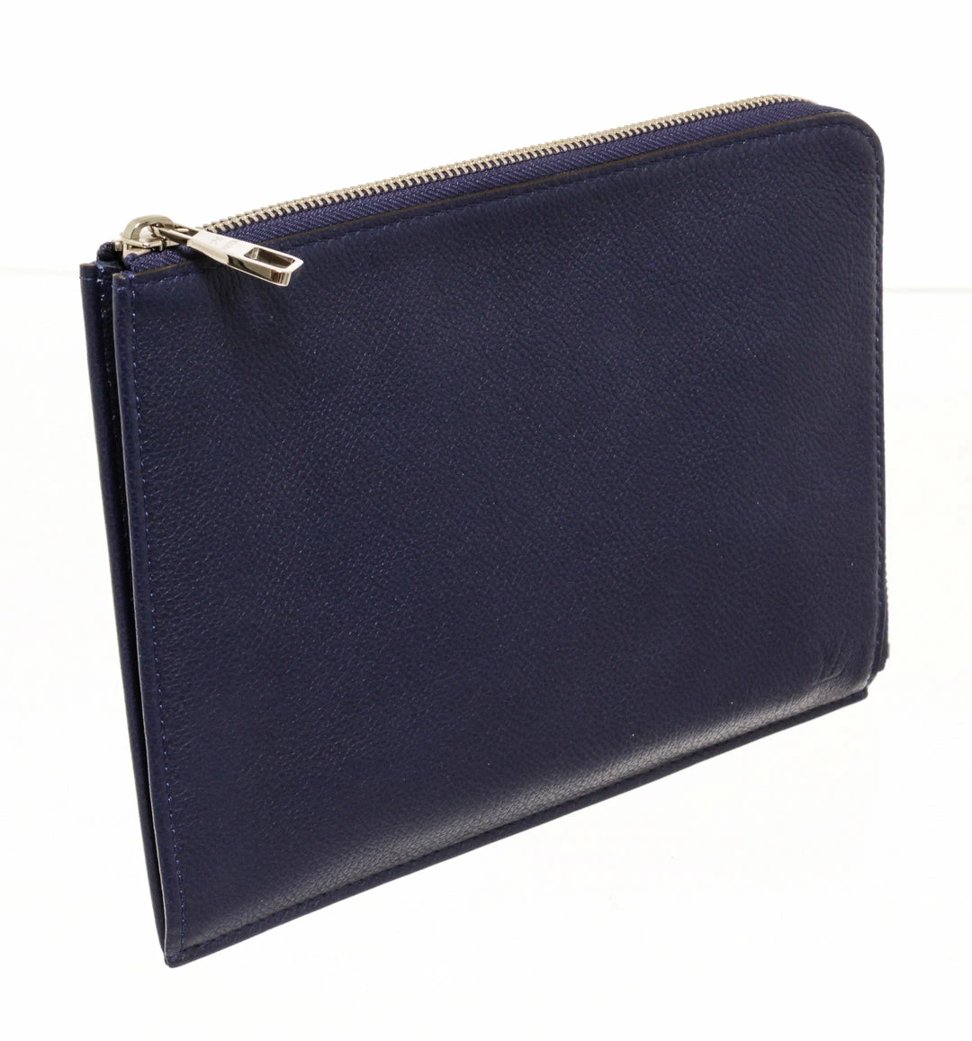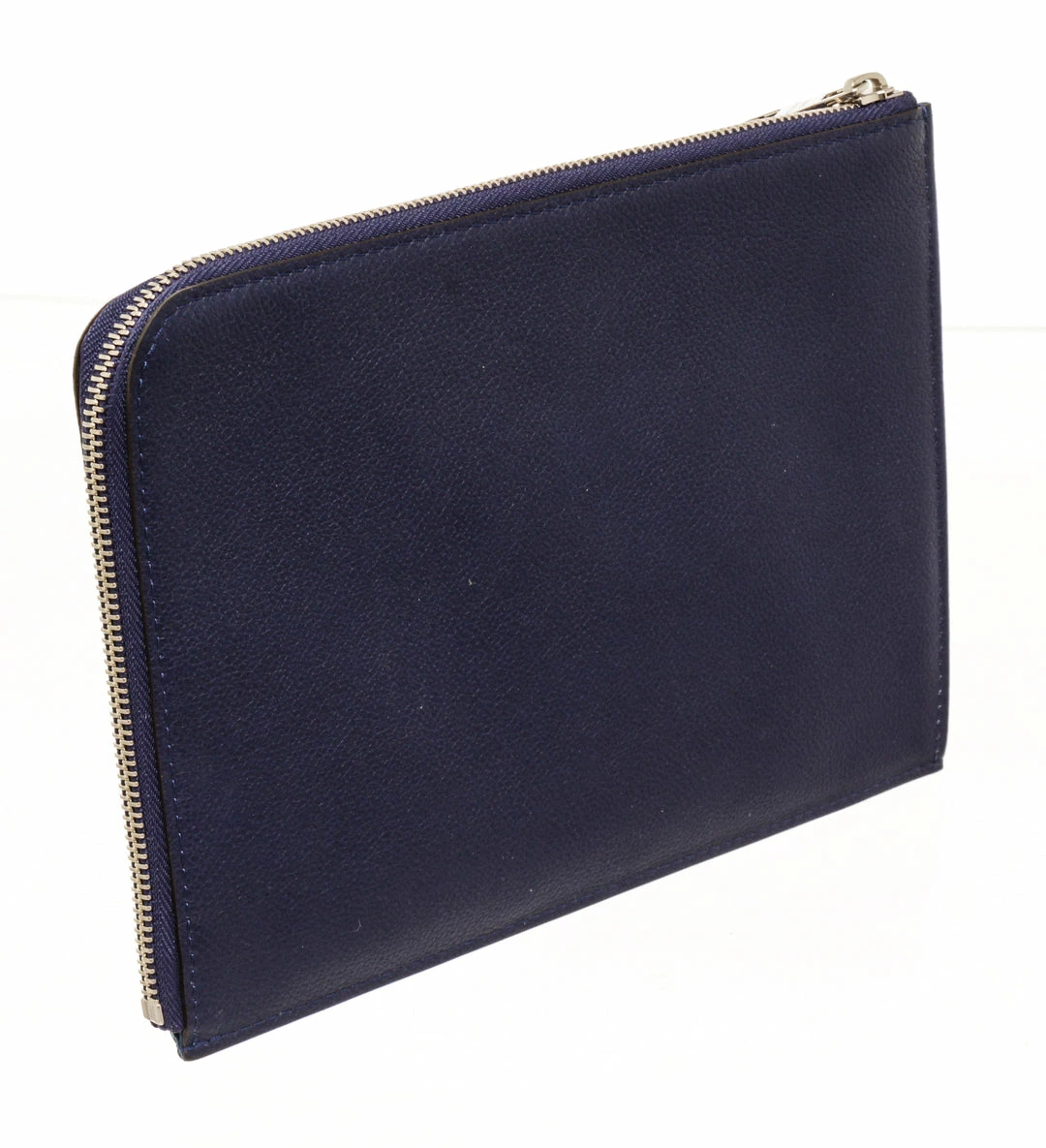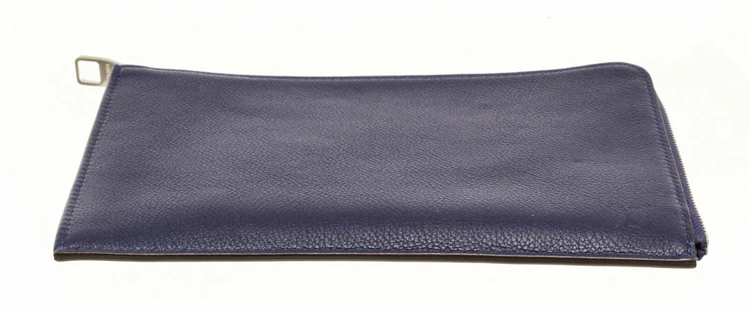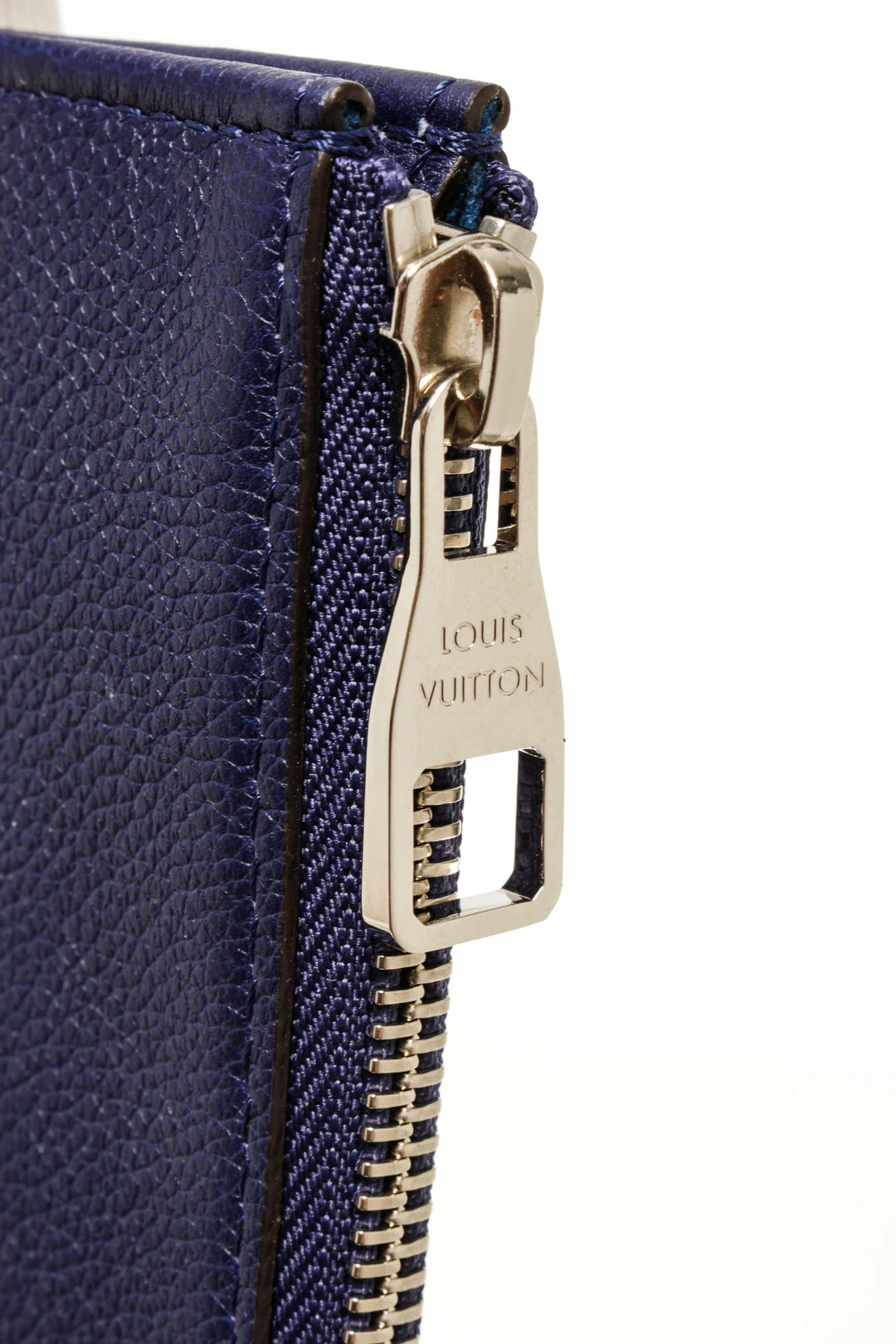 Louis Vuitton blue leather Pochette Jules GM with embossed logo on the exterior, blue suede lining, silver-toned hardware, zipper closure, and one compartment with one slip pocket.