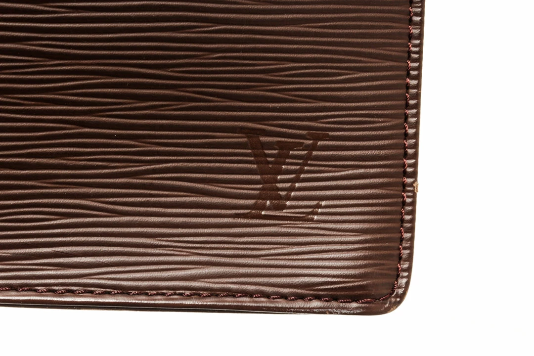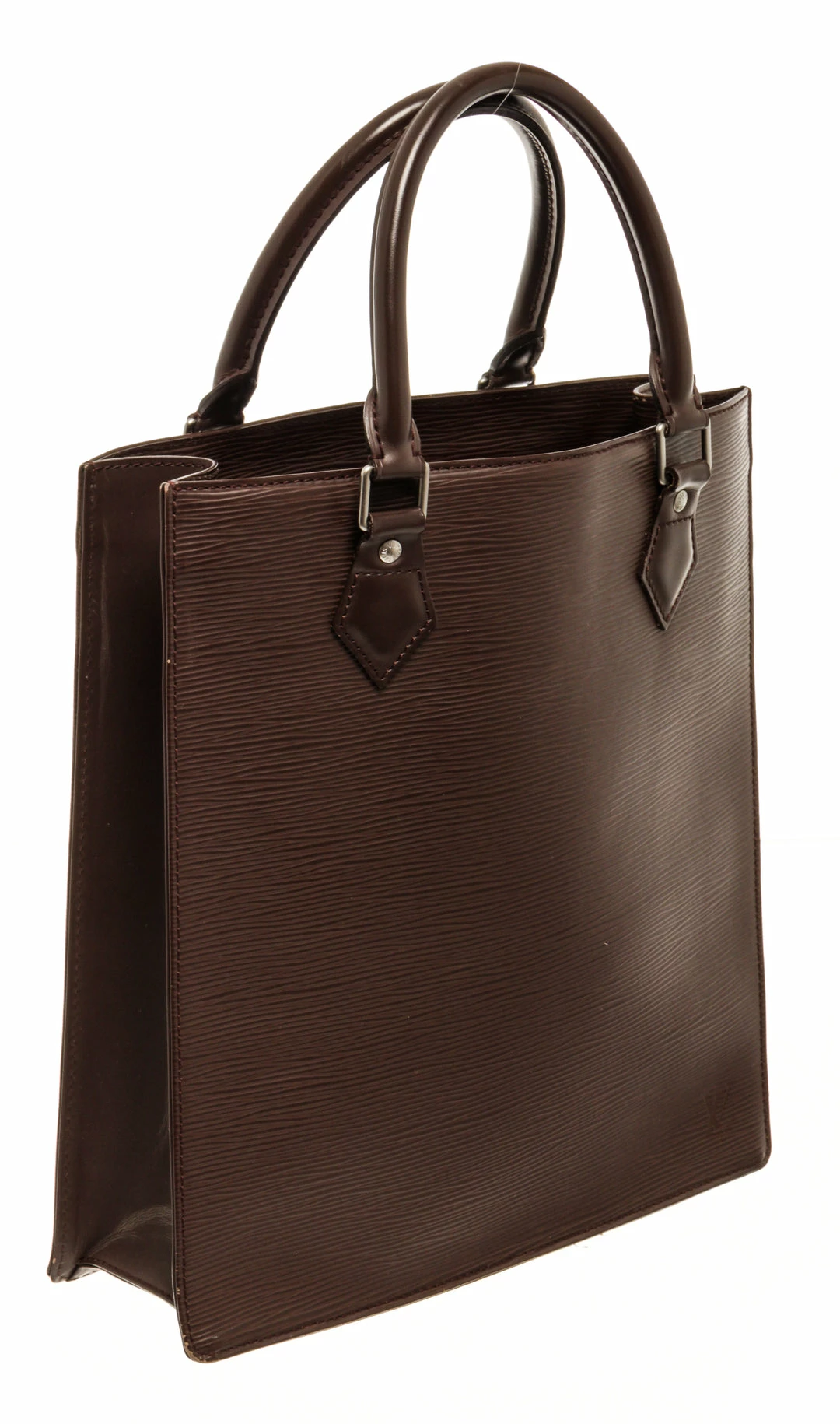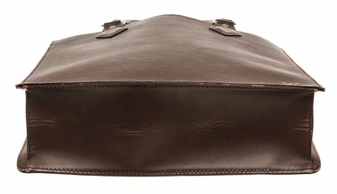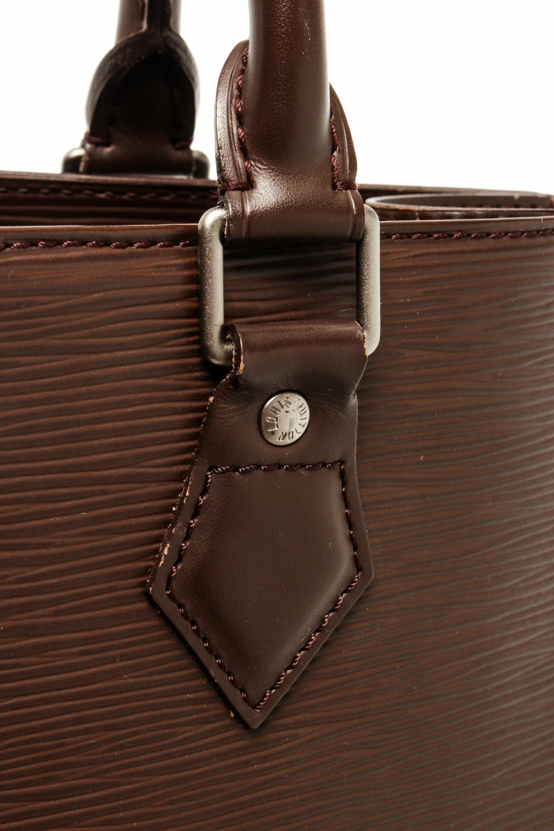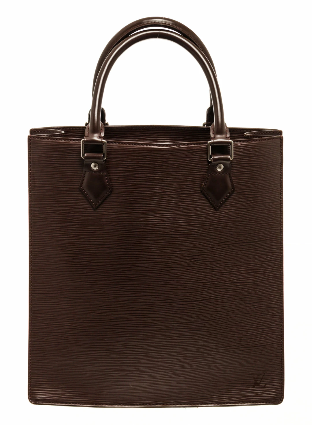 Dark Brown epi leather Louis Vuitton Sac Plat with silver-tone hardware, dual tan rolled leather handles, dark brown canvas lining, dual interior slip pockets at interior wall and open top.