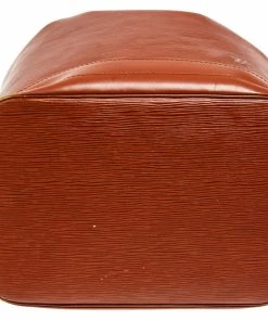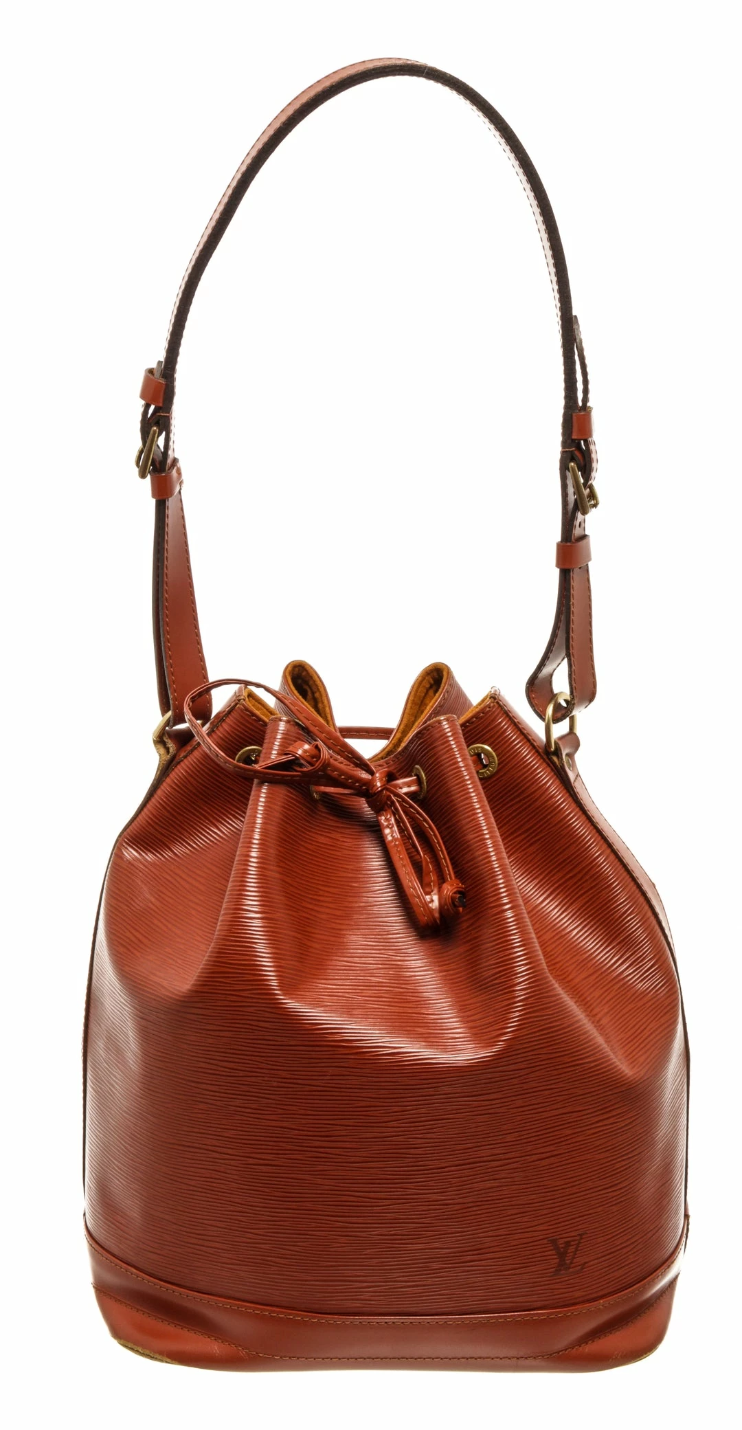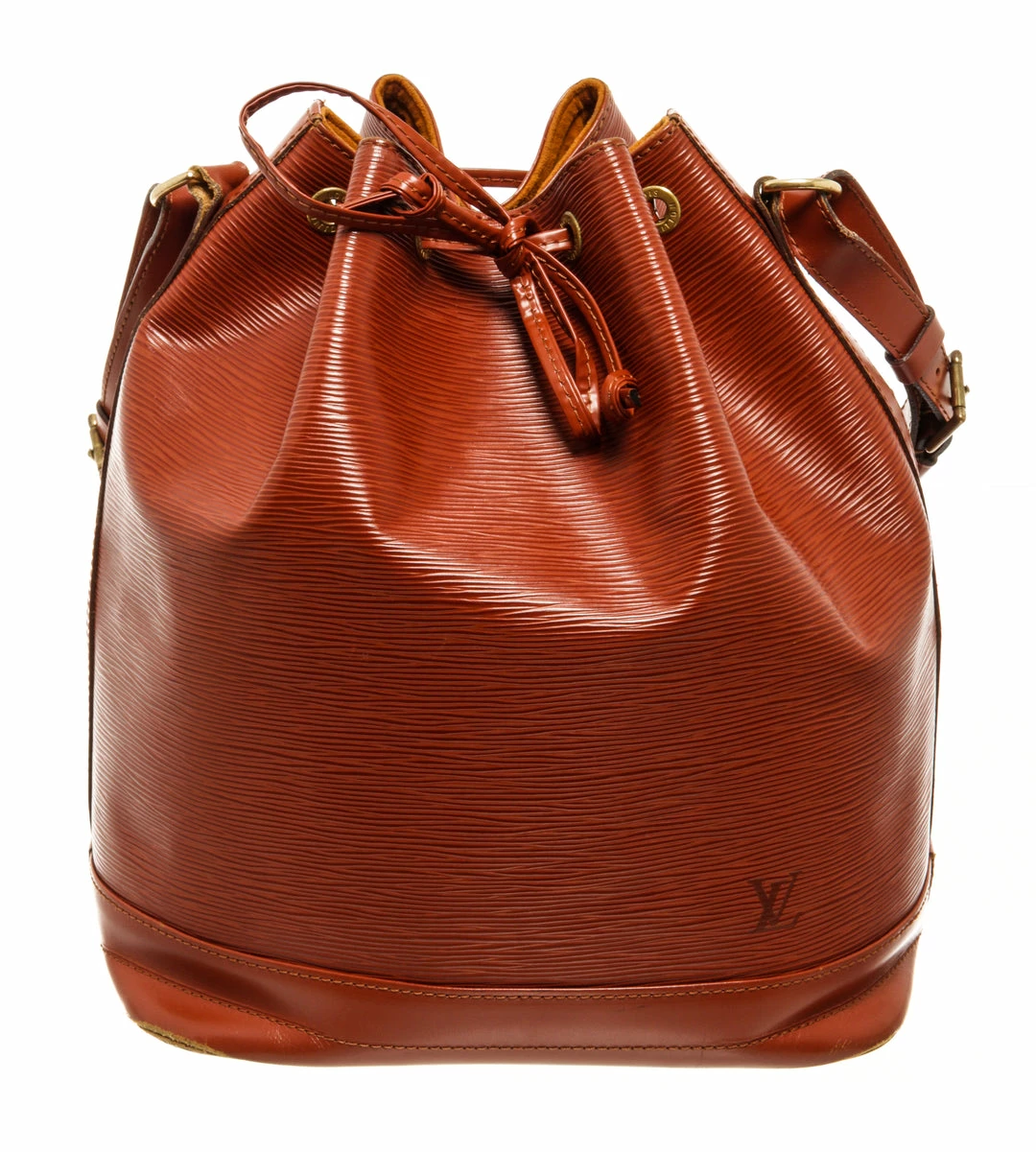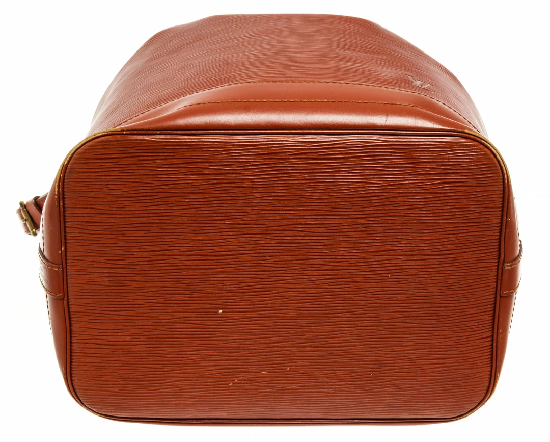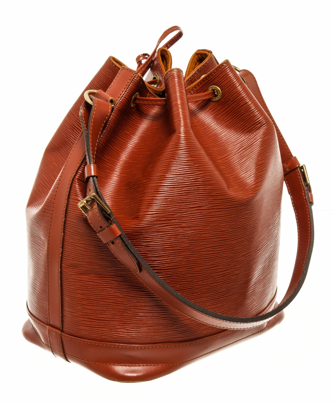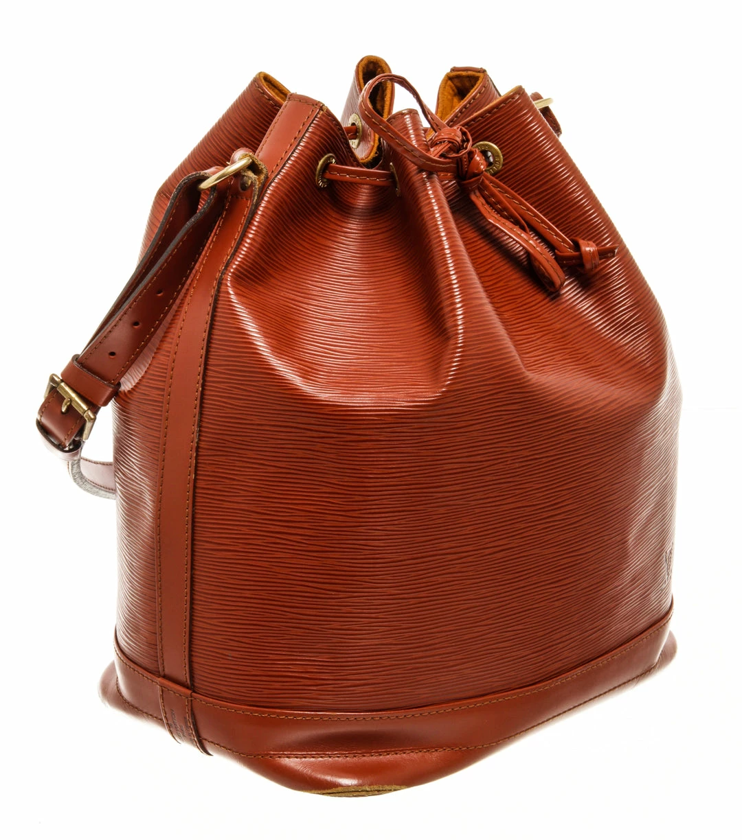 Louis Vuitton Brown Epi Noe PM with an adjustable strap, suede lining, gold tone hardware and drawstring closure
