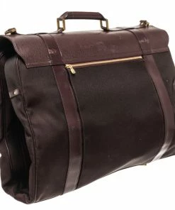 Louis Vuitton Brown Leather Portable Garment Briefcase with top handle, detachable strap, top flap is leather, bottom half is canvas, two interior zip pockets, comes with a hanger, gold tone hardware, buckle and zip closure.
