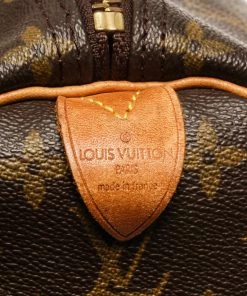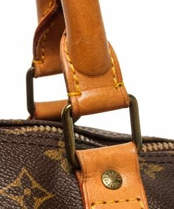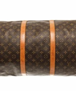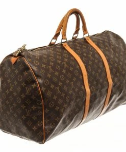 Louis Vuitton Brown Monogram Canvas Keepall 60 Duffel Bag with top handle, lock & key, canvas lining, gold tone hardware, zipper closure. There is some wear on the vachetta, hardware is tarnished. Please refer to photos.