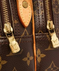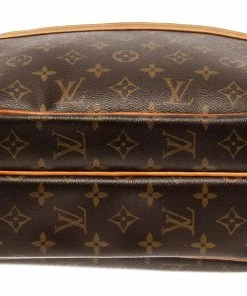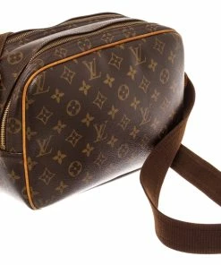 Louis Vuitton Brown Monogram Reorter PM Crossbody Bag with leather trim, a front exterior slip pocket, an adjustable flat strap, double compartments with top zip closures, and interior slip pockets.