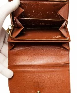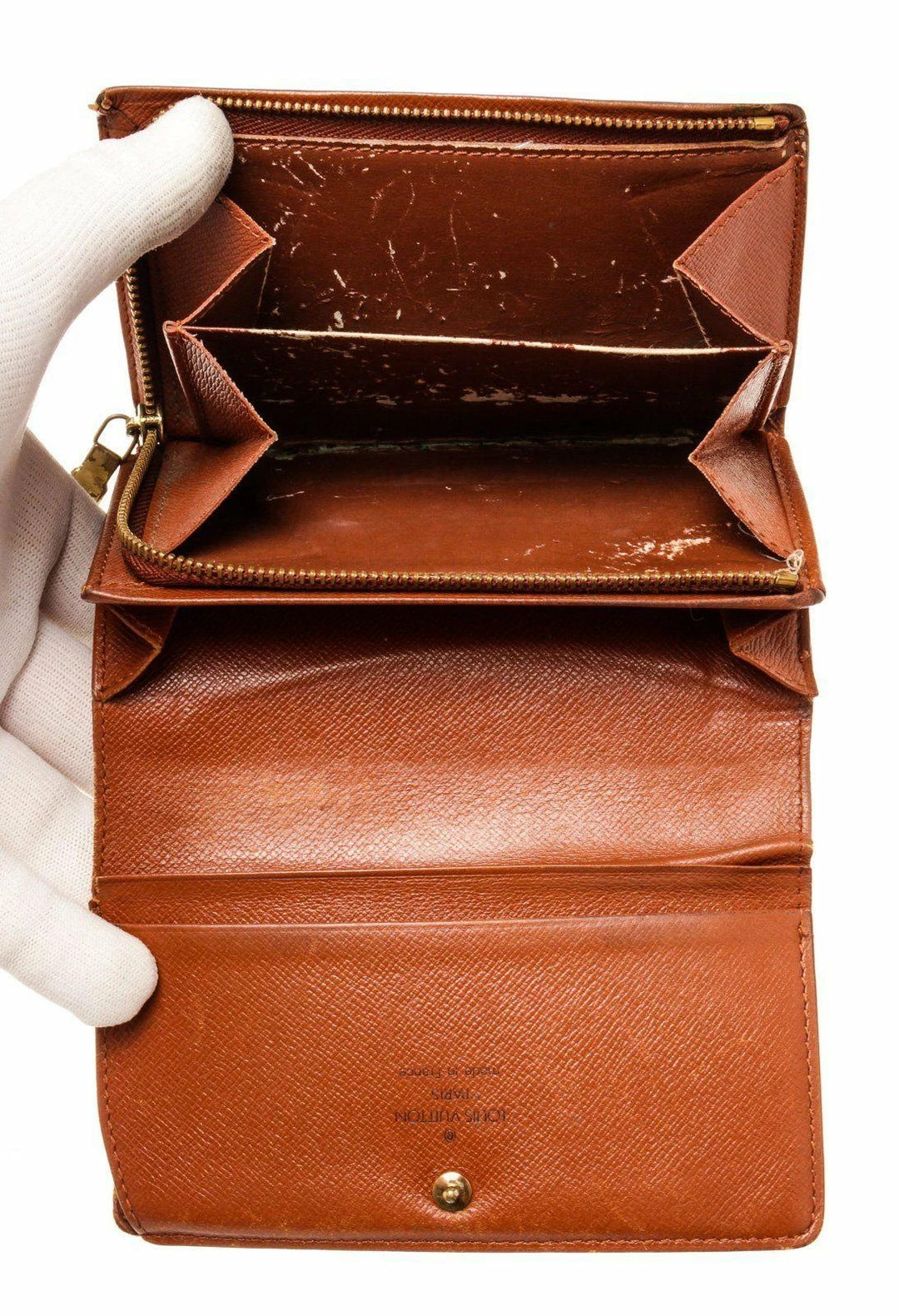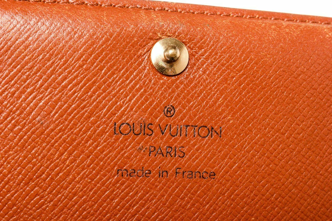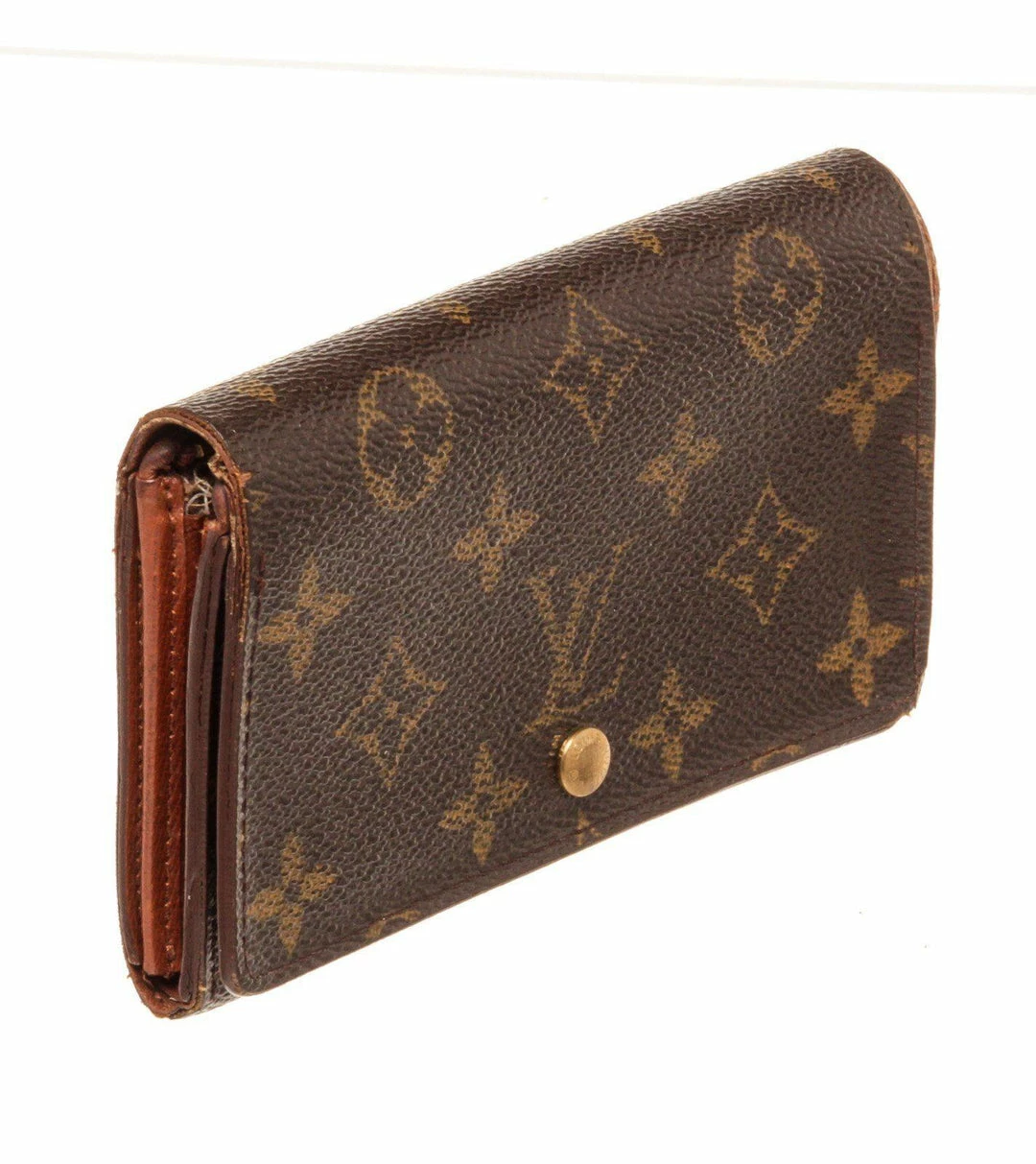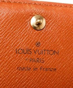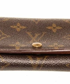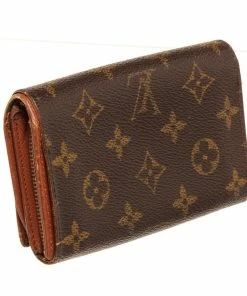 Louis Vuitton Brown Porte Monnaie Wallet with monogram canvas, gold-toneย hardware, trim tan vachetta leather, interior three compartments pocketย and snapย closure._x000D_