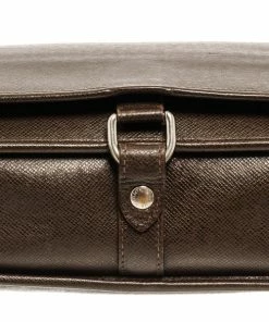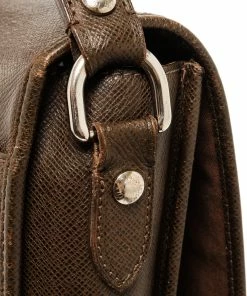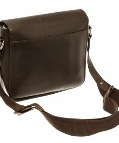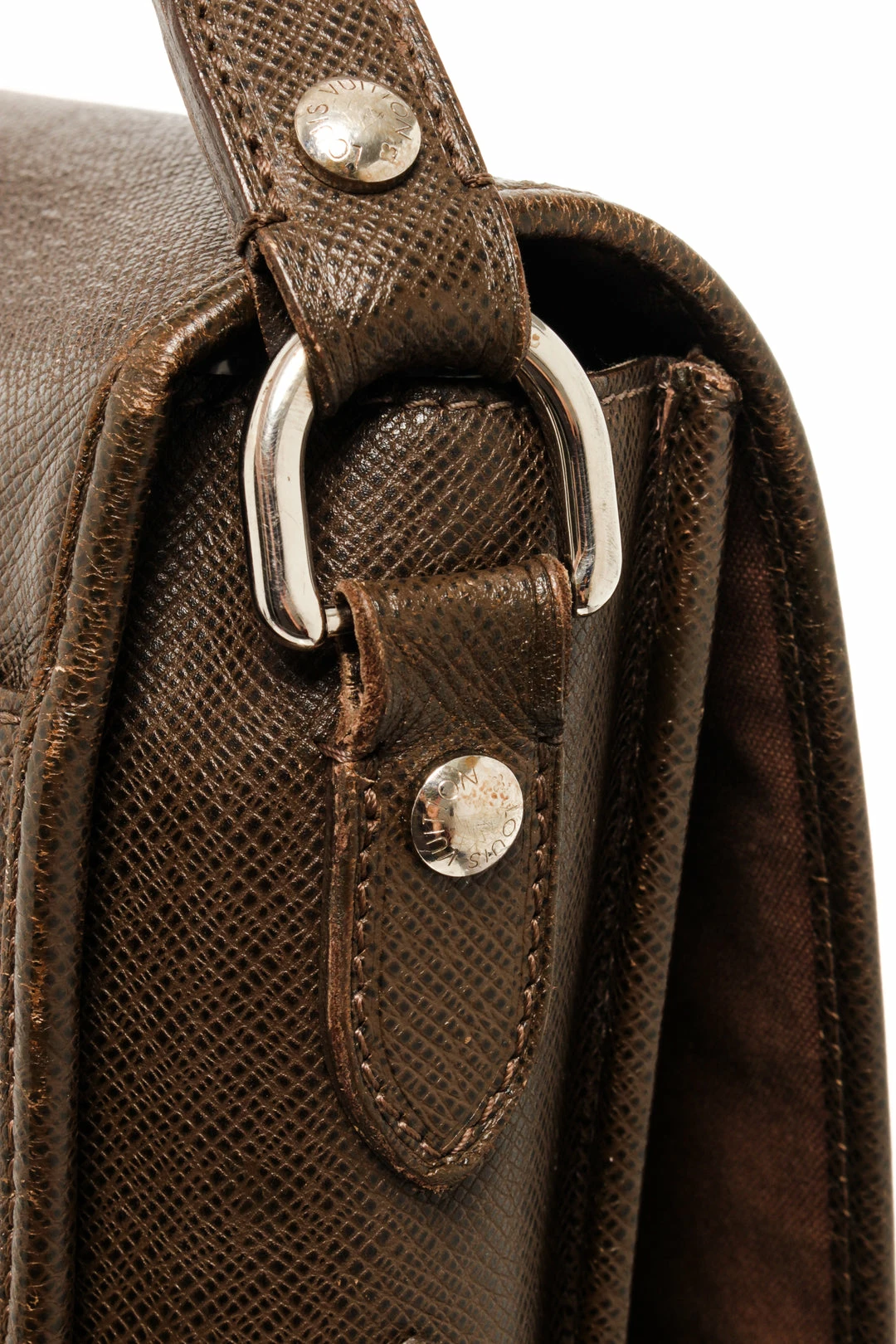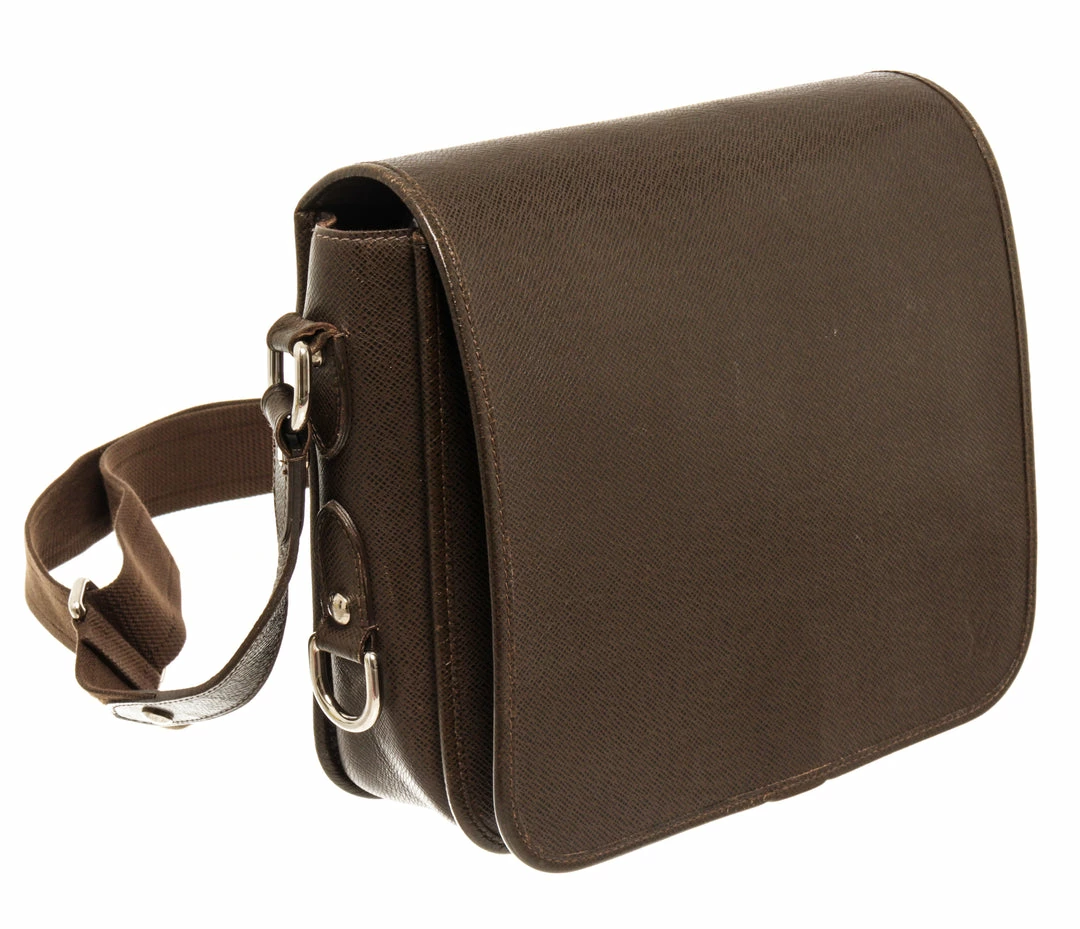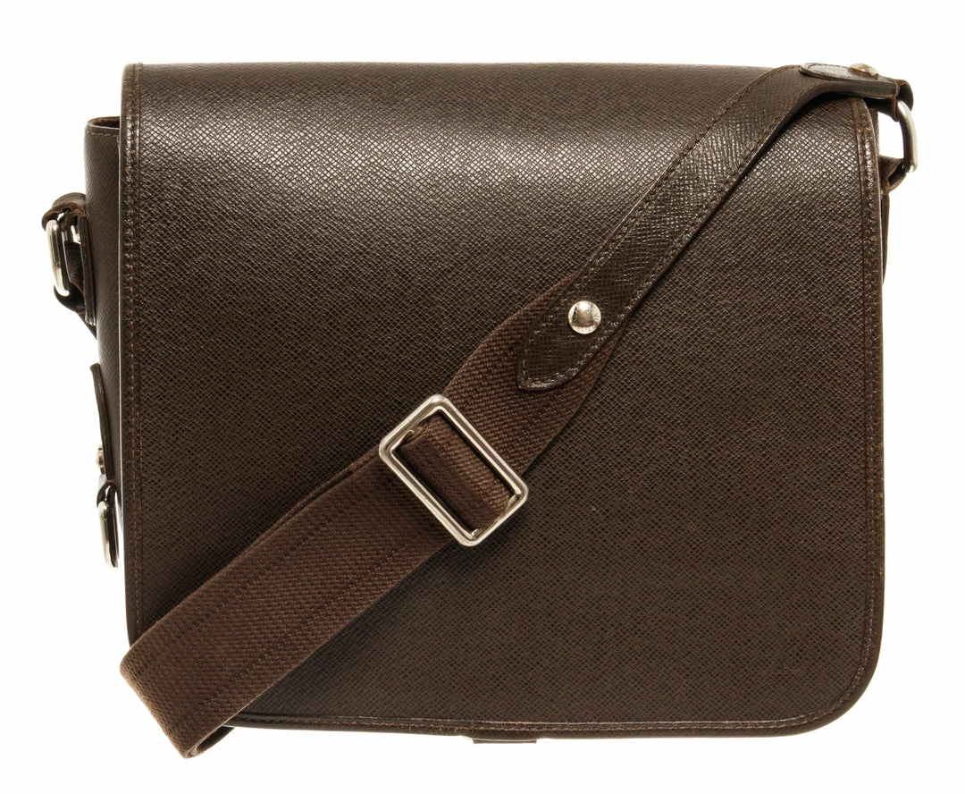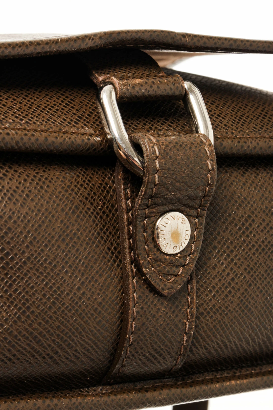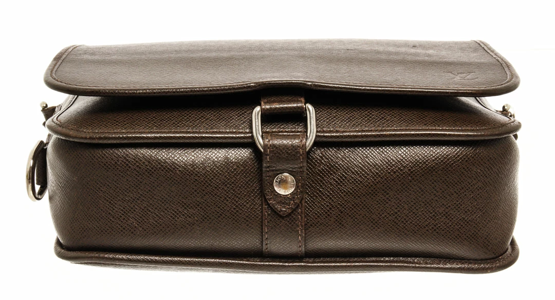 Louis Vuitton Brown Taiga Leather Andrei Shoulder Bag with silver tone hardware, brown leather trim, brown fabric lining, exterior back pocket, strap, and flap closure.
