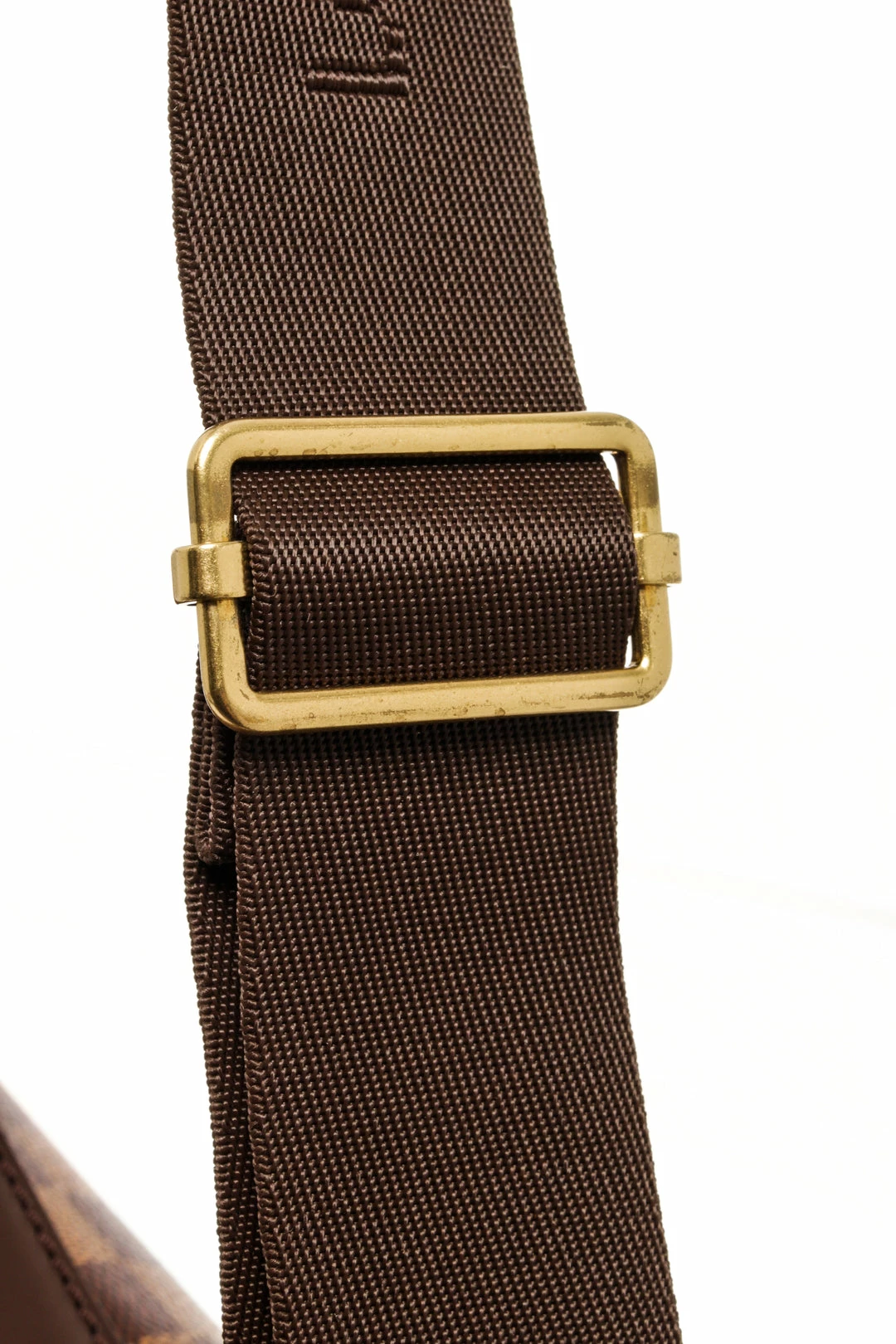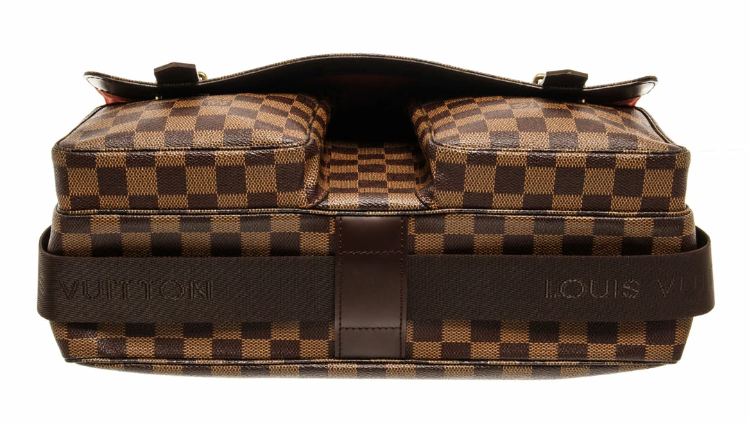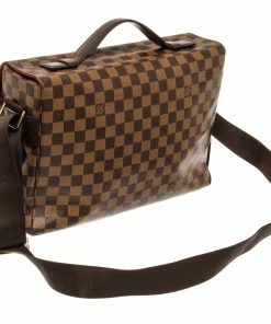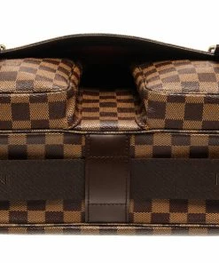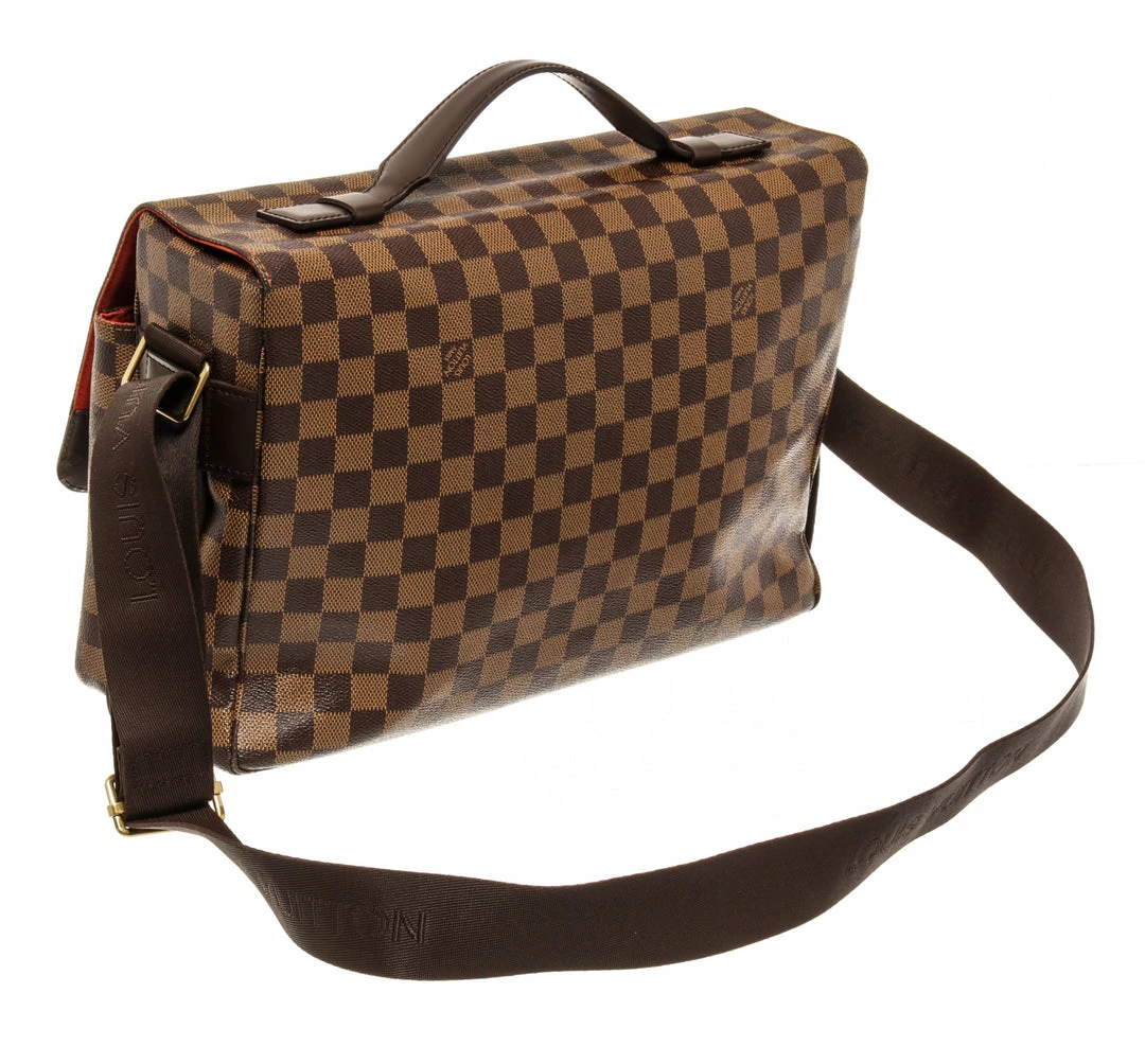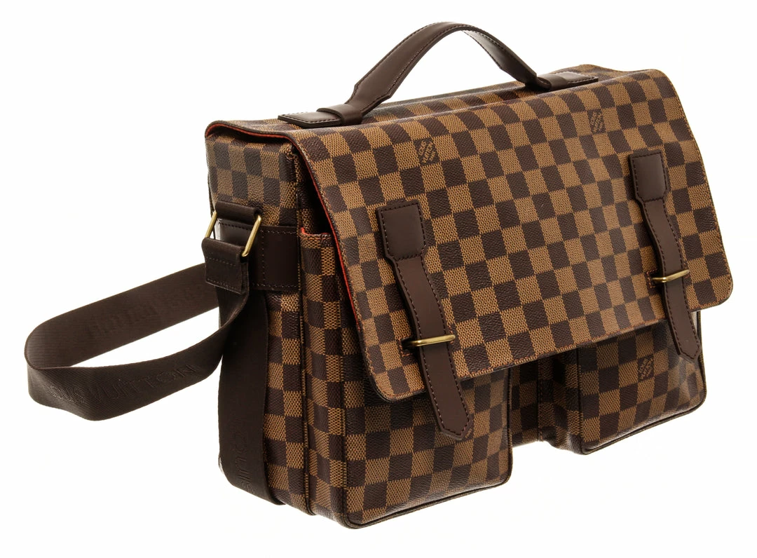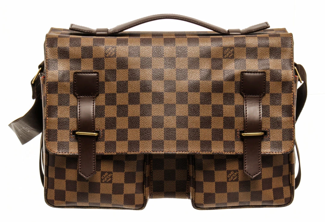 Louis Vuitton Damier Ebene Broadway crossbody bag with top handle, adjustable fabric strap, red fabric lining, two interior slip pockets, two exterior pockets on the front side, gold-tone hardware, and flap and strap closure.