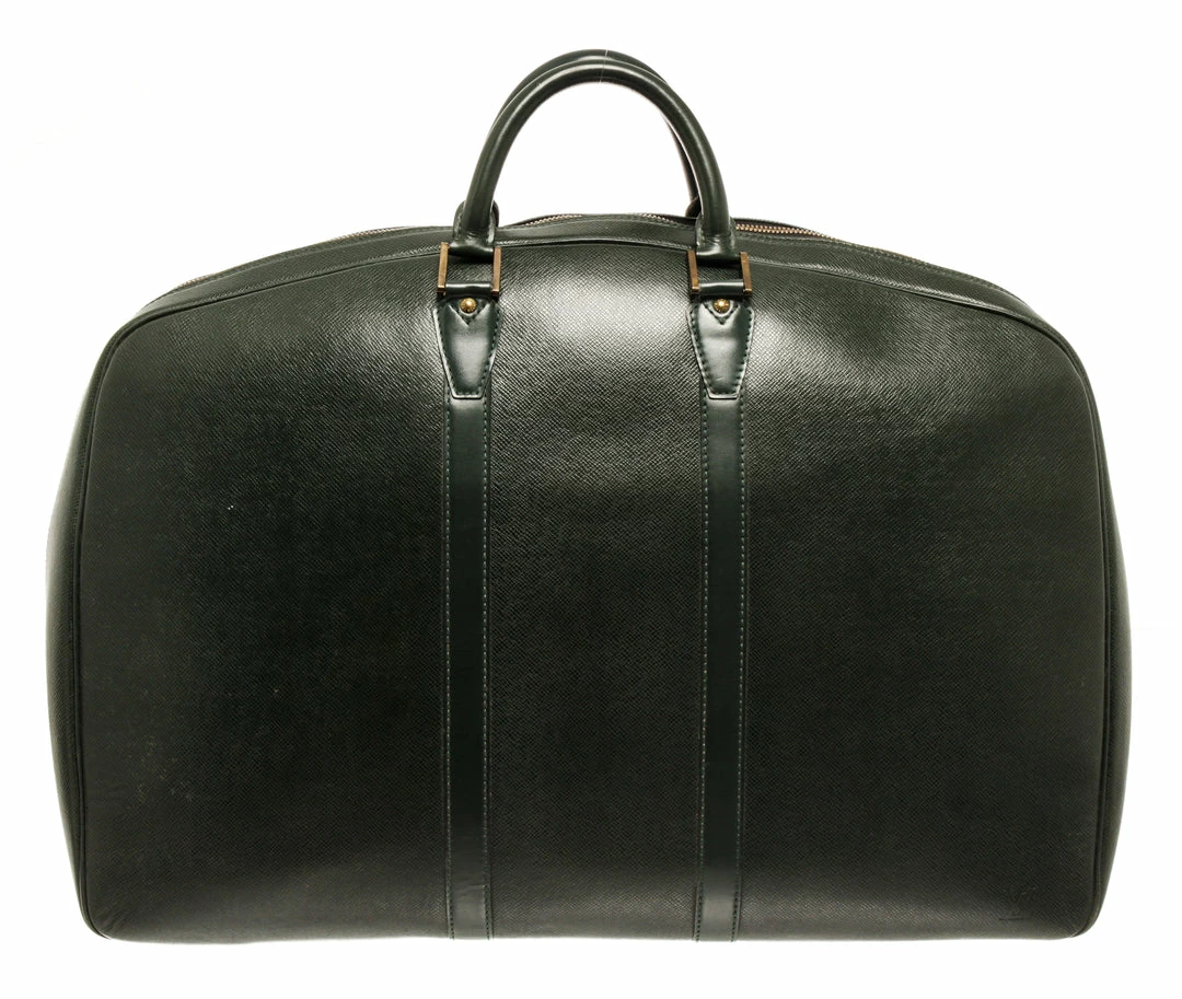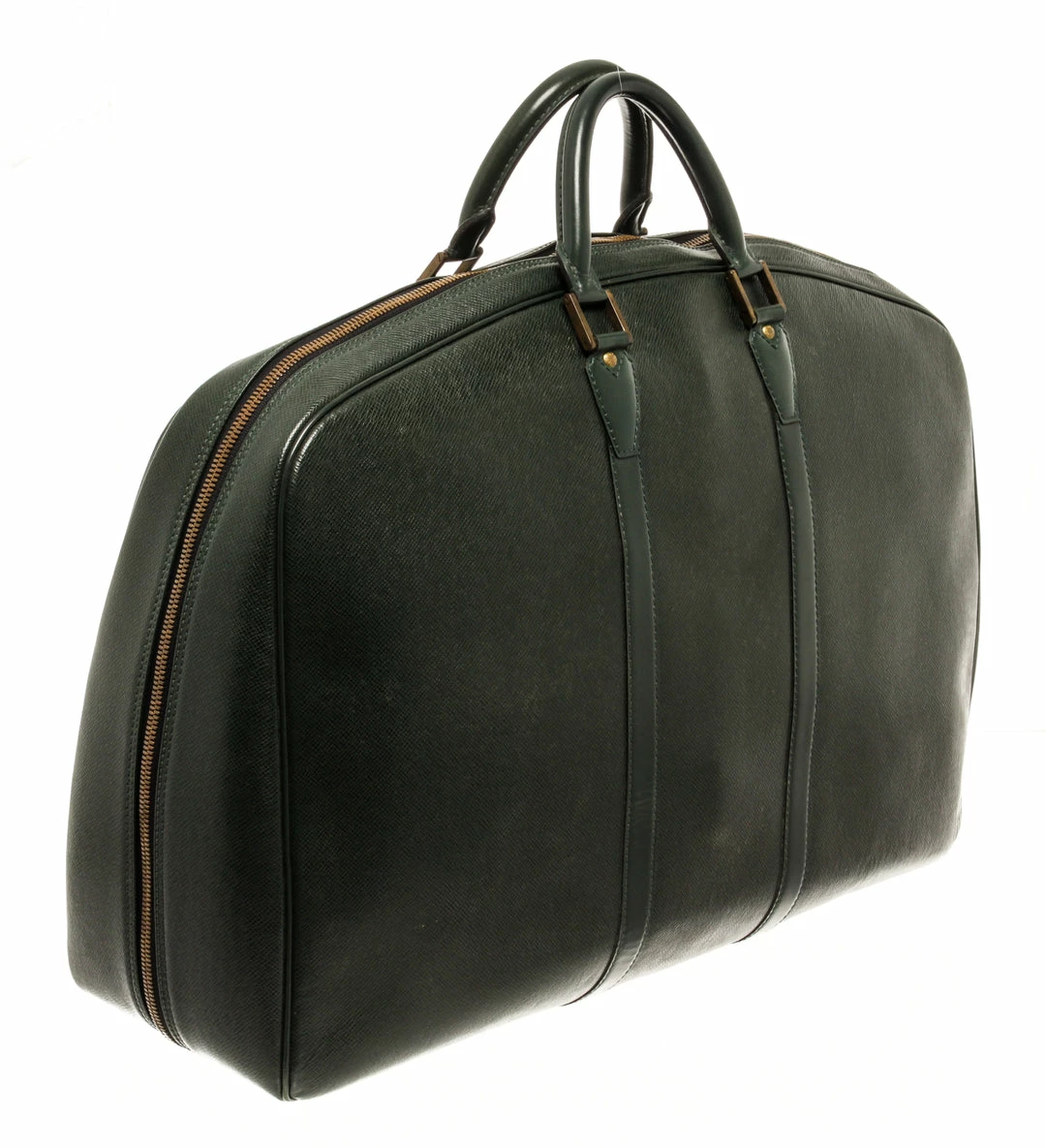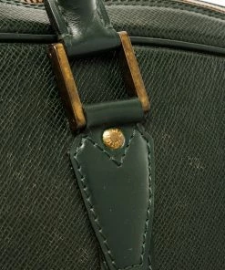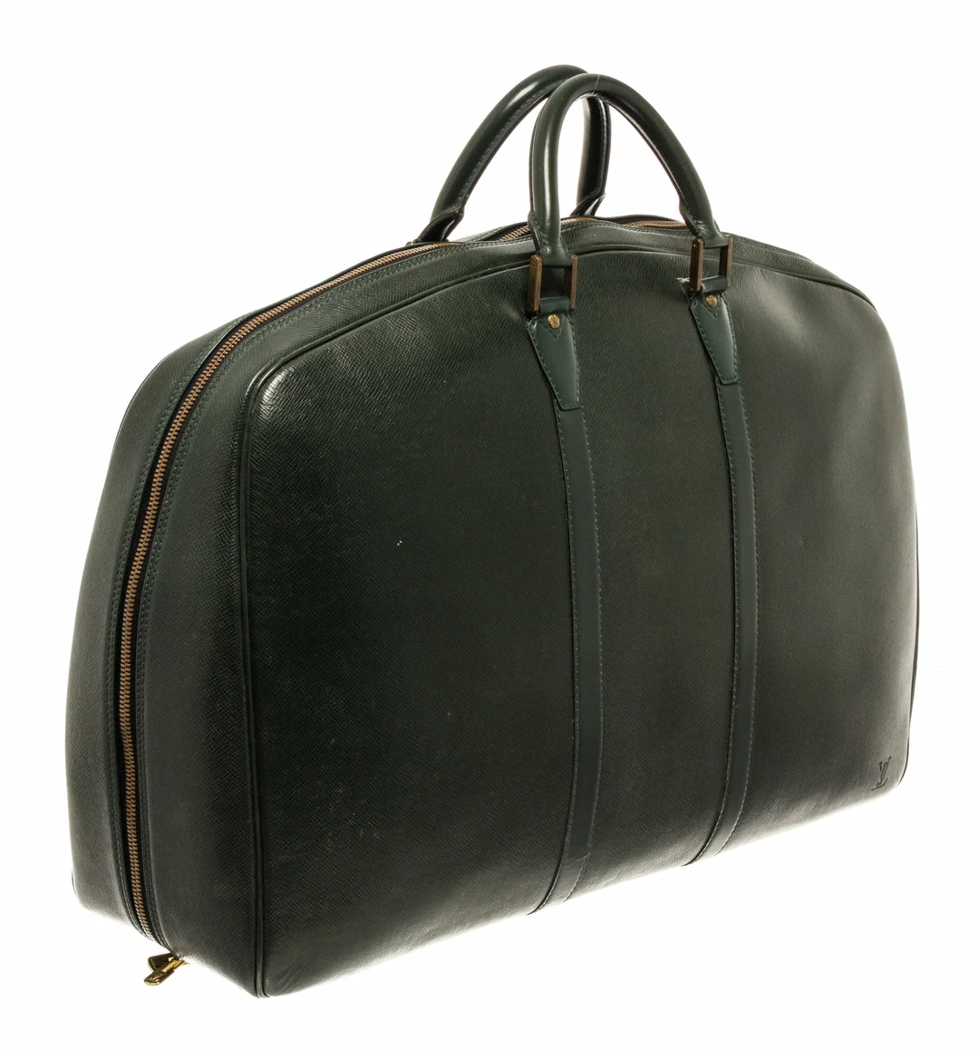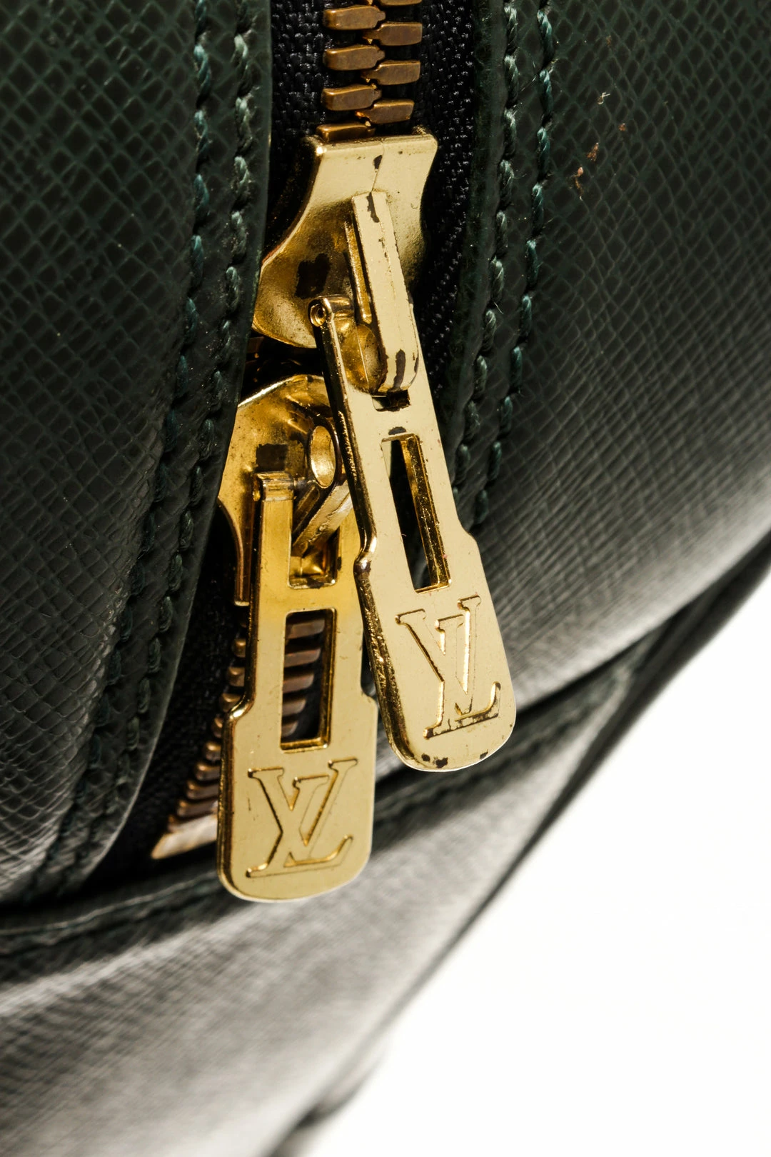 Louis Vuitton Green Taiga Leather Helanga 1 Poche Bag with gold tone hardware, green leather trim, brown suede lining, dual top handles, and zipper closure.