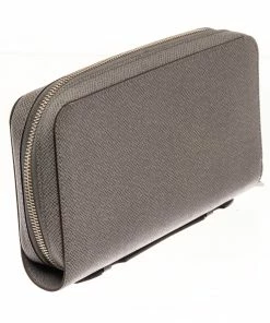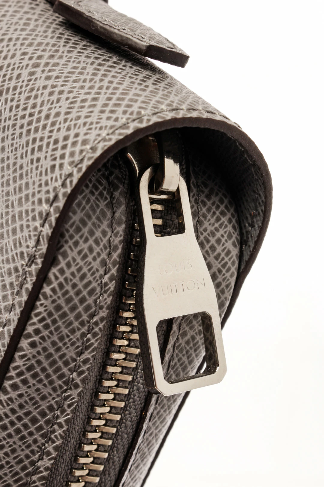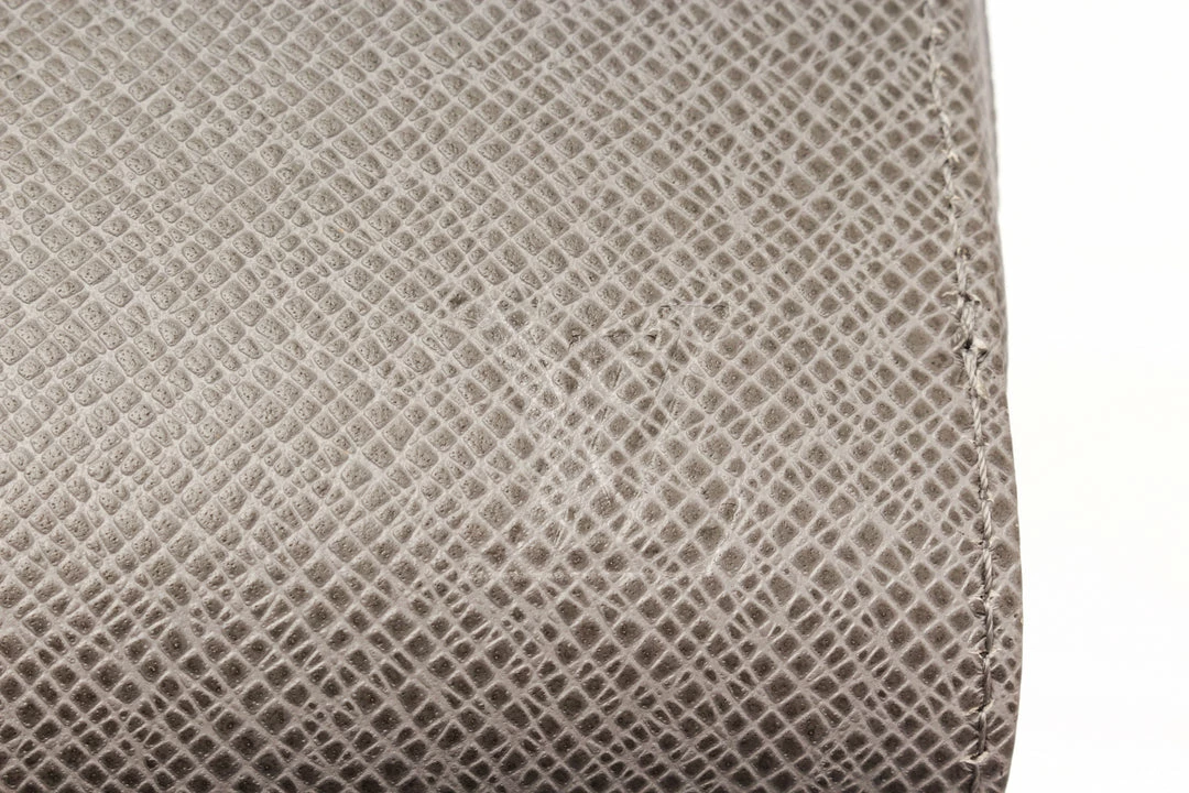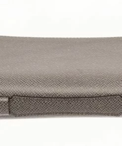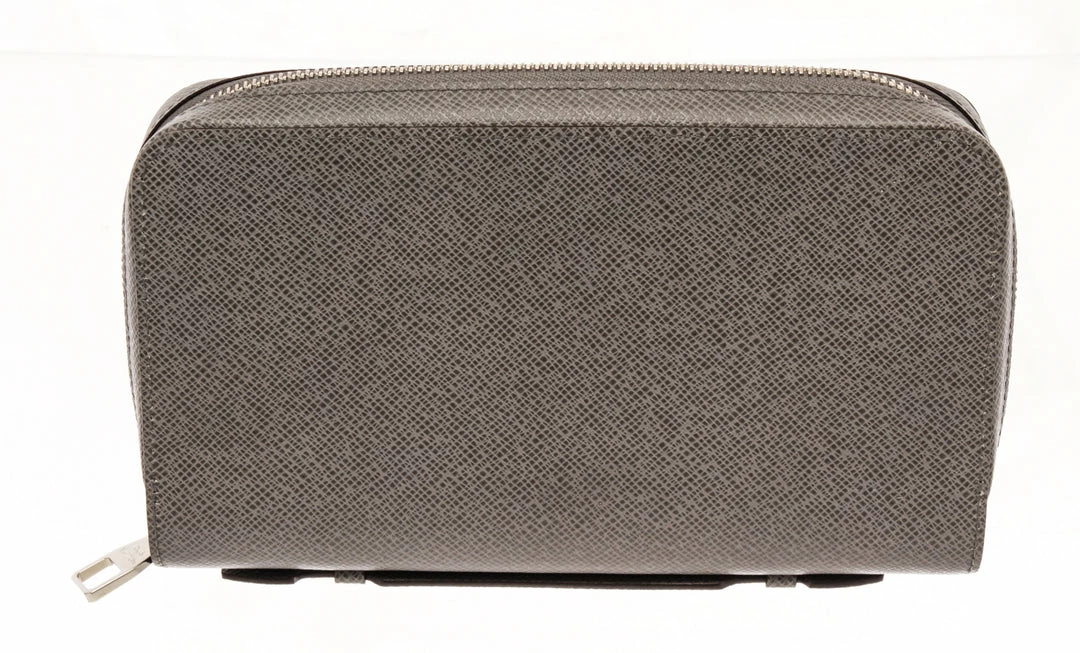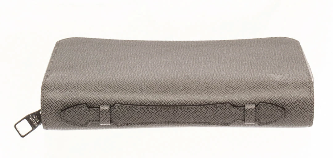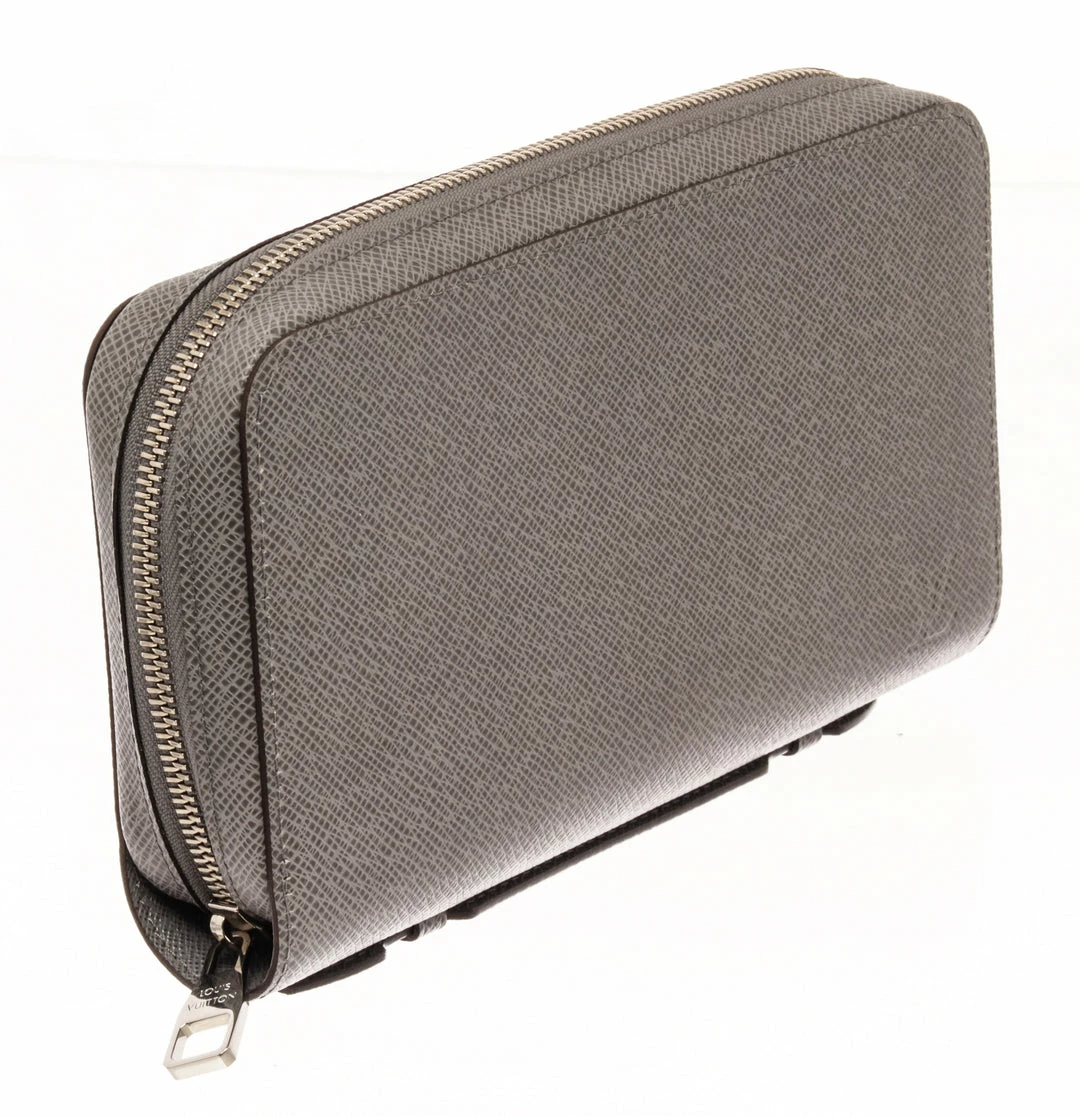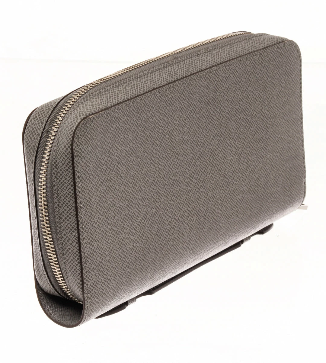 Louis Vuitton Grey Taiga Leather XL Zippy Wallet with gold-tone hardware, trim tan vachetta leather, slip pocket in interior, zip around closure opens to card slots, Zip around closure.