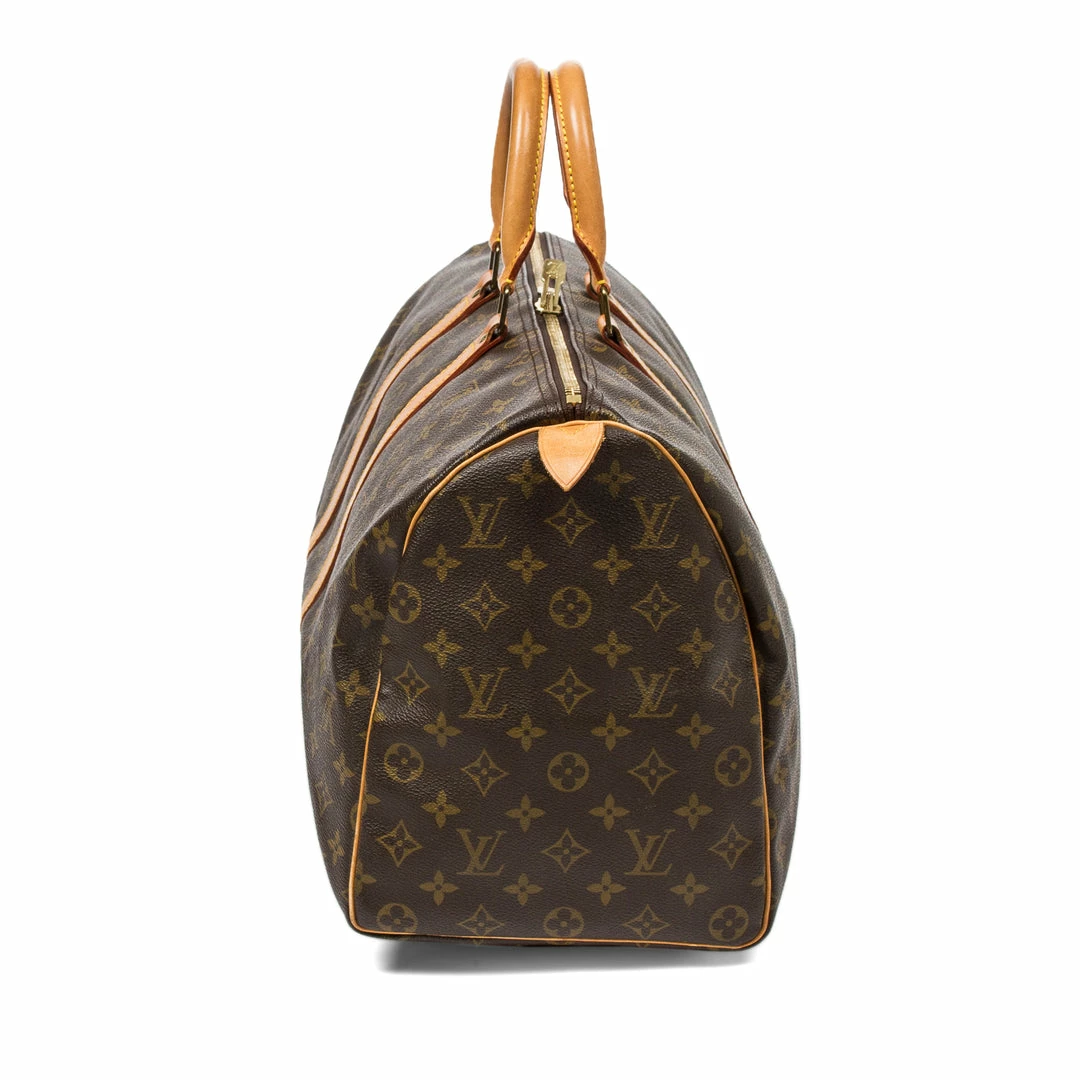 Louis Vuitton Travel Bag in Brown Monogram Canvas and Golden Brass hardware. Dimensions – 45*24*20cm. Serial number – VI874. Inclusions – Luggage Tag, Handle Strap, Cadena, Keys.