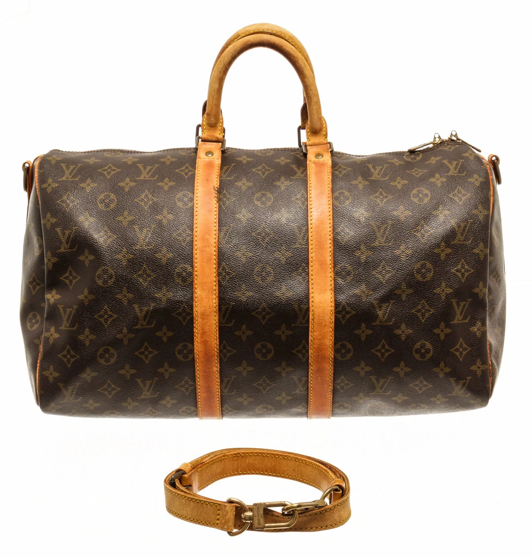 Louis Vuitton Keepall 45 cm Bandouliere duffel bag with monogram coated canvas exterior, contrasting vanchetta leather trims and top handles, brown fabric lining, adjustable and detachable strap, top zipper closure, and gold-tone hardware.