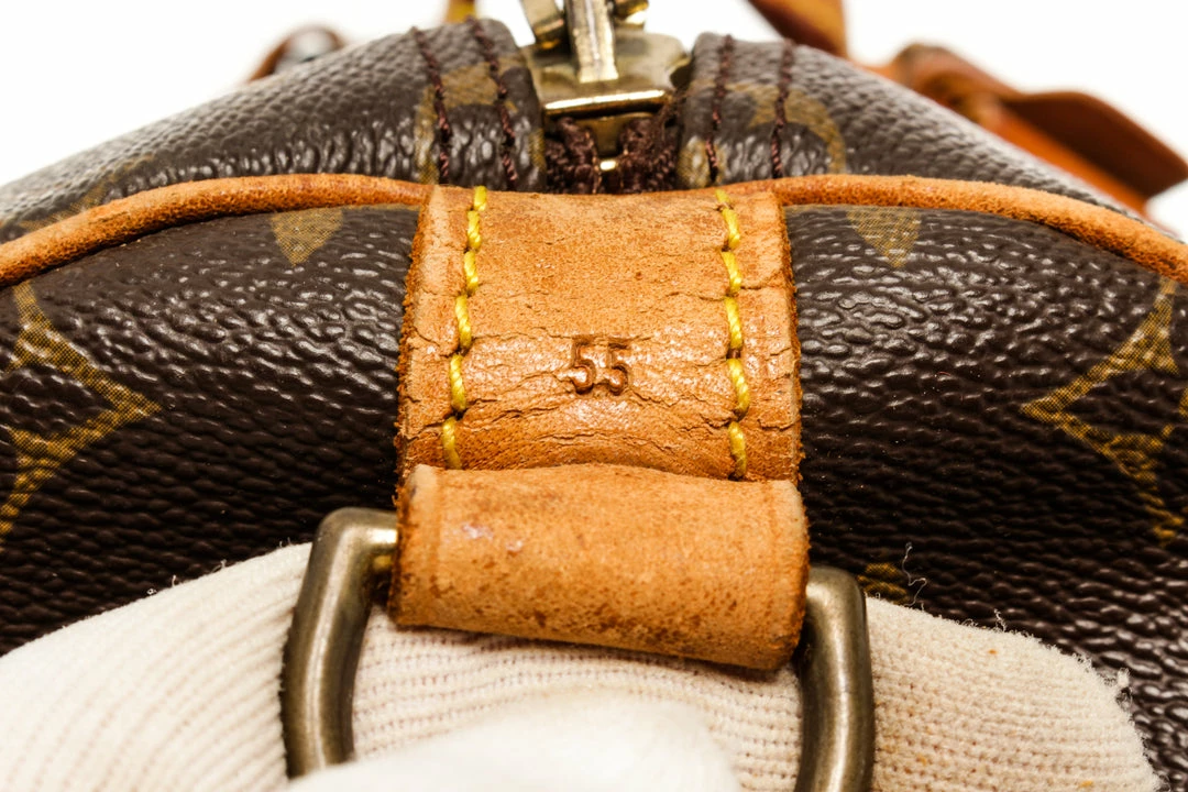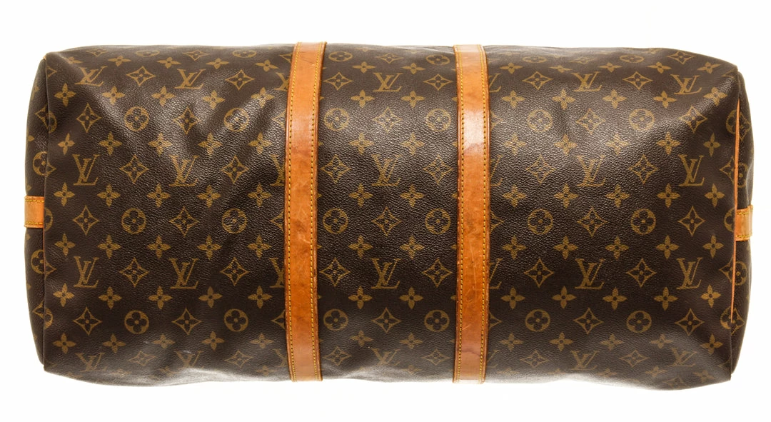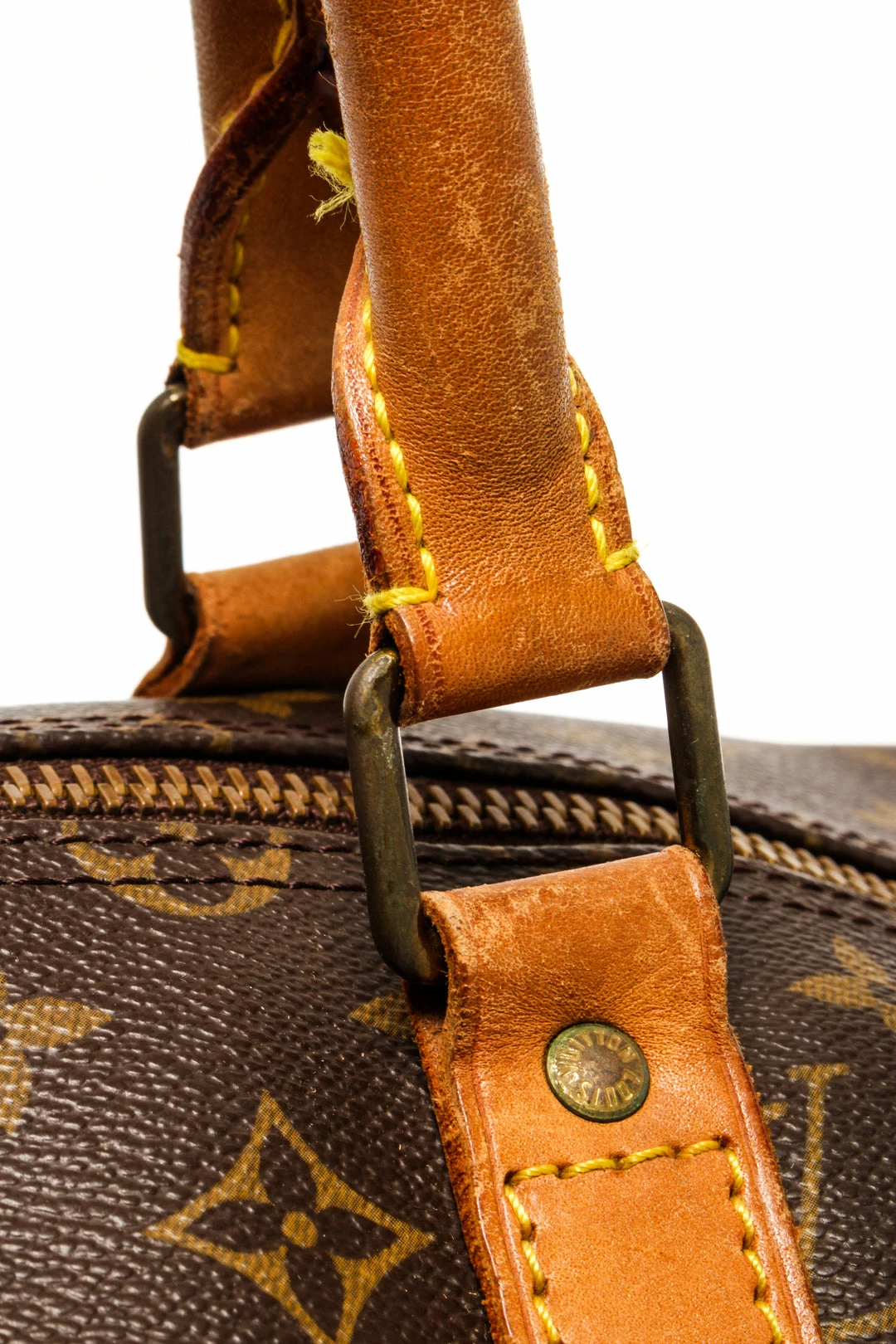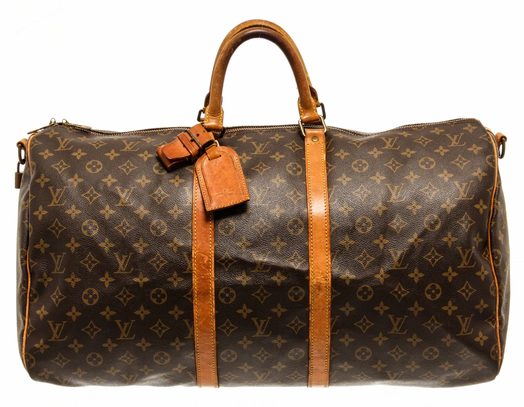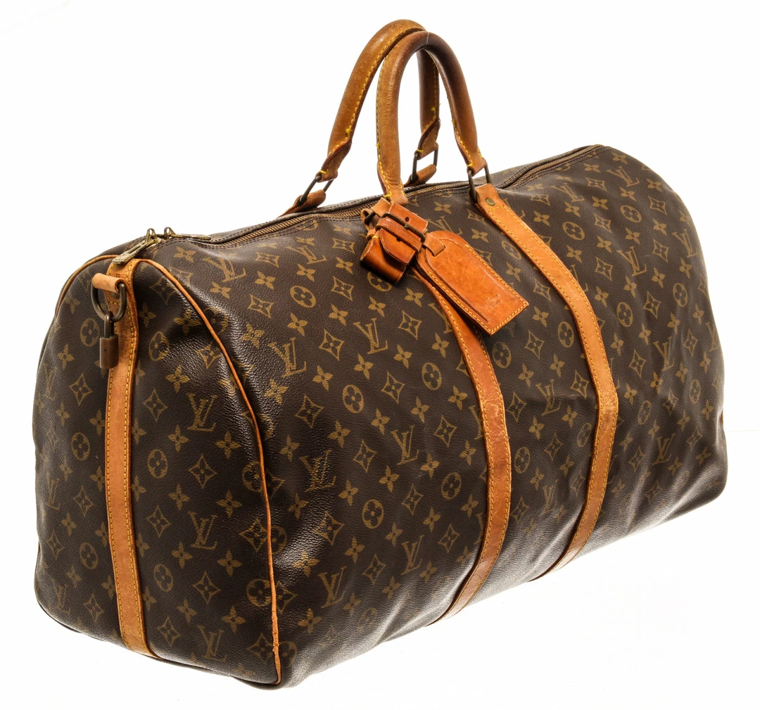 Louis Vuitton Keepall 55 cm duffel bag with monogram coated canvas exterior, contrasting vanchetta leather trims and top handles, top zipper closure, gold-tone hardware, brown fabric lining, and luggage tag.
