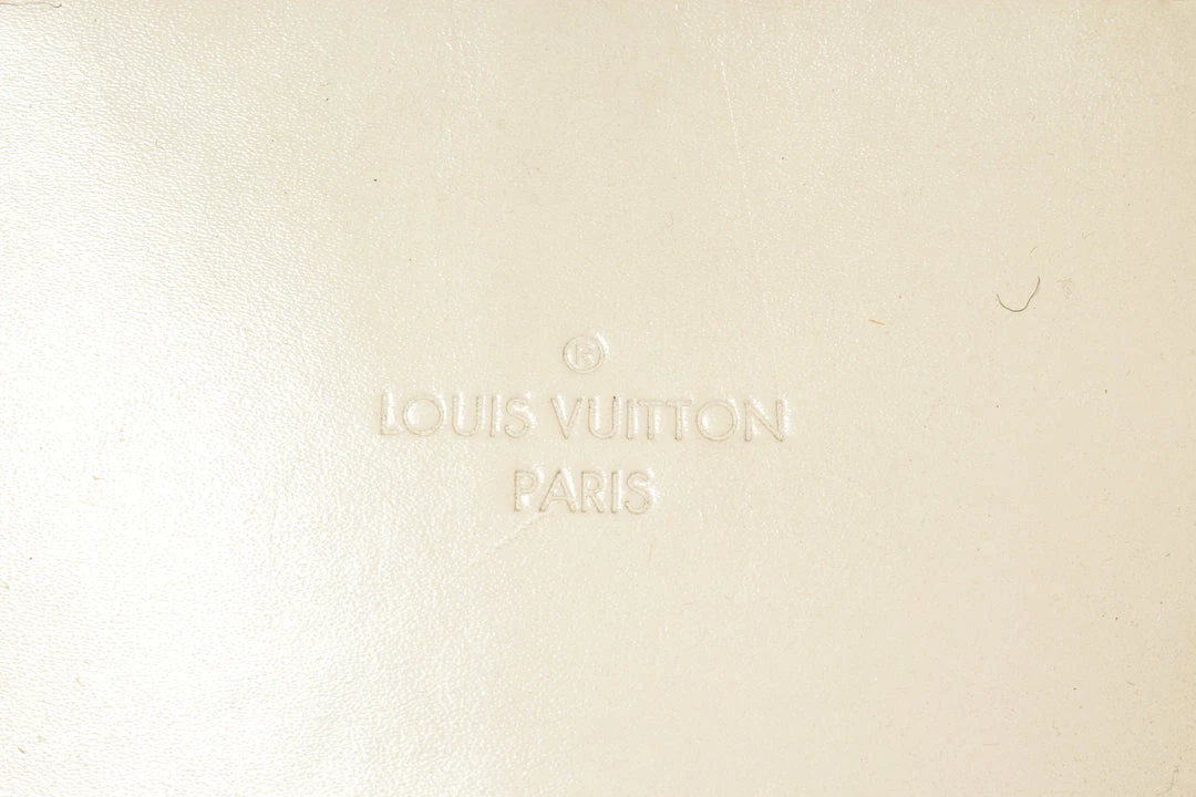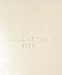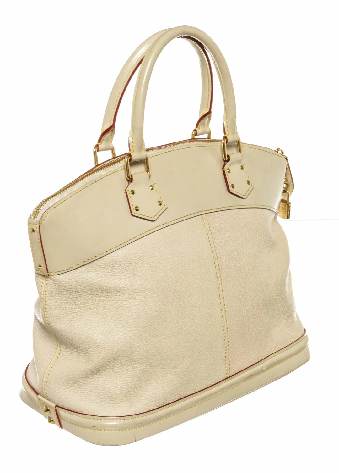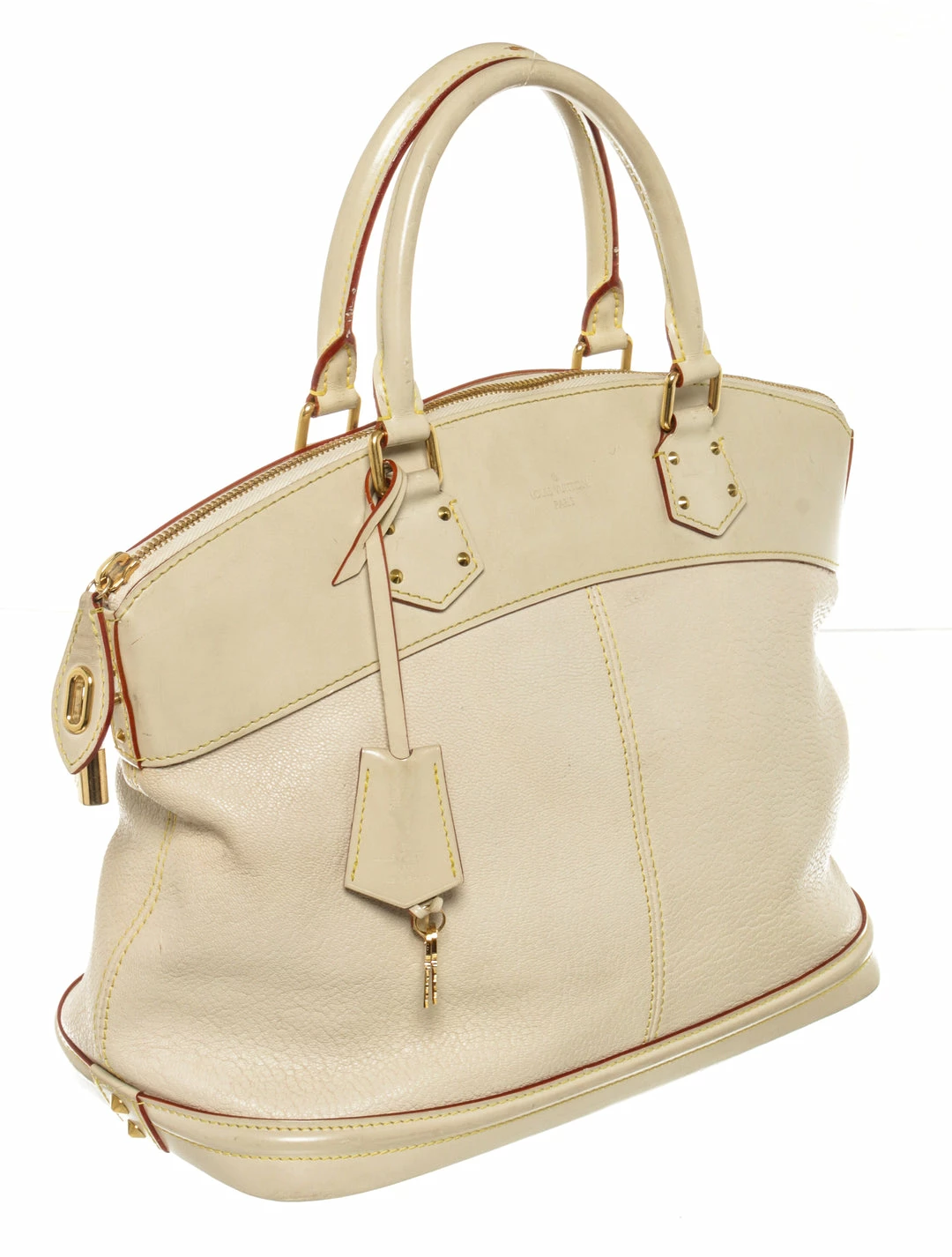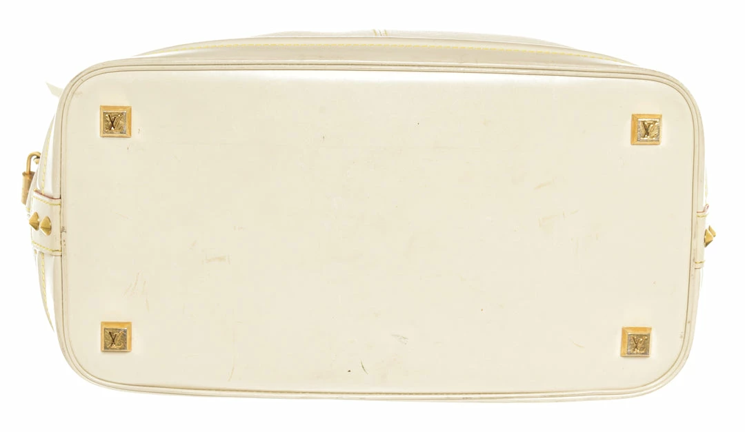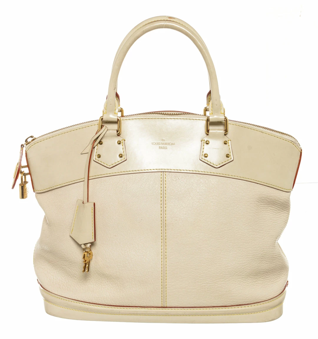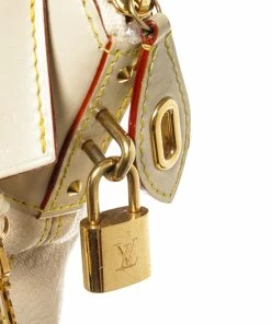Louis Vuitton Lockit White Suhali Leather. Features gold hardware, white leather handles, red leather lining, white canvas interior, and a gold zipper closure.
