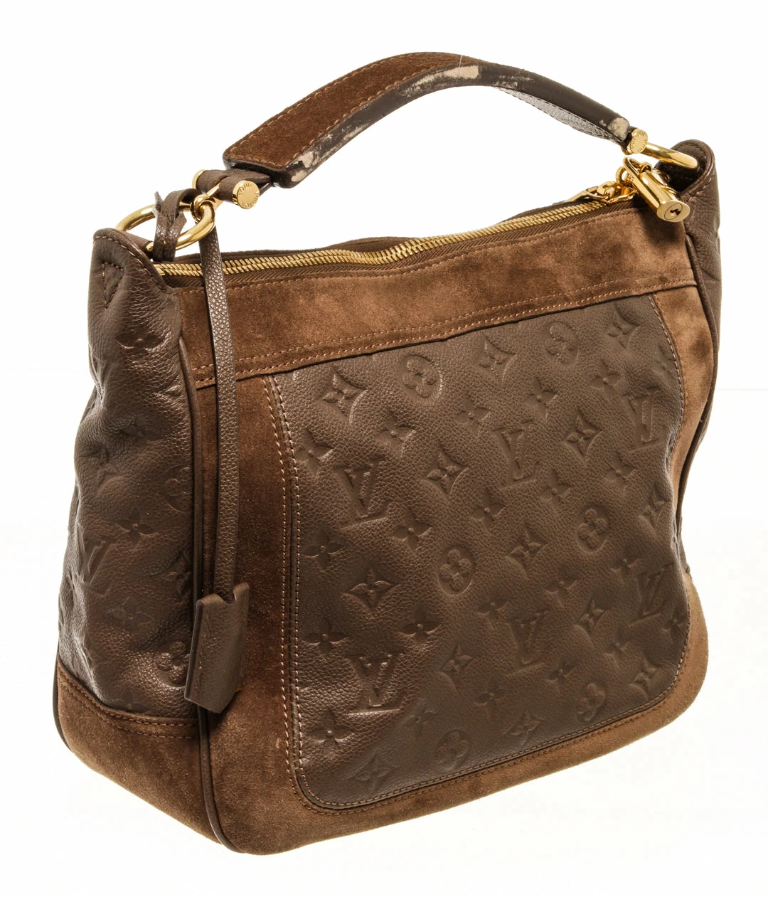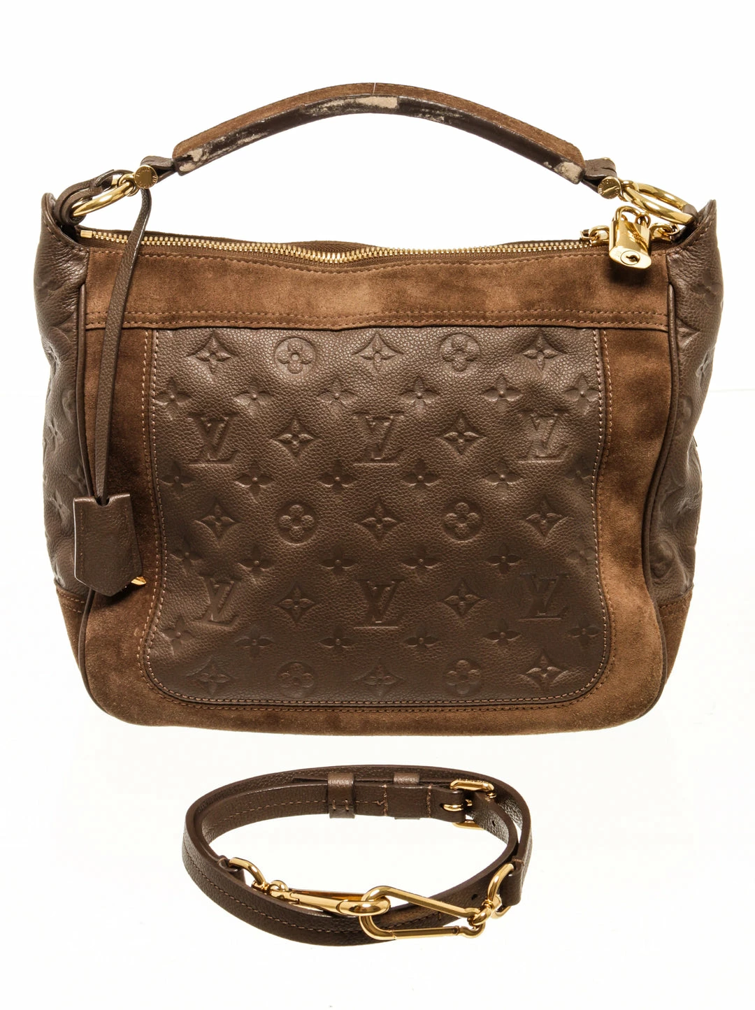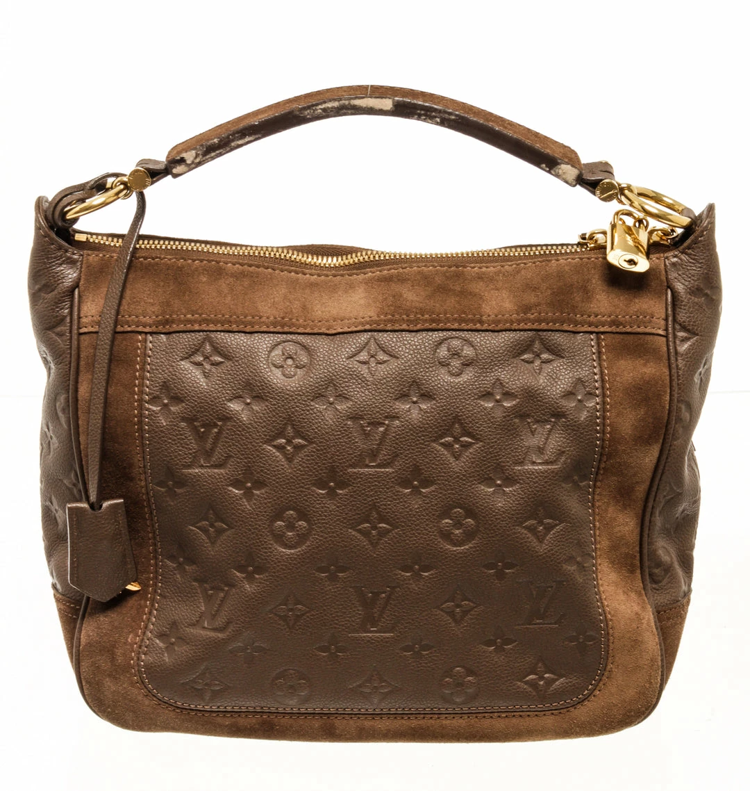 Louis Vuitton monogram brown calfskin Audacieuse handbag with embossed calfskin and brown suede exterior, brown fabric lining, brown leather top handle, adjustable and detachable long strap, gold-tone hardware, and zipper closure.
