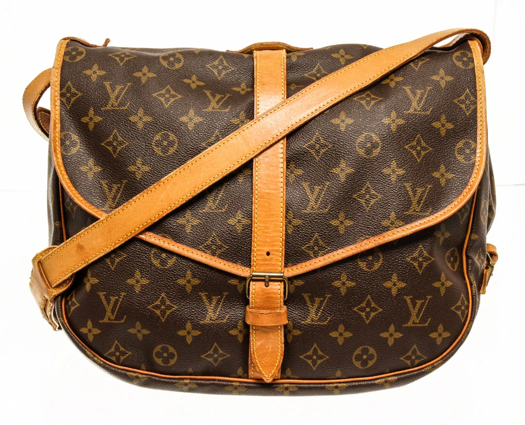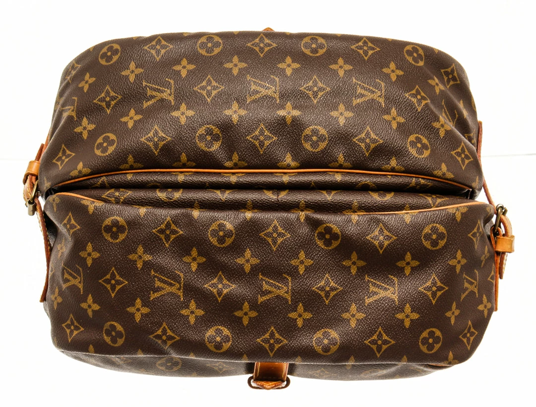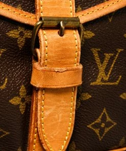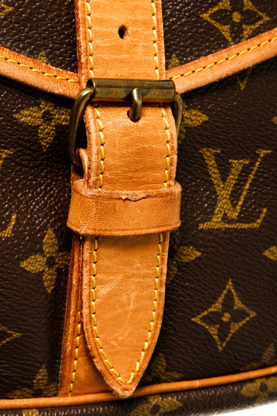 Louis Vuitton Monogram Saumur 35 handbag with coated canvas exterior, brown fabric lining, gold-hardware, contrasting vachetta leather trims and adjustable straps, flap and buckle closure, and two main compartments on each side.