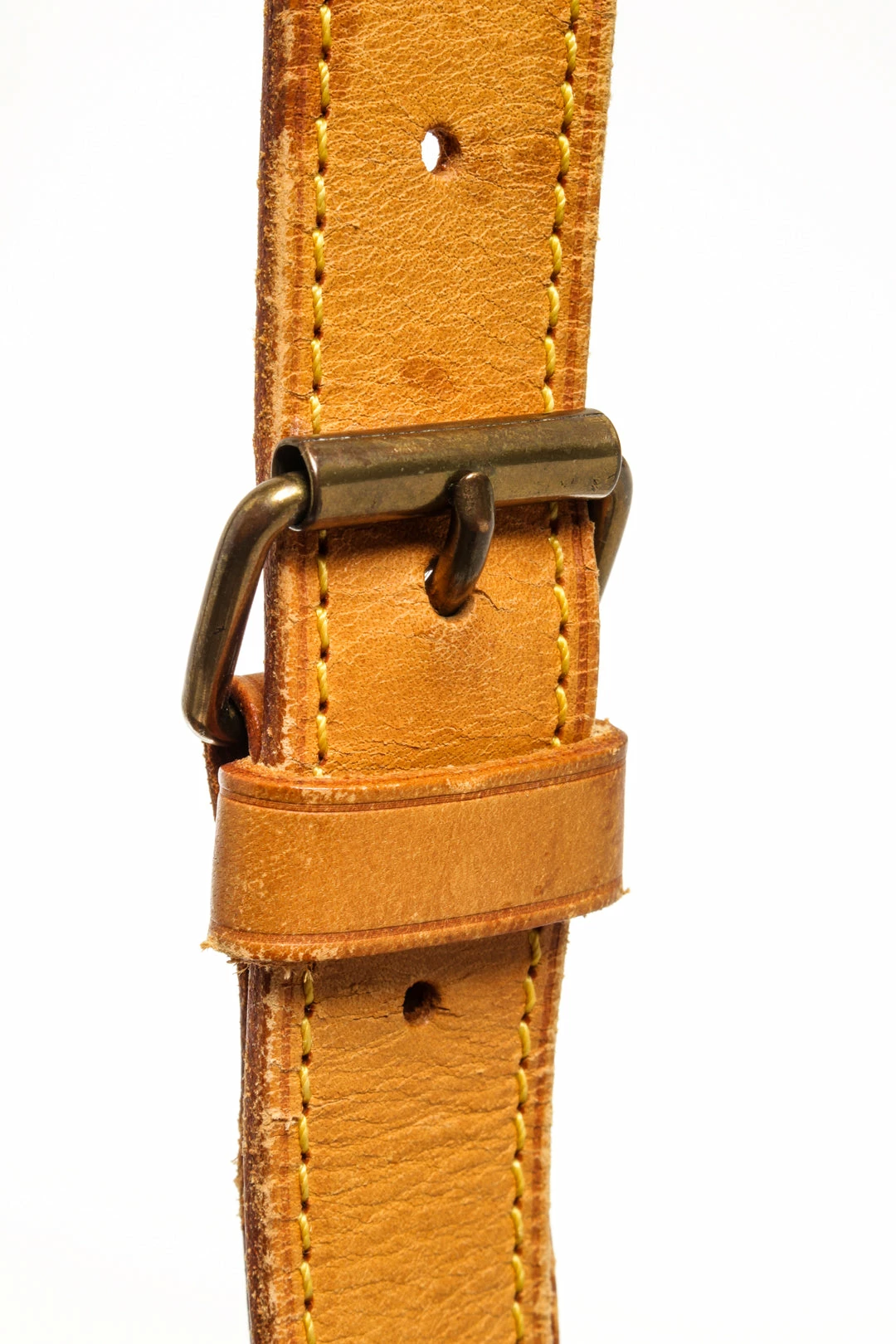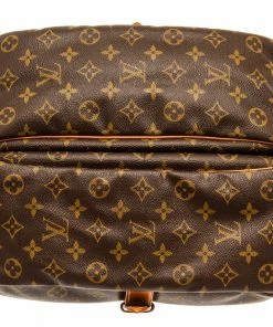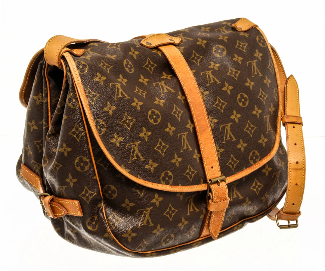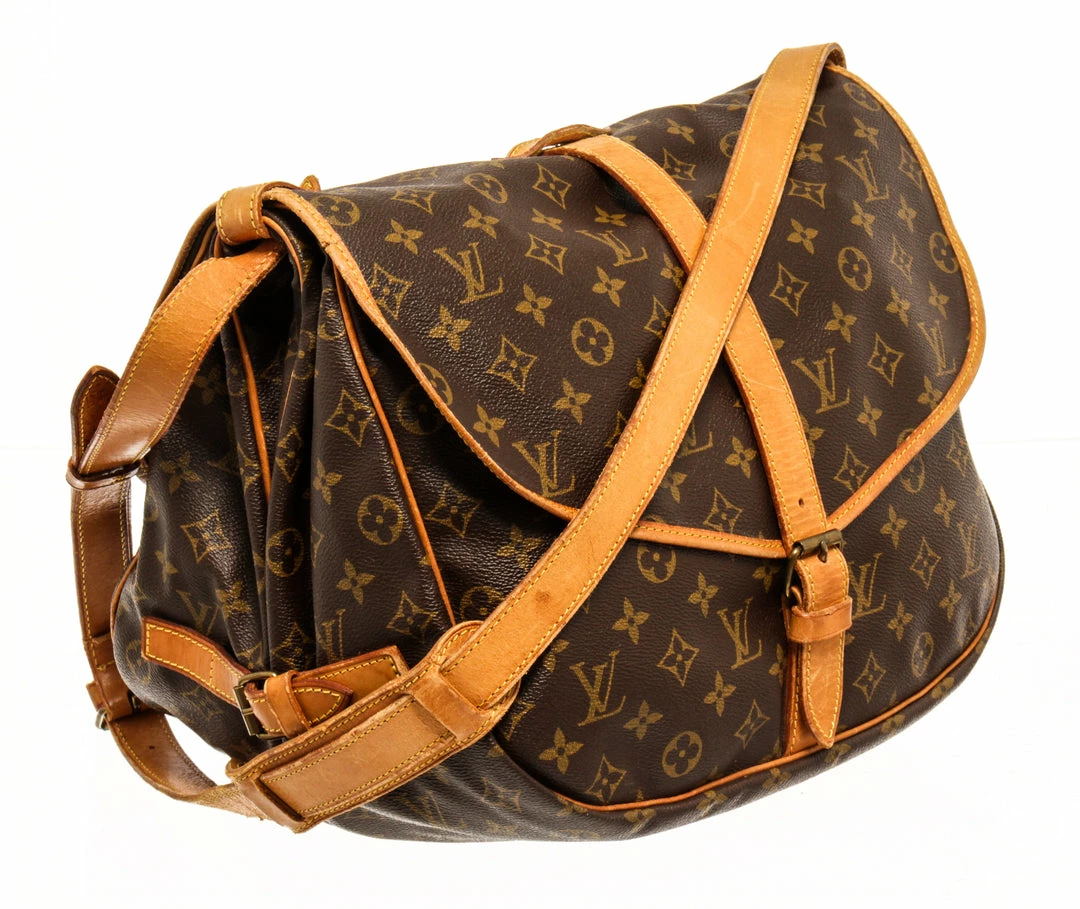 Louis Vuitton Monogram Saumur 35 handbag with coated canvas exterior, brown fabric lining, gold-hardware, contrasting vachetta leather trims and adjustable straps, flap and buckle closure, and two main compartments on each side.