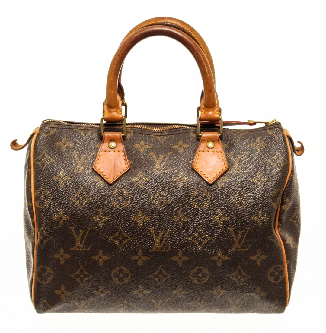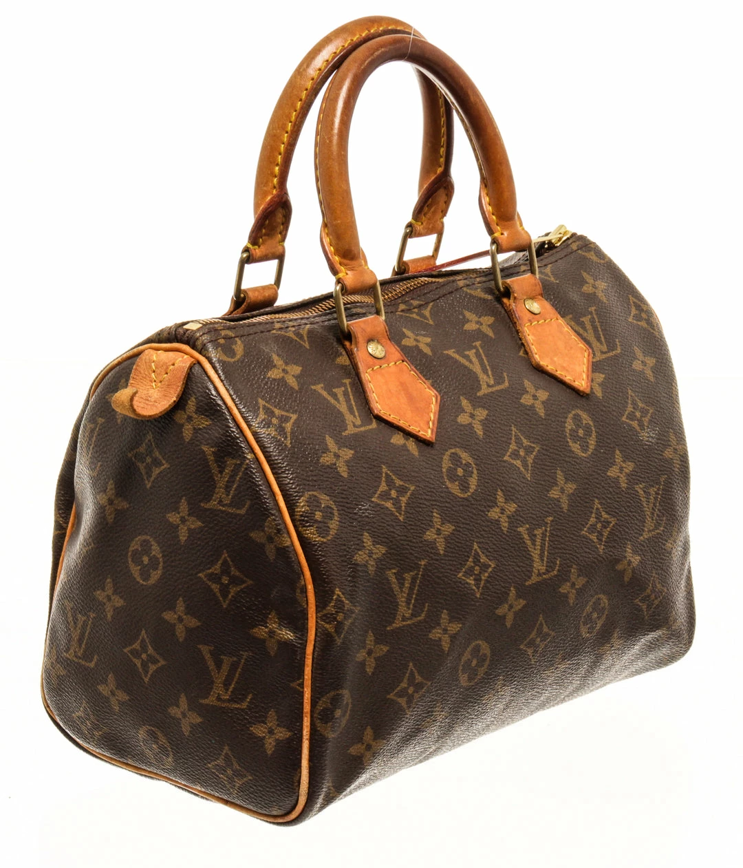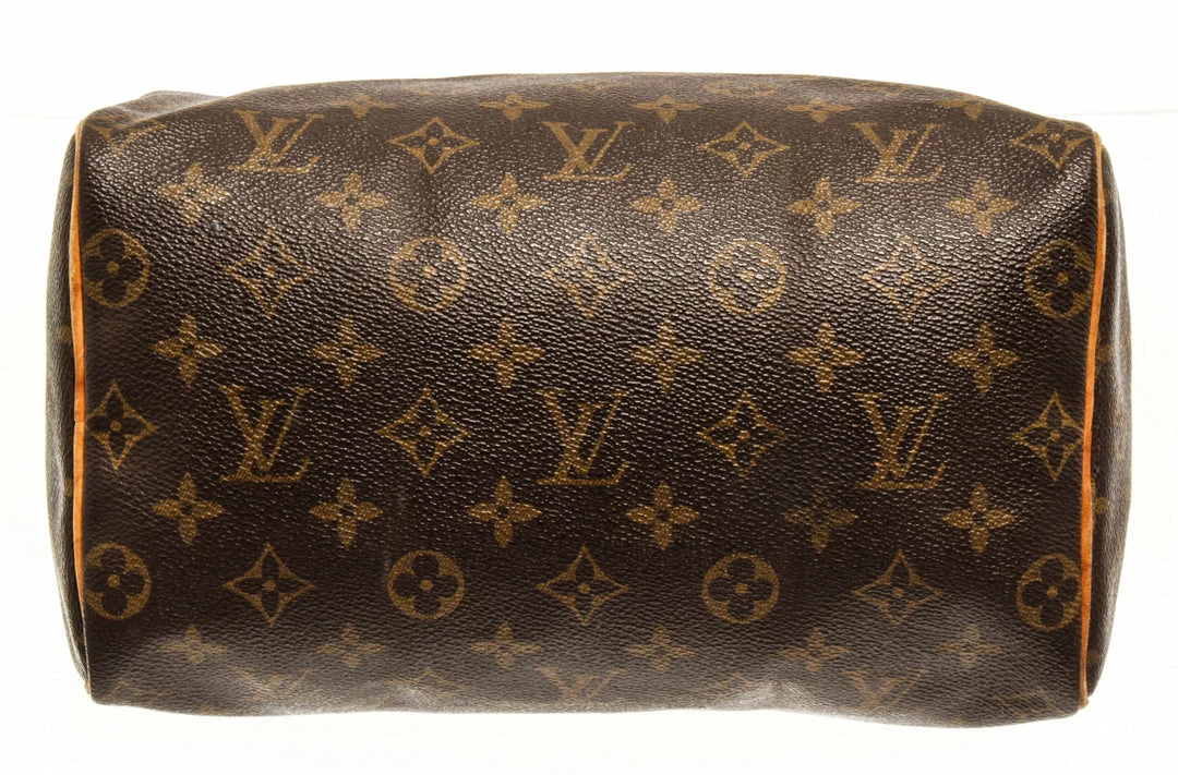 Louis Vuitton Monogram Speedy 25 handbag with coated canvas exterior, brown fabric lining, contrasting vachetta leather top handles and trims, gold-tone hardware, zipper closure, and one main compartment with one slip pocket. There is some where on the item please refer to the photos!