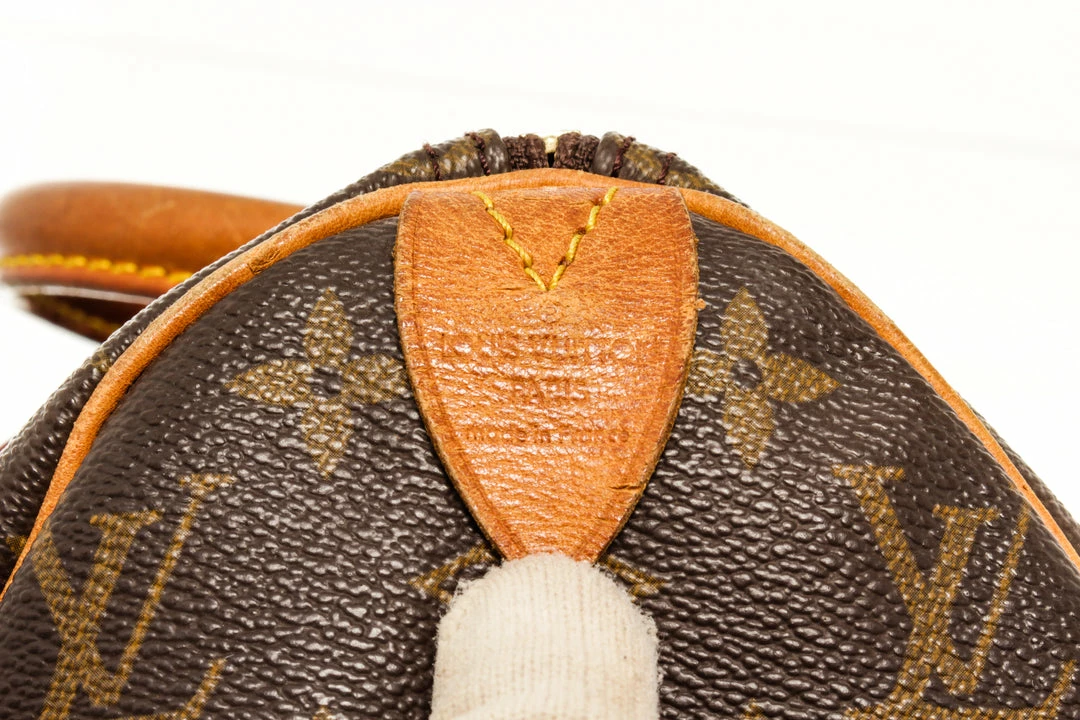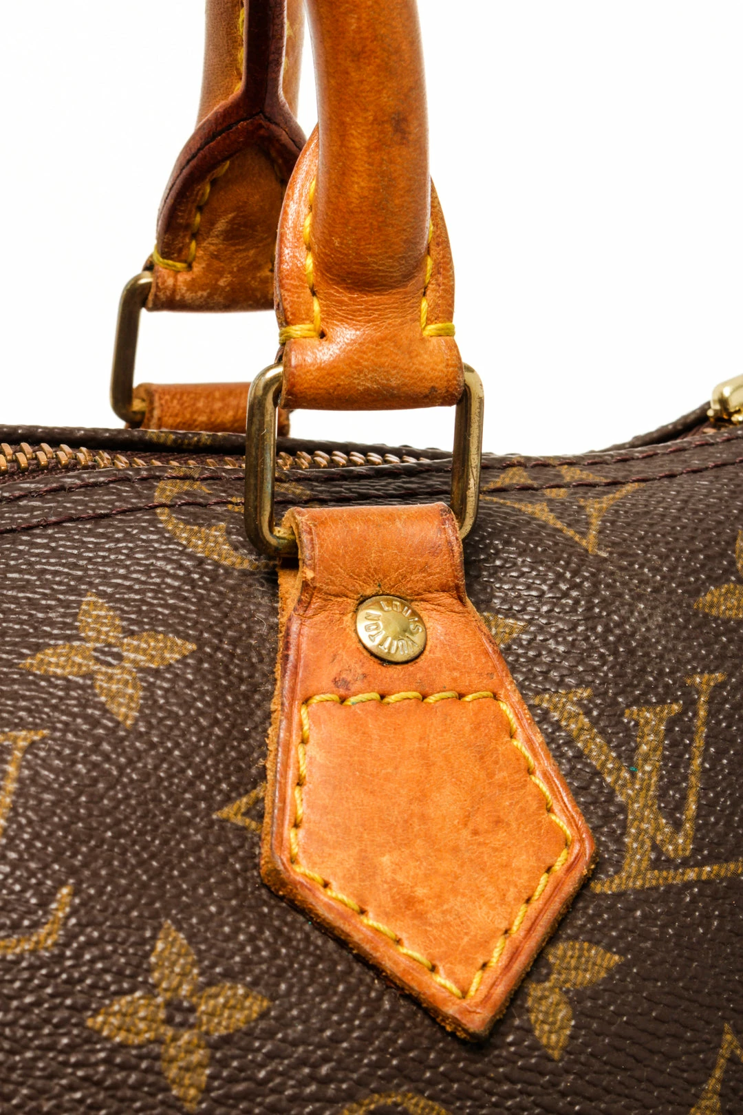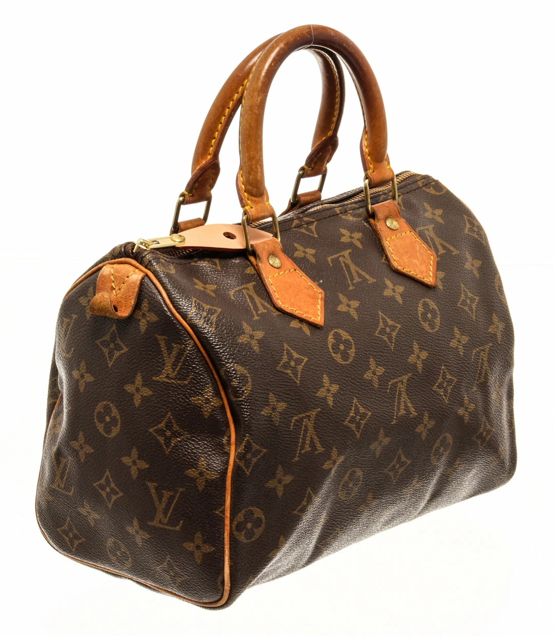Louis Vuitton Monogram Speedy 25 handbag with coated canvas exterior, brown fabric lining, contrasting vachetta leather top handles and trims, gold-tone hardware, zipper closure, and one main compartment with one slip pocket. There is some where on the item please refer to the photos!