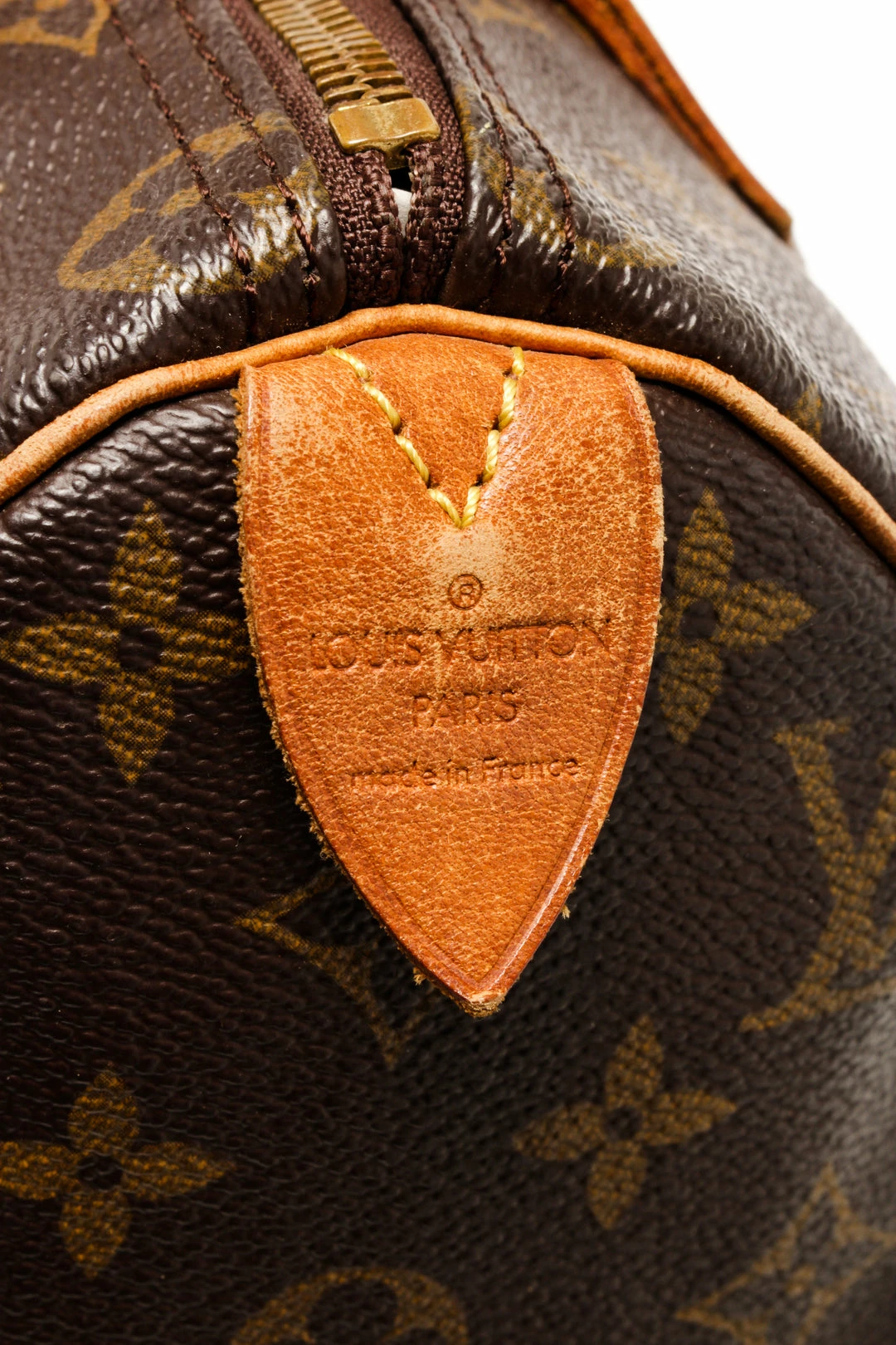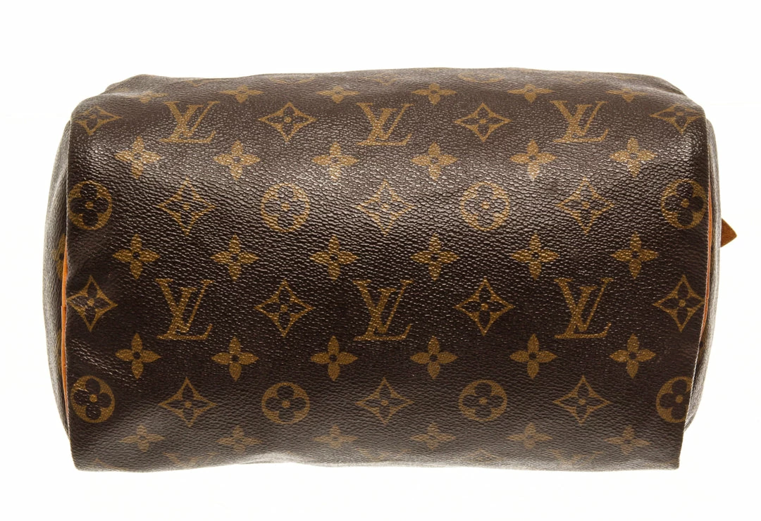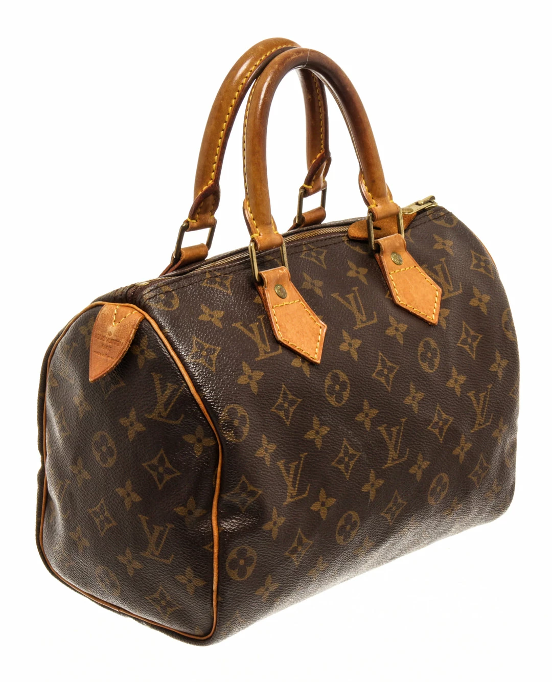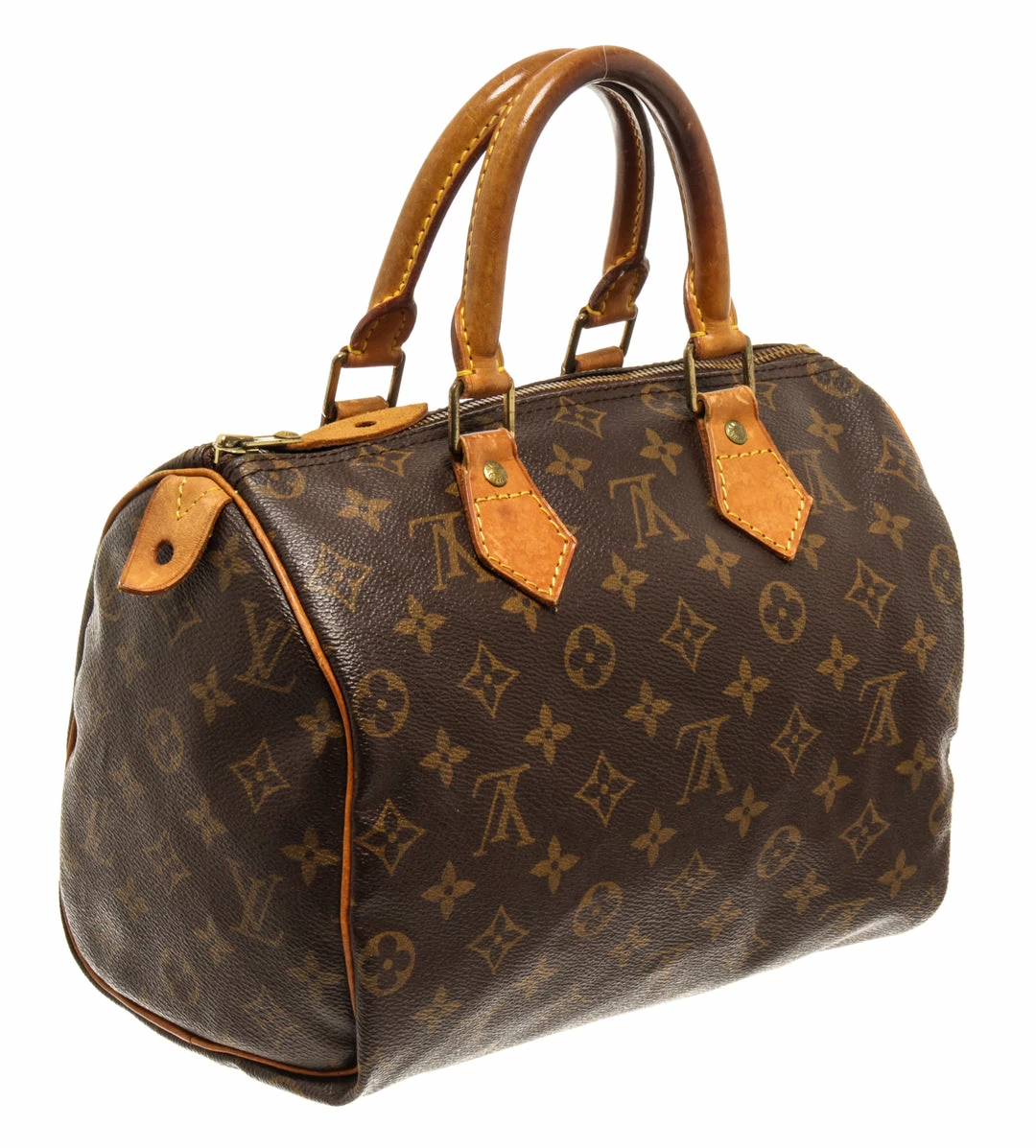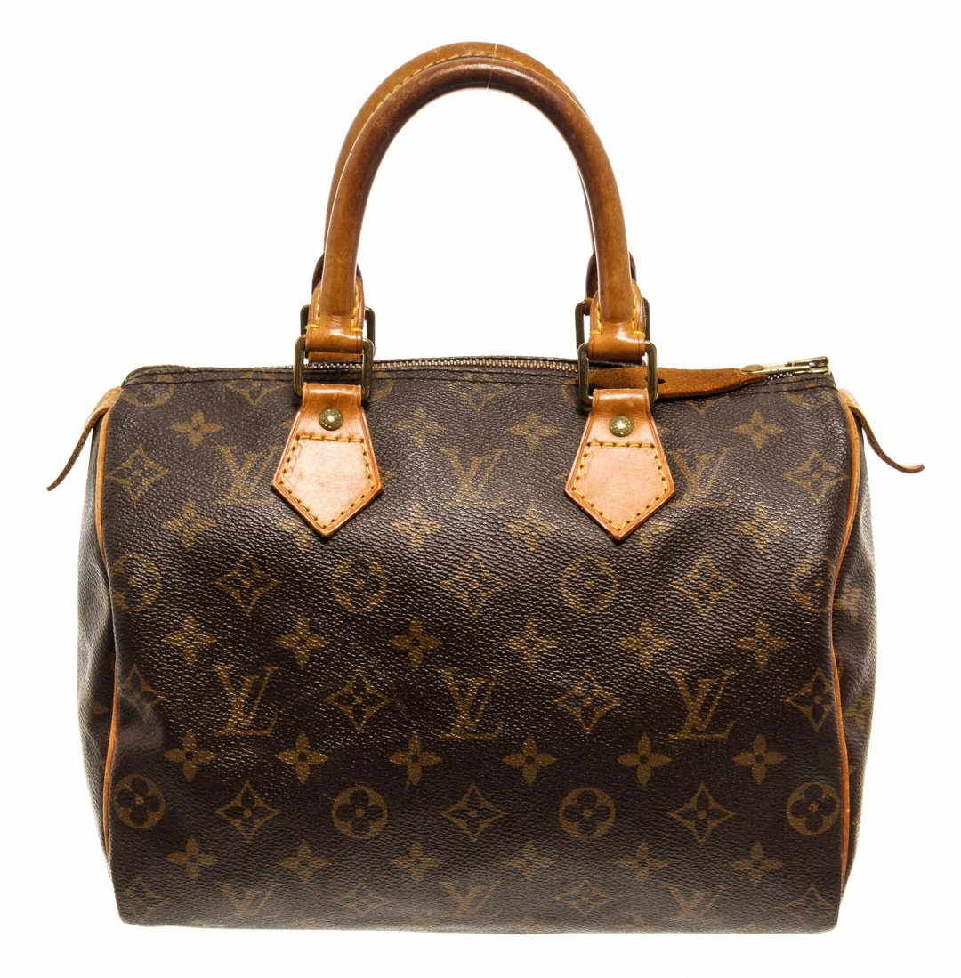 Louis Vuitton Monogram Speedy 25 handbag with coated canvas exterior, brown fabric lining, contrasting vachetta leather top handle, gold-tone hardware, zipper closure, one main compartment with one slip pocket.