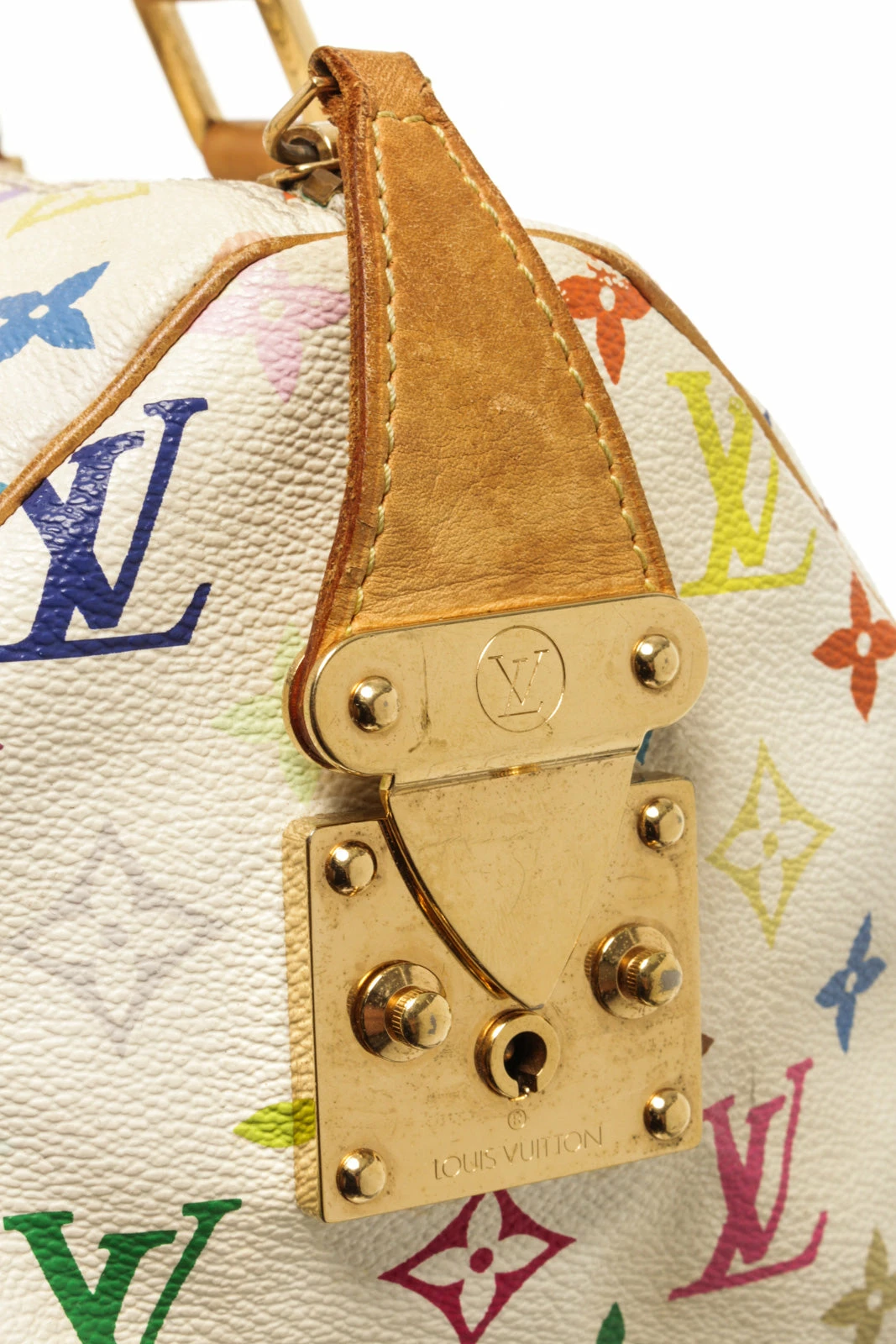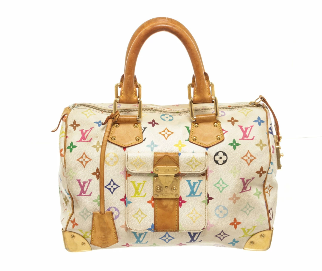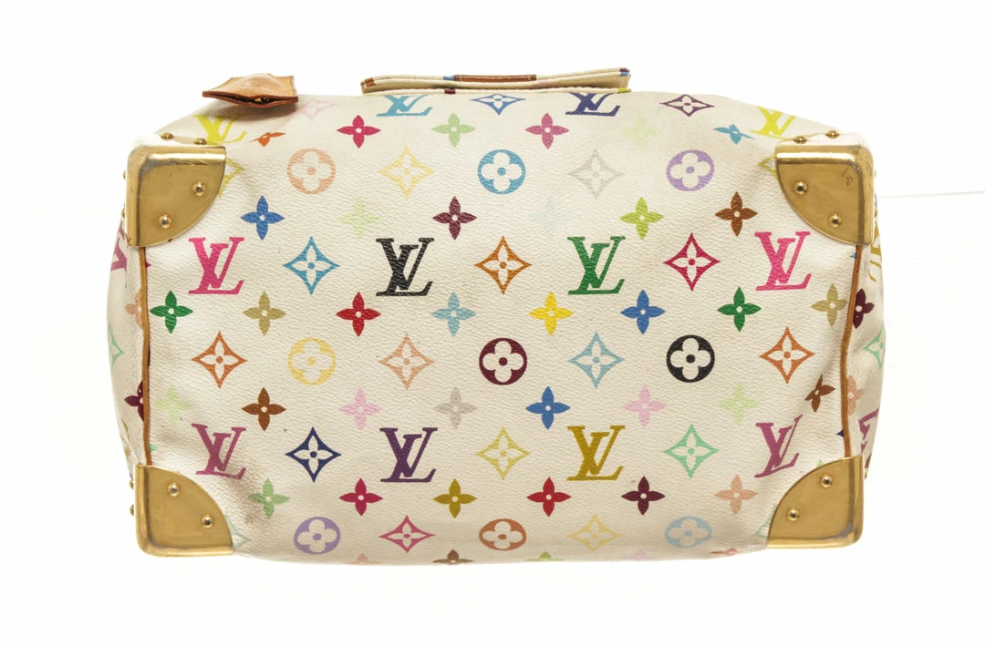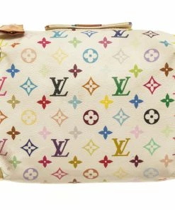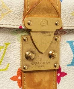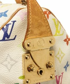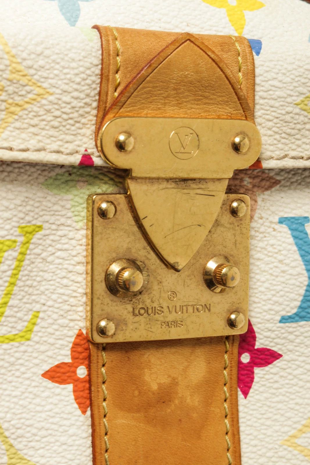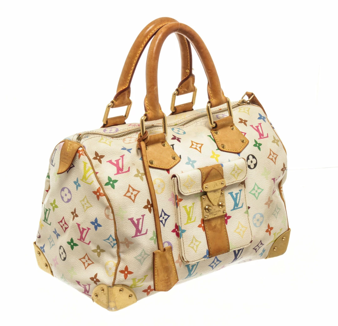 White on bag is worn and discolored, vachetta is stained, hardware is scratched. Please refer to photos.