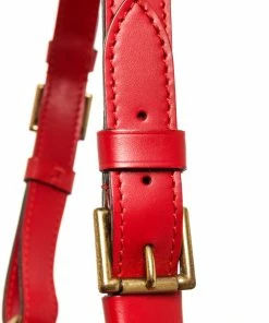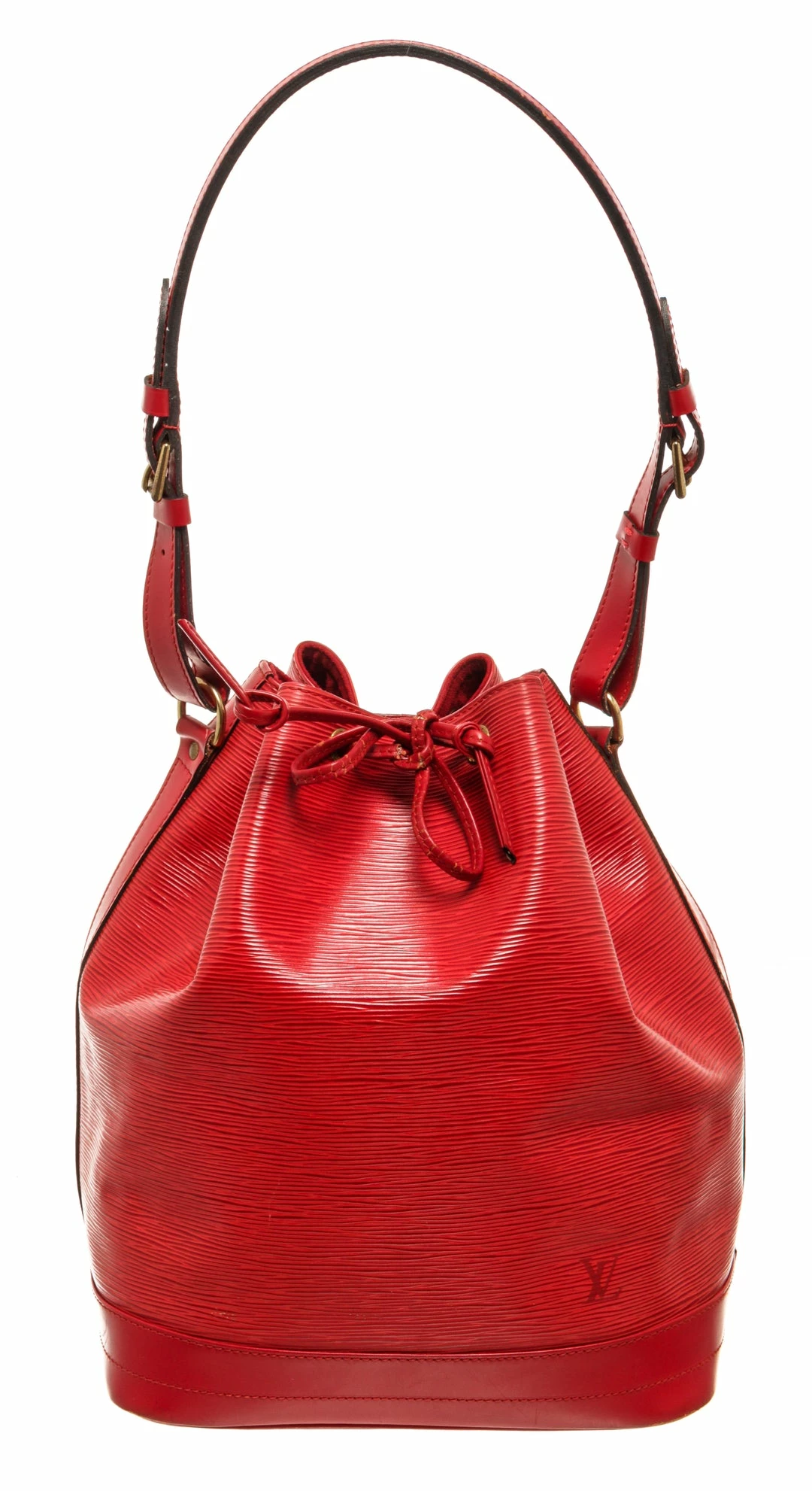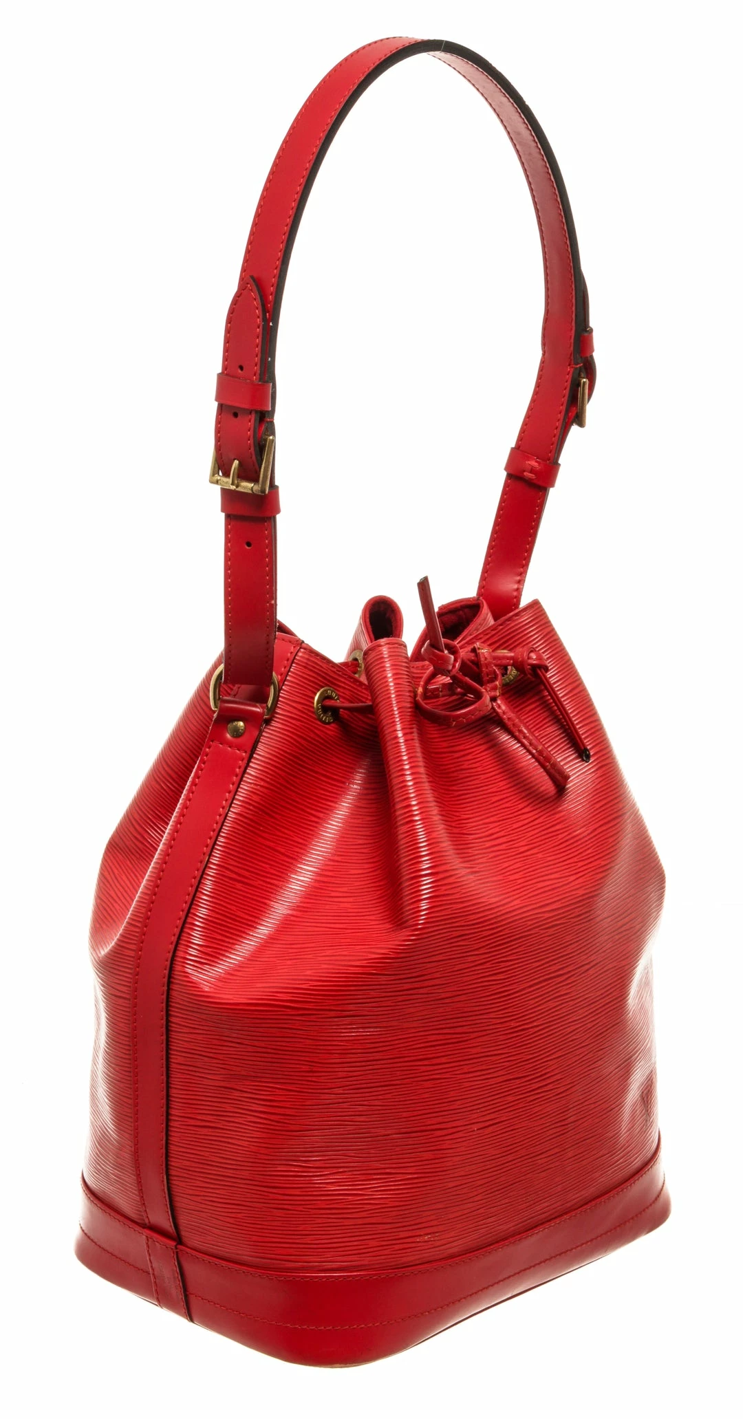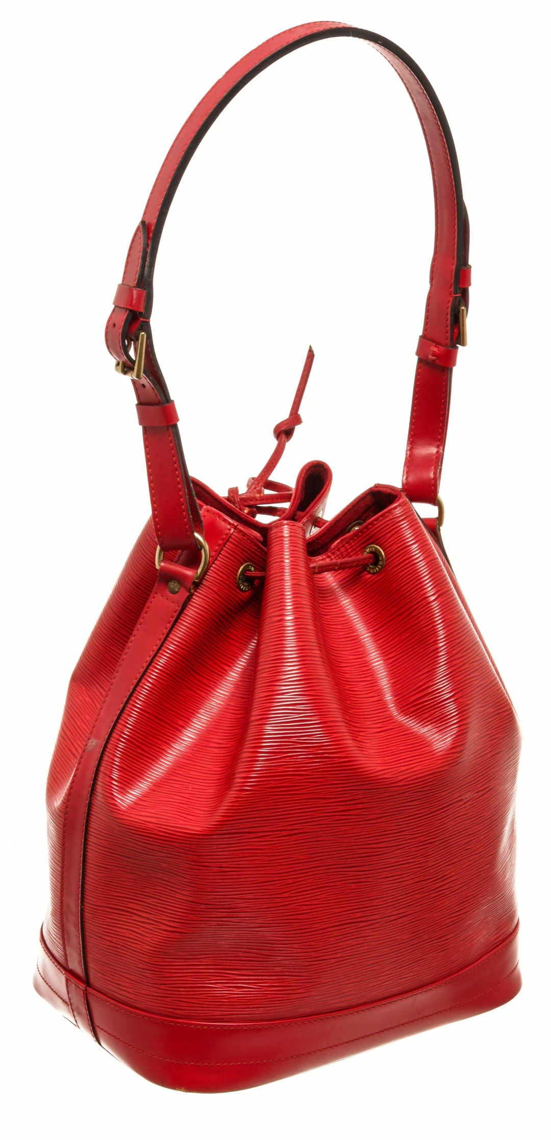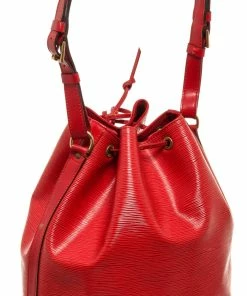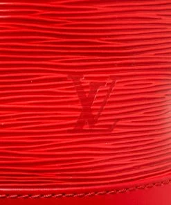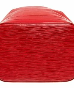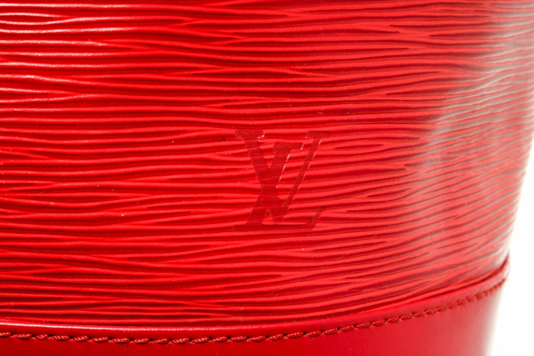 Louis Vuitton Red Epi Leather Petit Noe Bag with gold-tone hardware, red leather trim, red suede lining, single adjustable leather shoulder strap, and drawstring closure.