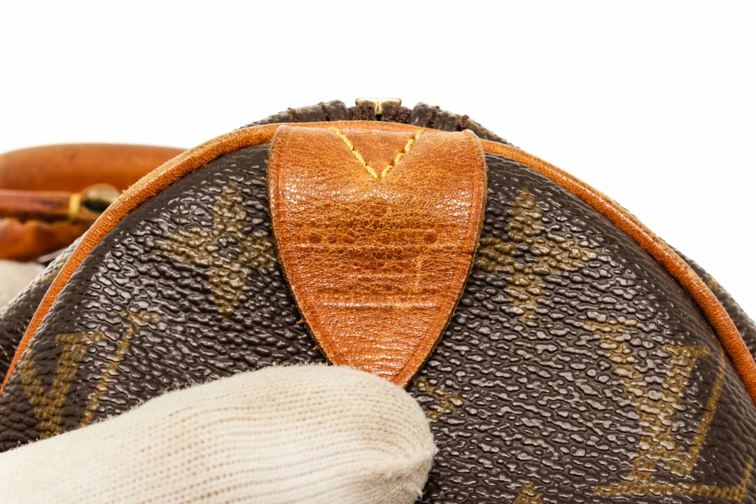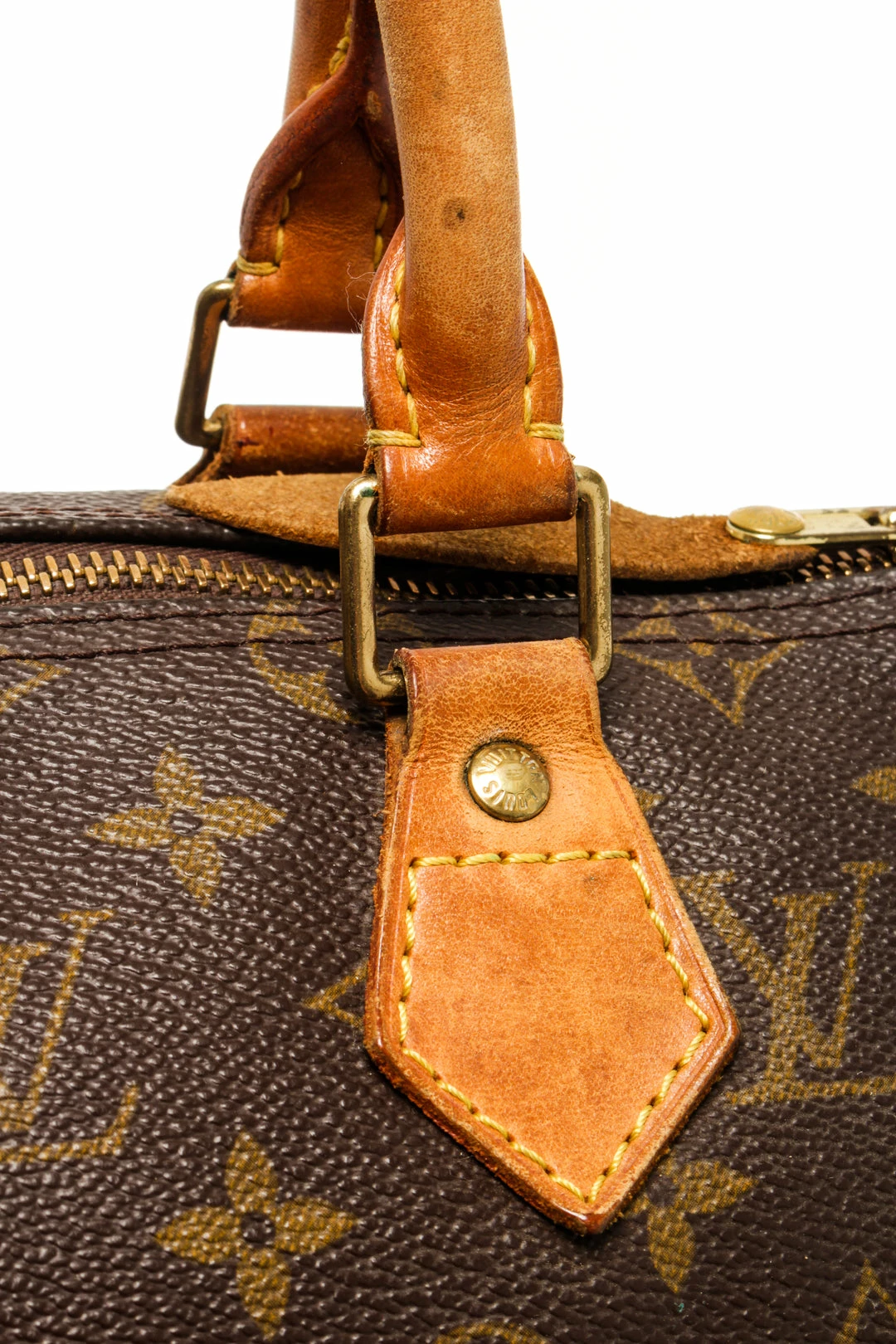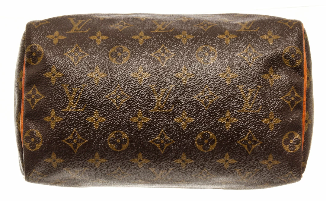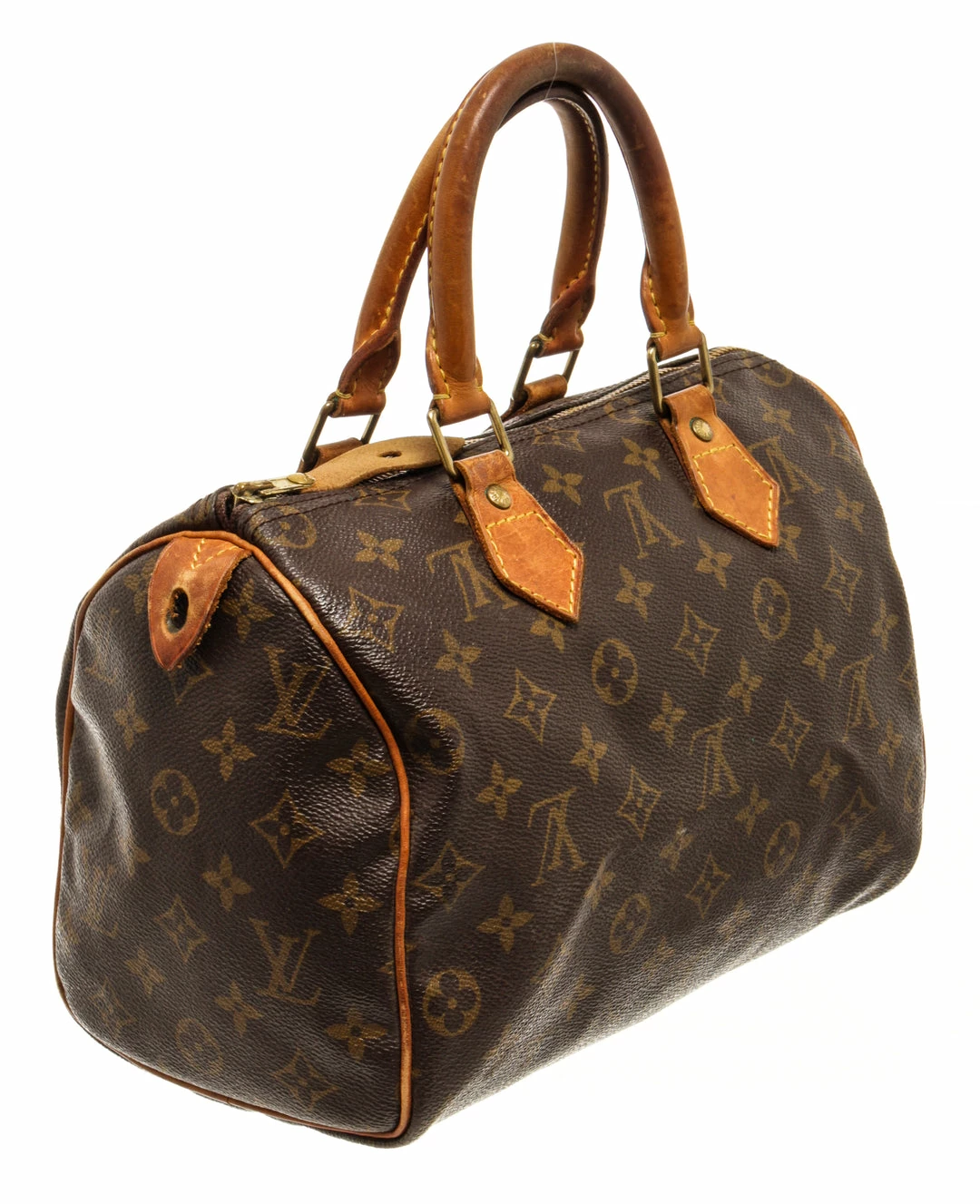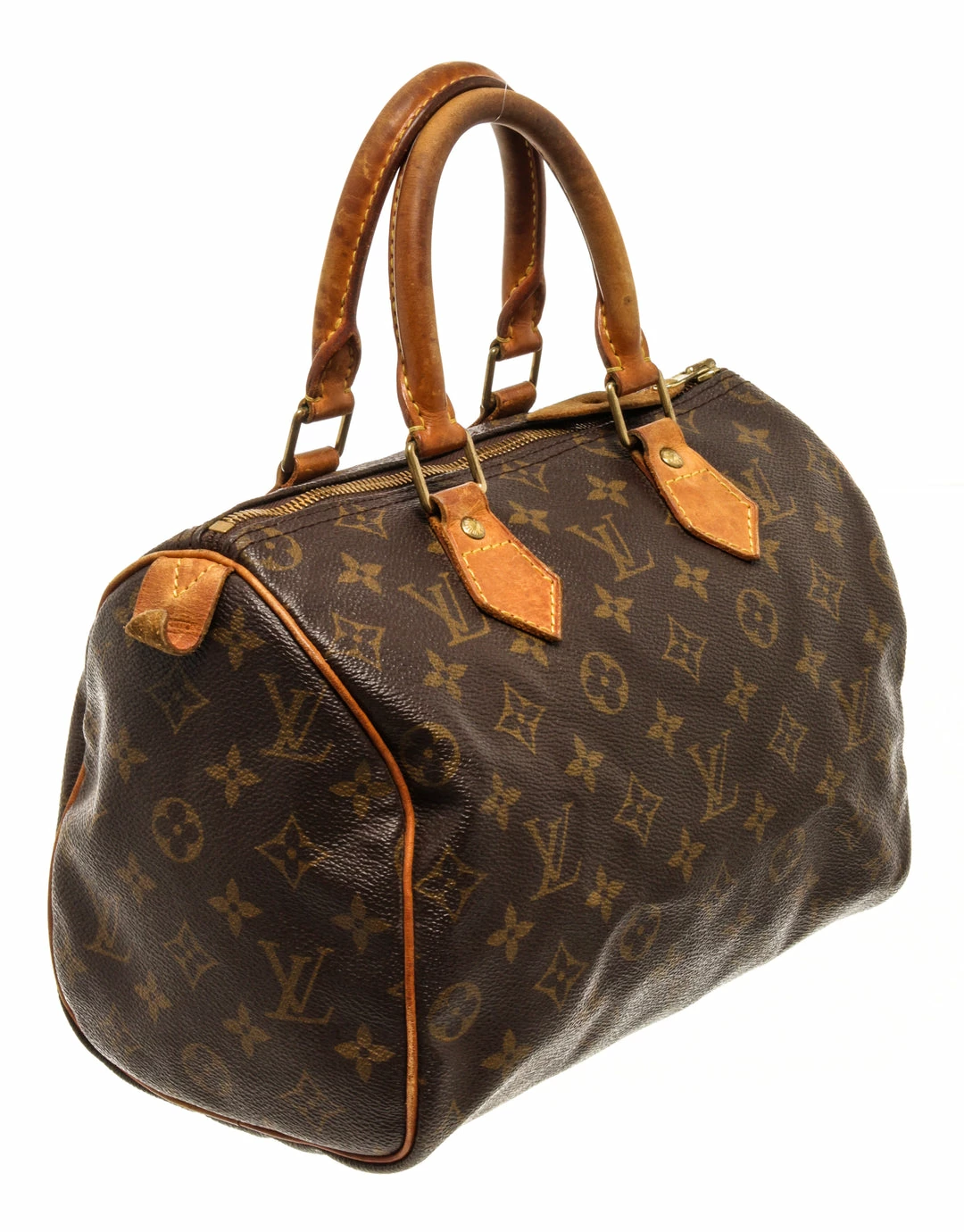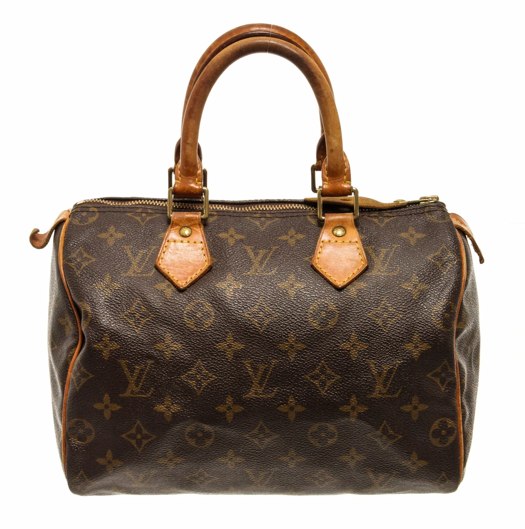 Louis Vuitton Speedy 25 cm handbag with monogram coated canvas exterior, vanchetta leather top handles, brown fabric lining, one interior slip pocket, top zip closure, and gold-toned hardware.