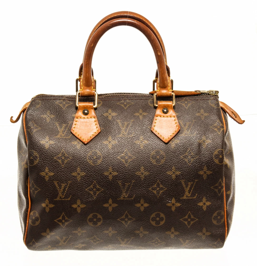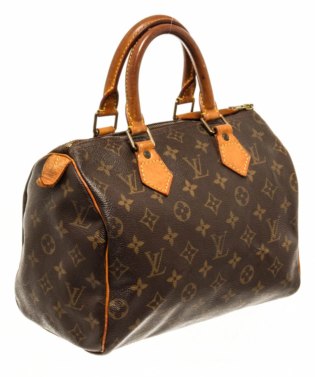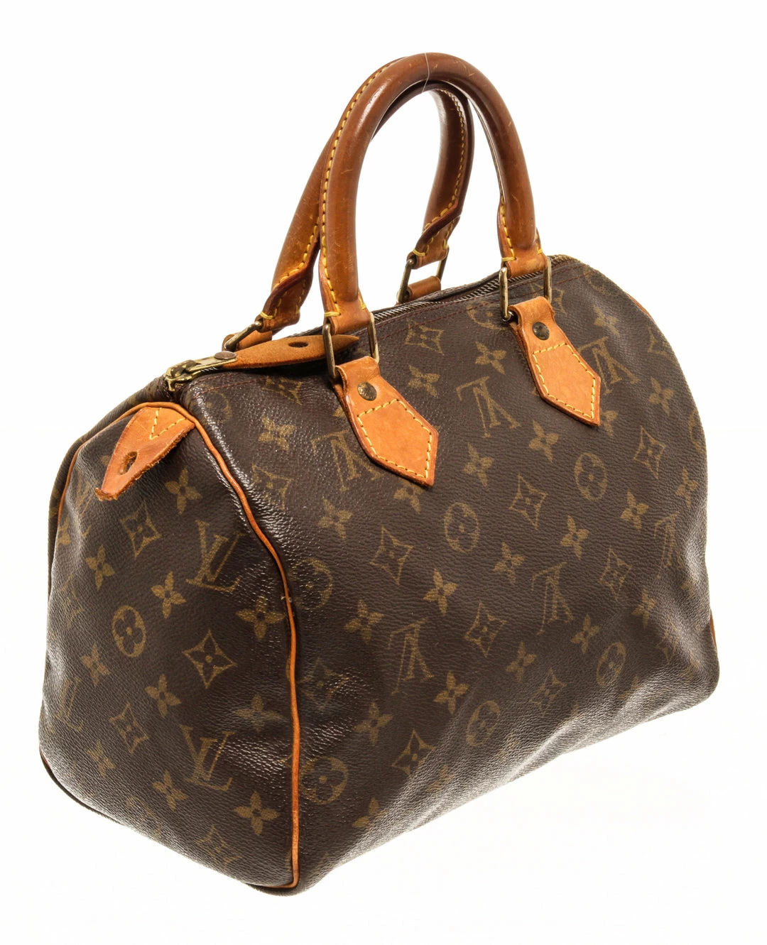 Louis Vuitton Speedy 25 handbag with coated canvas exterior, brown fabric lining, contrasting vachetta leather trims and top handles, gold-tone hardware, zipper closure, and one main compartment with one slip pocket.