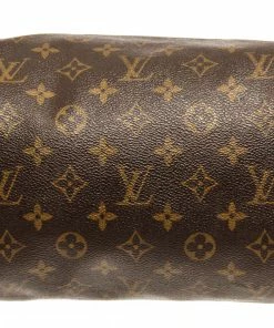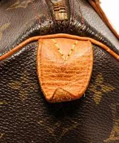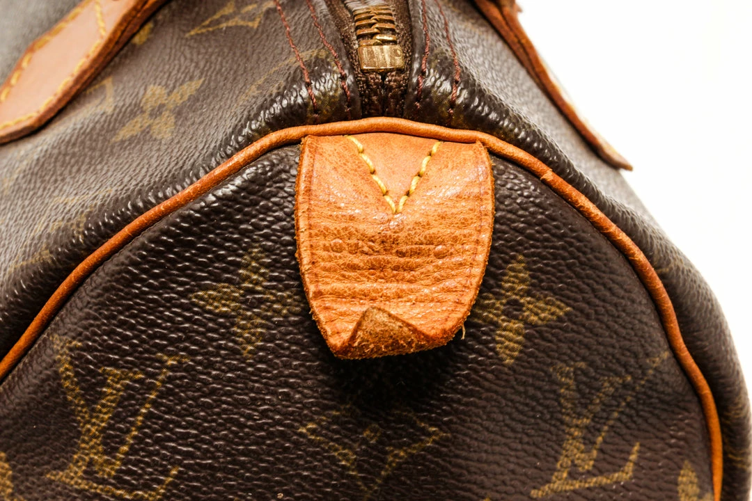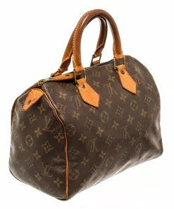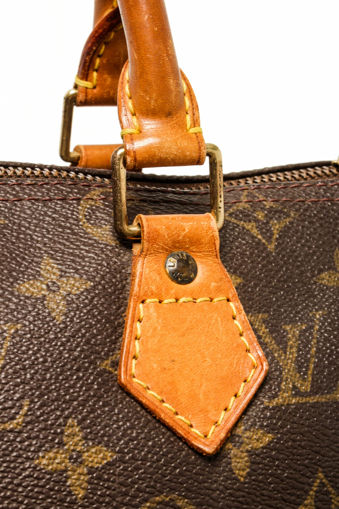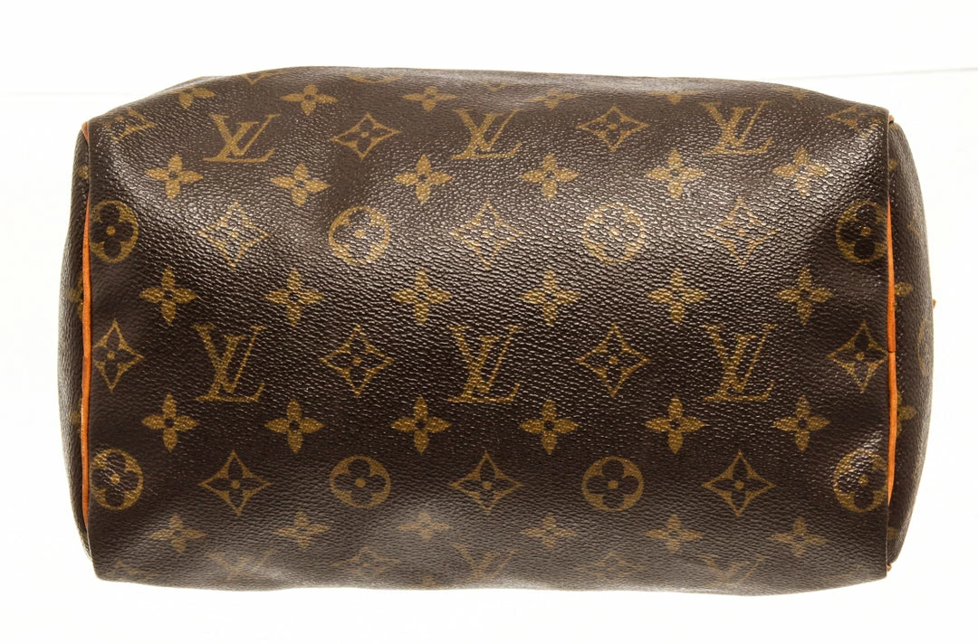 Louis Vuitton Speedy 25 handbag with coated canvas exterior, brown fabric lining, contrasting vachetta leather trims and top handles, gold-tone hardware, zipper closure, and one main compartment with one slip pocket.