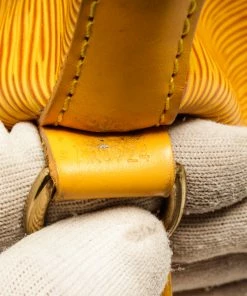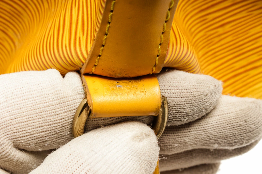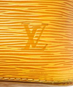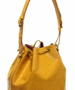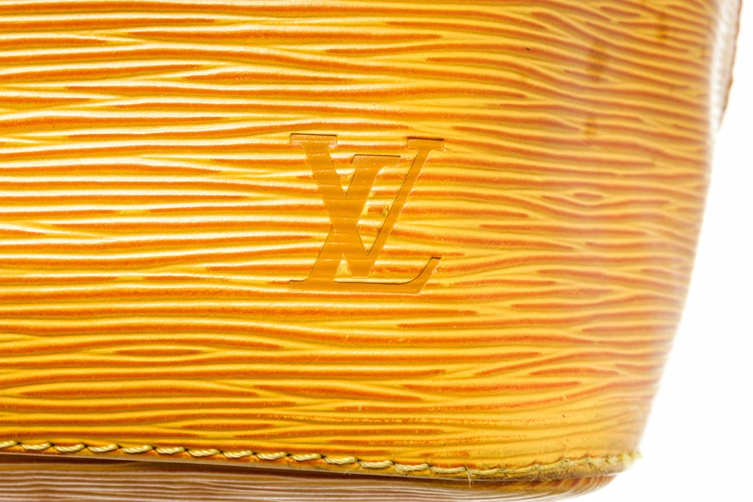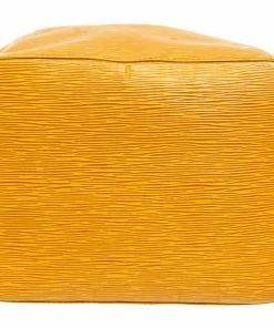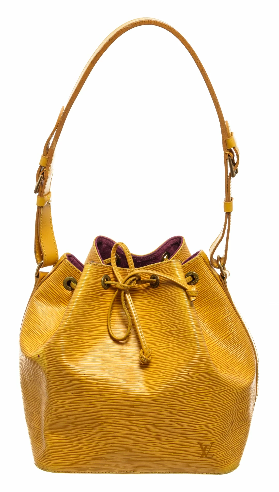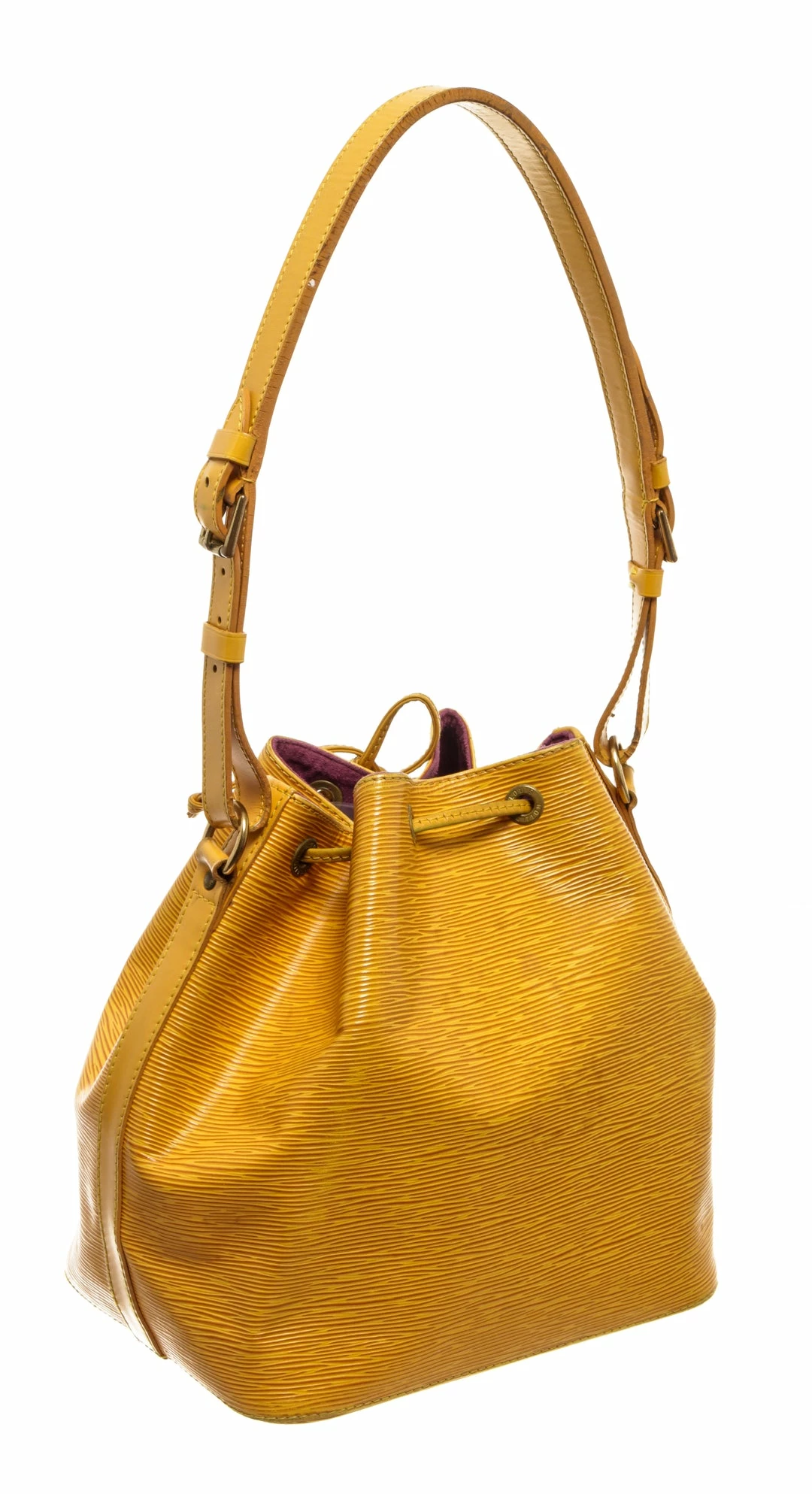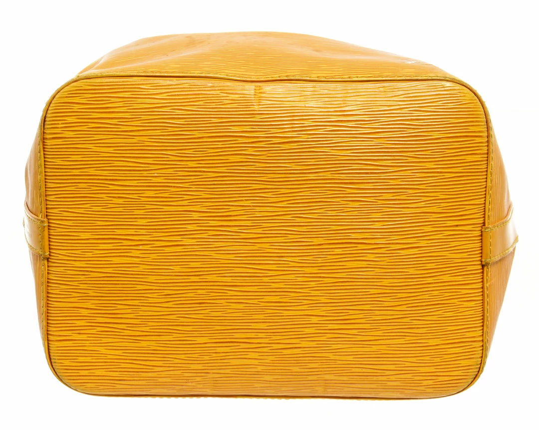 Yellow Epi leather Louis Vuitton Noe PM with gold-tone hardware, adjustable flat shoulder strap, fuchsia Alcantara lining and drawstring closure at top.